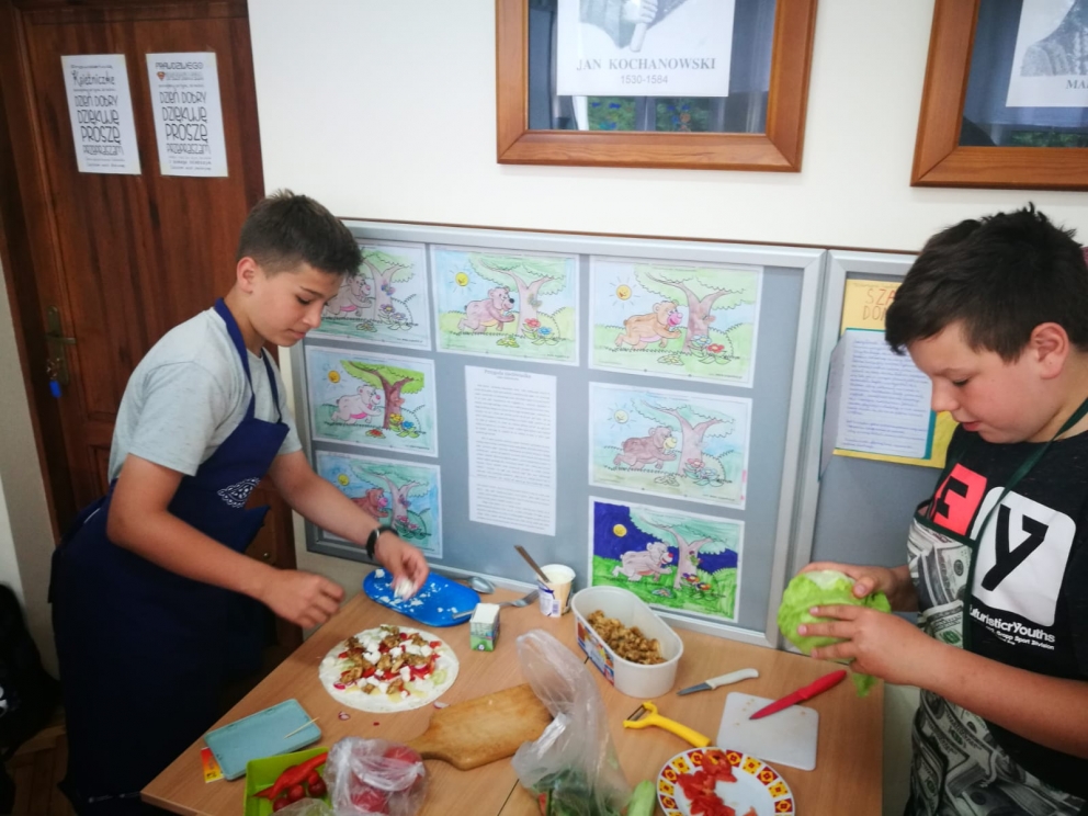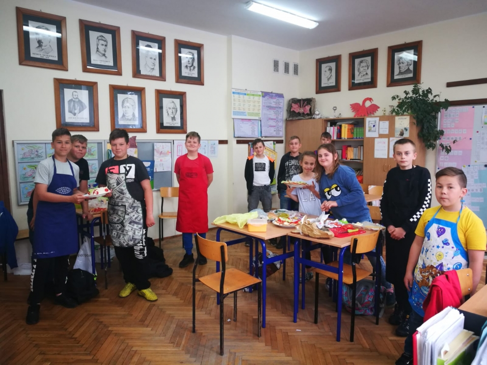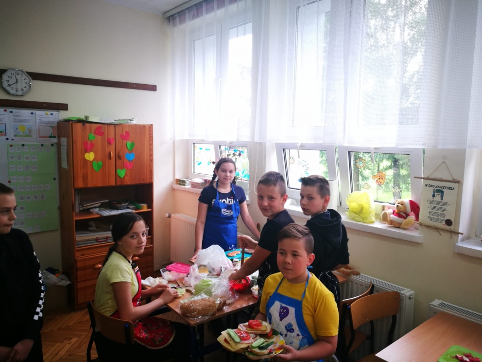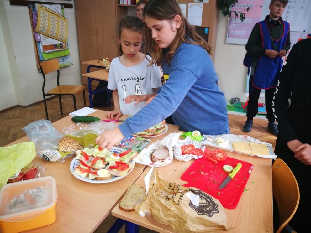 Piątoklasiści podjęli wyzwanie pod hasłem „Robimy pyszne, zdrowe kanapki”. Dzieci przyniosły do szkoły potrzebne produkty. Po starannym umyciu rąk, założeniu fartuszków i przygotowaniu stanowisk wszyscy razem zabrali się do pracy. Można śmiało powiedzieć, że zadanie wykonały doskonale. Kanapki nie tylko były smaczne, zdrowe, ale i pięknie ozdobione. Pamiętać należy, że najlepiej smakują kanapki wykonane własnoręcznie. I ta maksyma sprawdziła się tu doskonale, gdyż największe niejadki zjadały swoją porcję z apetytem. Dzieci przy robieniu kanapek kształciły odpowiednie nawyki żywieniowe, rozwijały kreatywność, wyobraźnię oraz dbałość o higienę podczas sporządzania posiłków.