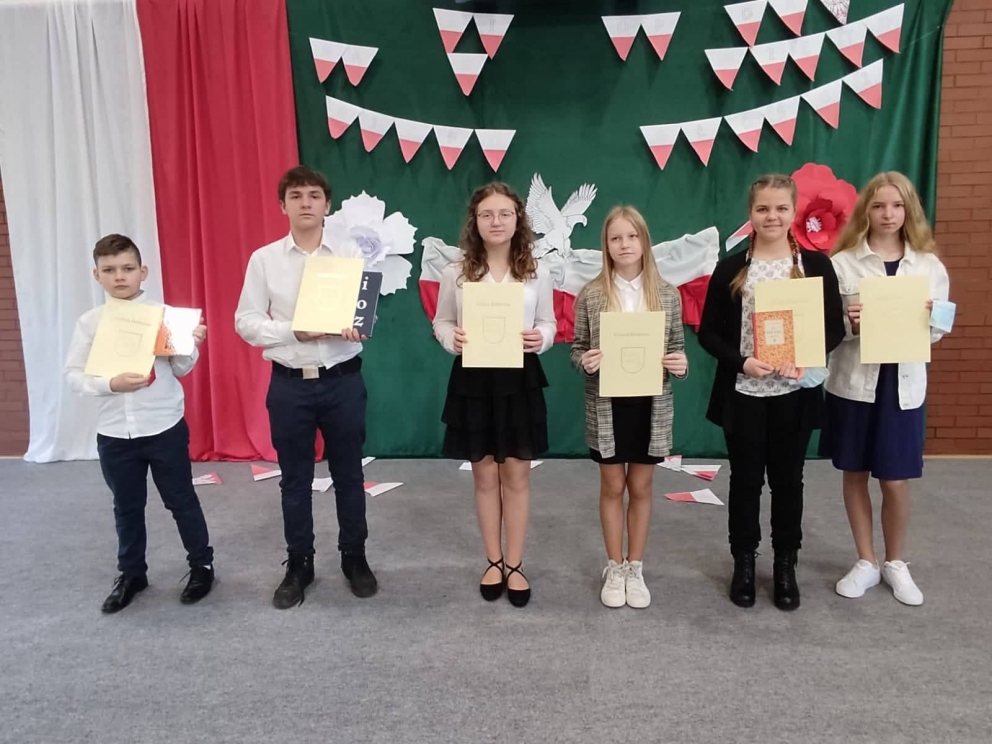 10 listopada odbyła się w naszej szkole uroczysta akademia z okazji Narodowego Święta Niepodległości. Część artystyczna wprowadziła zgromadzonych w atmosferę wydarzeń poprzedzających datę 11 listopada 1918 roku. W skrócie zobrazowano sytuację polityczną kraju, jaka miała miejsce przed odzyskaniem przez Polskę niepodległości. Uczniowie klas II- VII recytowali wiersze i śpiewali pieśni patriotyczne, które pozwoliły zrozumieć rozterki i uczucia walczących o niepodległość. To Święto sprawia, że w zabieganym życiu stajemy na chwilkę i wspominamy naszych dziadków i pradziadków walczących o wolność. Dzień ten dla wielu jest lekcją patriotyzmu i historii. Uczestnicząc corocznie w obchodach Święta Niepodległości dajemy wyraz pamięci o tych wszystkich, dzięki którym żyjemy dzisiaj w wolnej Polsce.