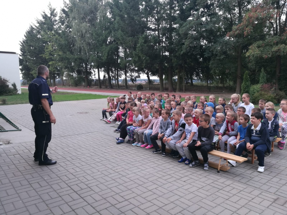 11 września uczniowie klas młodszych uczestniczyli w spotkaniu z policjantem. Tematem pogadanki była „Bezpieczna droga do szkoły”. Funkcjonariusz przypomniał zasady bezpiecznego poruszania się po drodze, zachęcał do wyposażenia ubiorów i plecaków w elementy odblaskowe. Przestrzegał najmłodszych przed zabawami w pobliżu jezdni. Uczniowie aktywnie uczestniczyli w spotkaniu, zadawali wiele pytań dotyczących bezpieczeństwa. Wykazywali się też dobrą znajomością znaków drogowych i zasad przechodzenia przez ulicę. Ponadto policjant omówił zasady bezpieczeństwa w stosunku do groźnego psa oraz tematy związane z prewencją zachowań ryzykownych jak rozmowa z nieznajomym i tym podobne. Takie spotkania odbywają się w naszej szkole od wielu lat i przynoszą dobre efekty. Liczymy, że i tym razem wiedza teoretyczna znajdzie zastosowanie w praktyce.