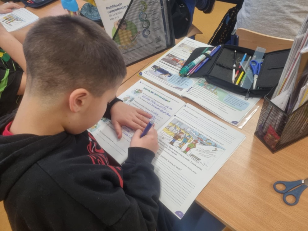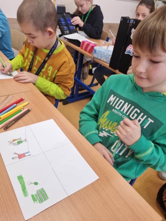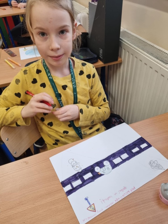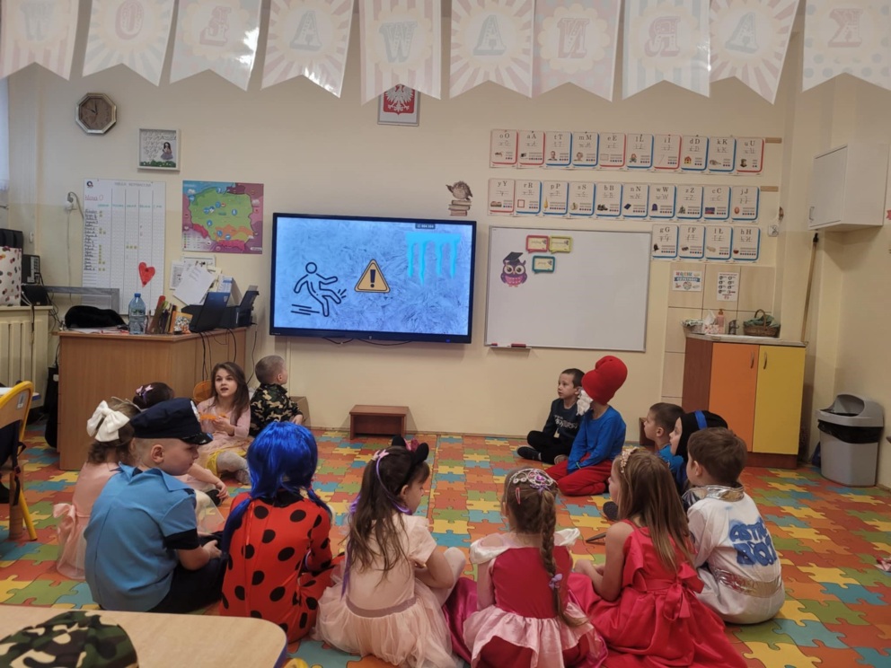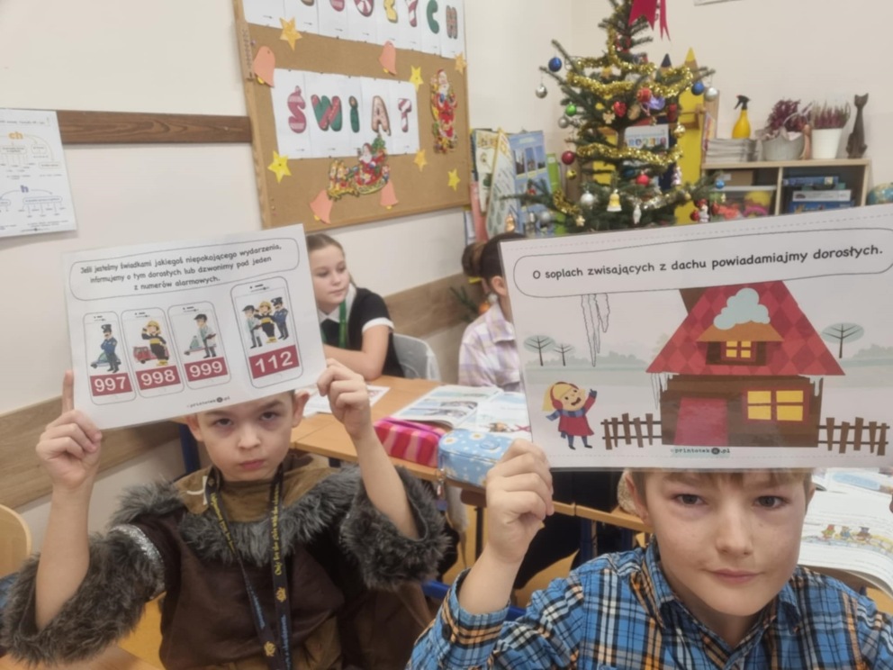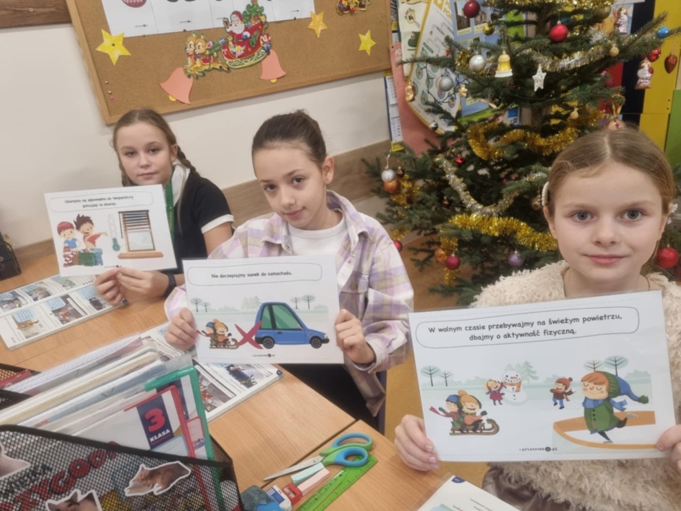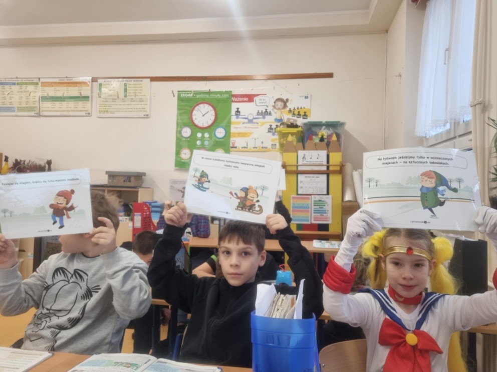 „Ferie zimowe to czas odpoczynku od nauki, to czas beztroskiej zabawy. Mamy nadzieję, że będzie biało, wesoło i radośnie.  Przypominamy Wam o zasadach bezpiecznego zachowania się podczas zabaw zimowych oraz zamieszczamy kilka ważnych porad i wskazówek”. Takie i inne słowa usłyszeli uczniowie w piątek 17 stycznia ostatniego dnia przed feriami. Oprócz pogadanek, były gry i filmiki edukacyjne, karty pracy, prace plastyczne.