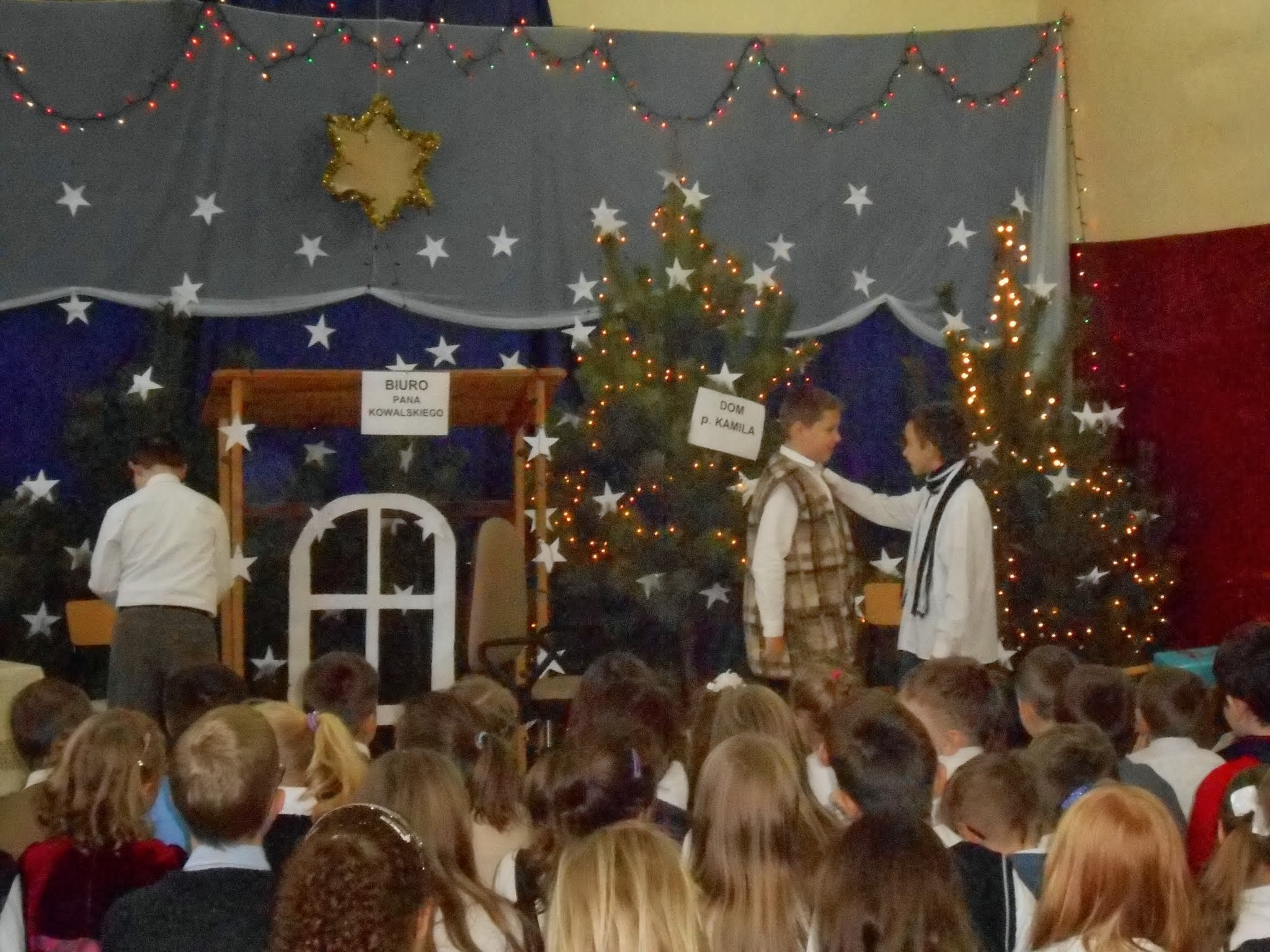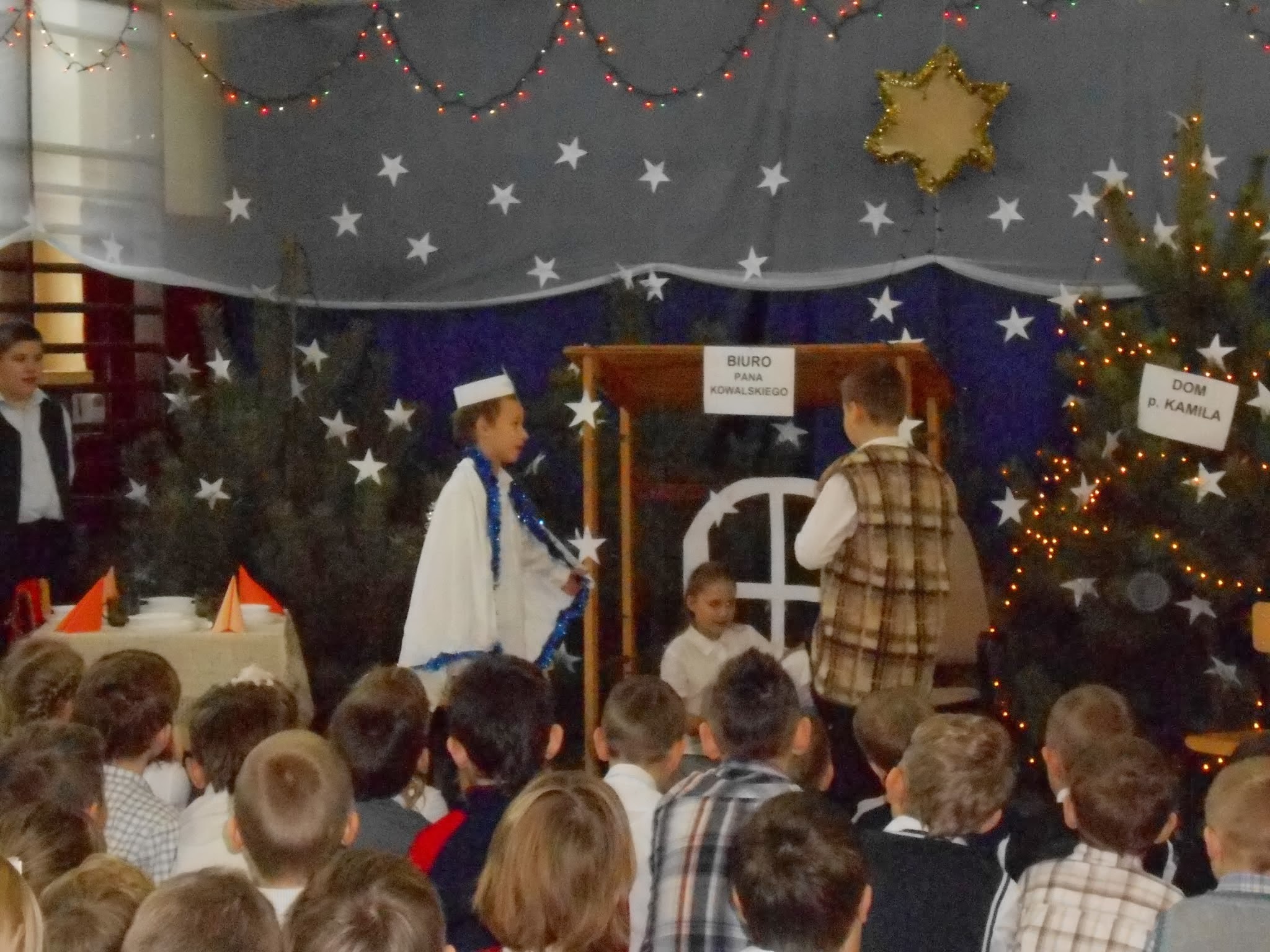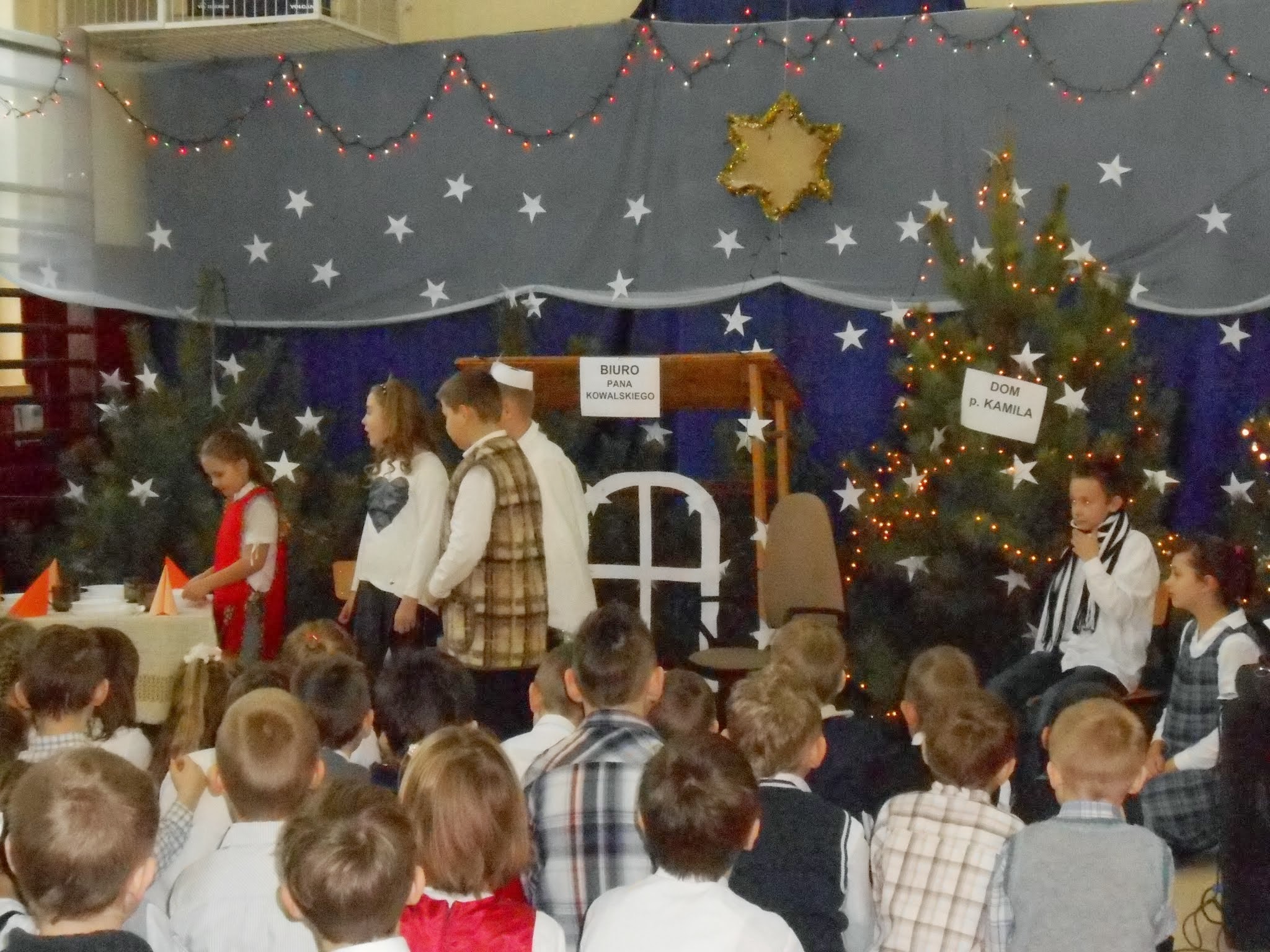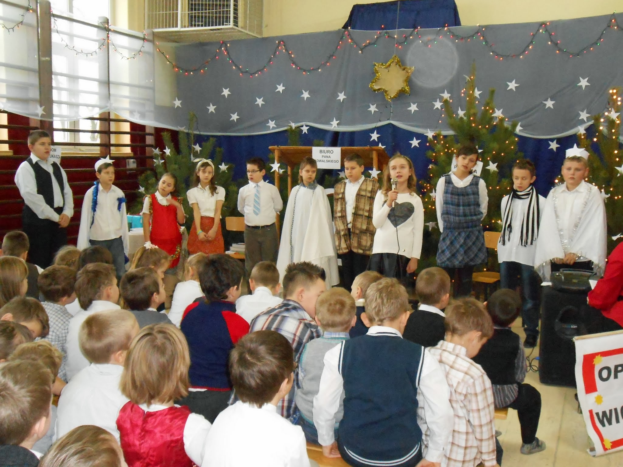 20 grudnia cała społeczność uczniowska obchodziła Wigilię Szkolną. Wszyscy uczniowie zebrali się na sali, gdzie klasa 4 odegrała przygotowane Jasełka. W tym roku przypomnieliśmy sobie ” Opowieść Wigilijną” na podstawie Karola Dickensa, w bardziej współczesnej formie, która bardzo podobała się widowni. Następnie wszyscy razem wraz ze śpiewnikami w rękach śpiewaliśmy kolędy i pastorałki. W rodzinnej atmosferze uczniowie udali się do klas, gdzie czekał na nich słodki poczęstunek, którym zakończyliśmy ostatni dzień w szkole. Następnie wszyscy udali się na zasłużony wypoczynek.