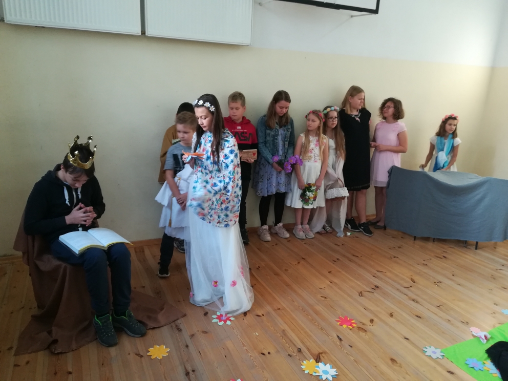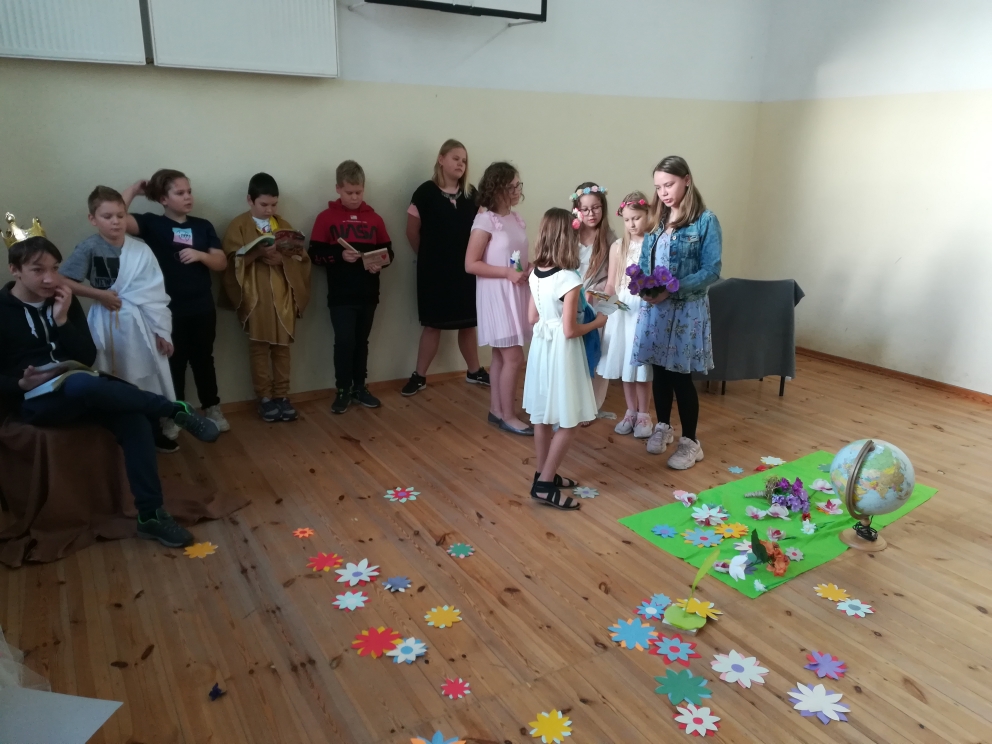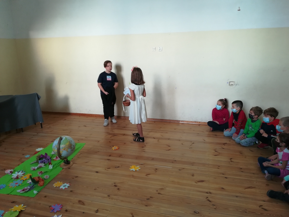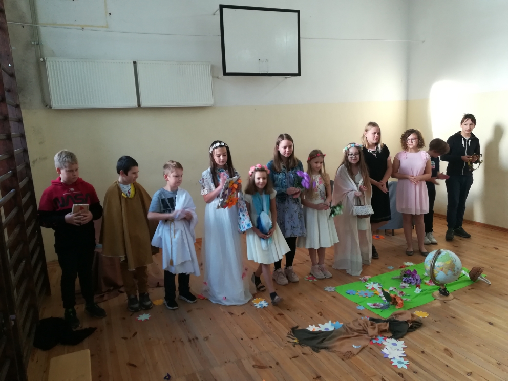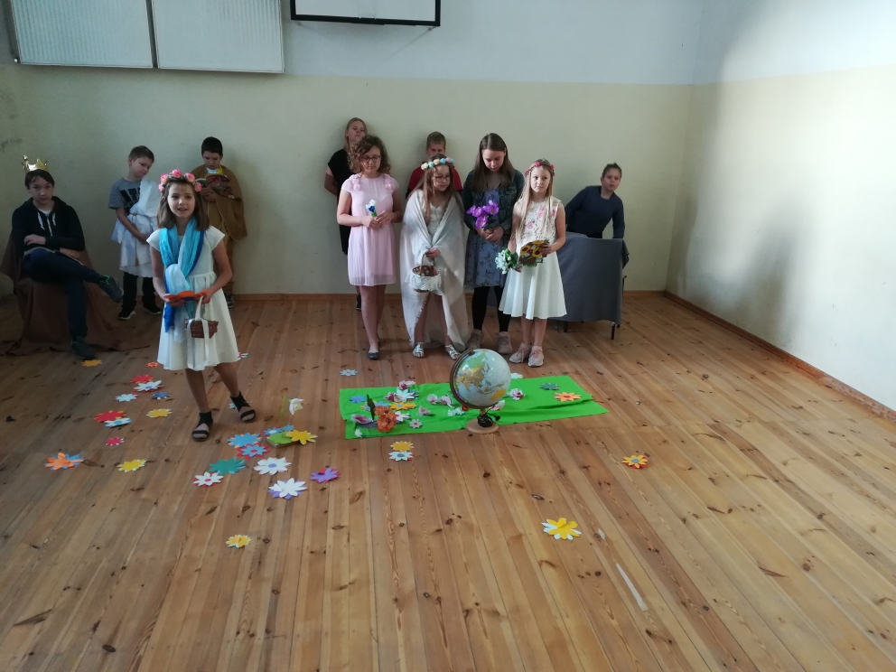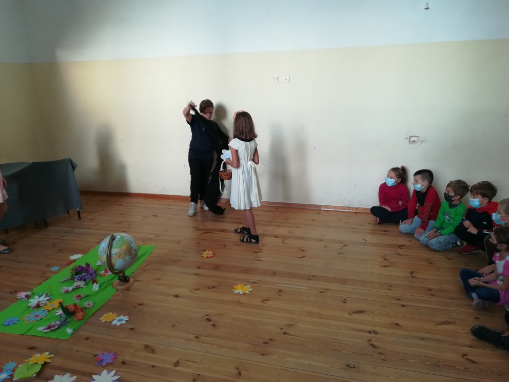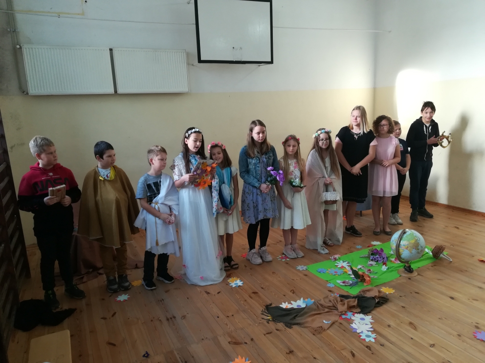 21 października odbyło się w naszej szkole przedstawienie teatralne oparte na motywach greckiego mitu o Demeter i Korze. Inscenizację przygotowali uczniowie klasy V, pod kierunkiem nauczycielki języka polskiego pani Bernadety Cieczko. Spektakl zaprezentowali przed kolegami z klas młodszych. Aktorzy bardzo zaangażowali się w przygotowania. Opracowali scenografię, przygotowali kostiumy, a także opanowali na pamięć swoje role. Przedstawienie zachwyciło publiczność, która doceniła występ młodych aktorów gromkimi brawami.