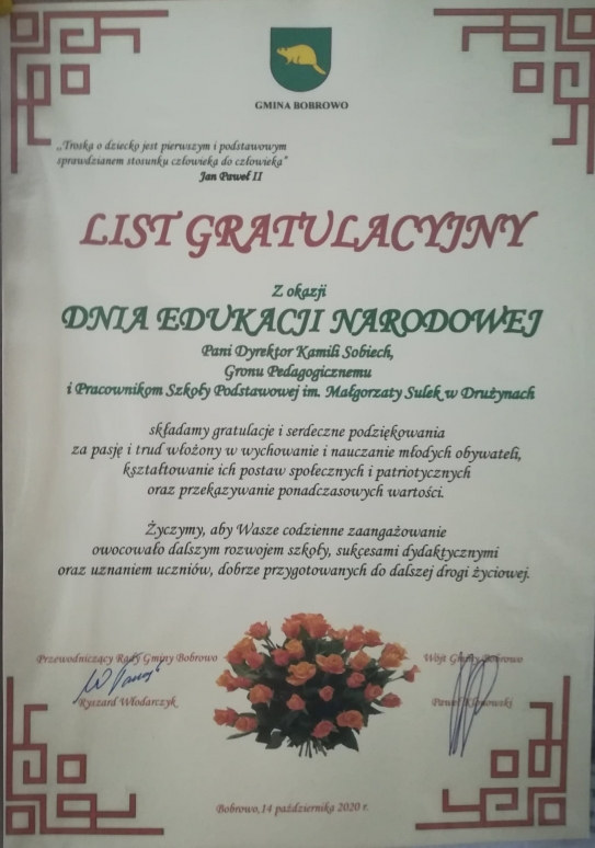 Takie i inne życzenia złożyli uczniowie swoim nauczycielom. Samorząd Uczniowski wykonał dekorację z okazji Święta Edukacji Narodowej i przekazał na ręce pani dyrektor Kamili Sobiech bukiet kwiatów na znak wdzięczności za codzienny trud pracy całego grona pedagogicznego. O nauczycielach pamiętał również Wójt Gminy Bobrowo pan Paweł Klonowski, który wystosował list gratulacyjny skierowany do kadry pedagogicznej i pani dyrektor.