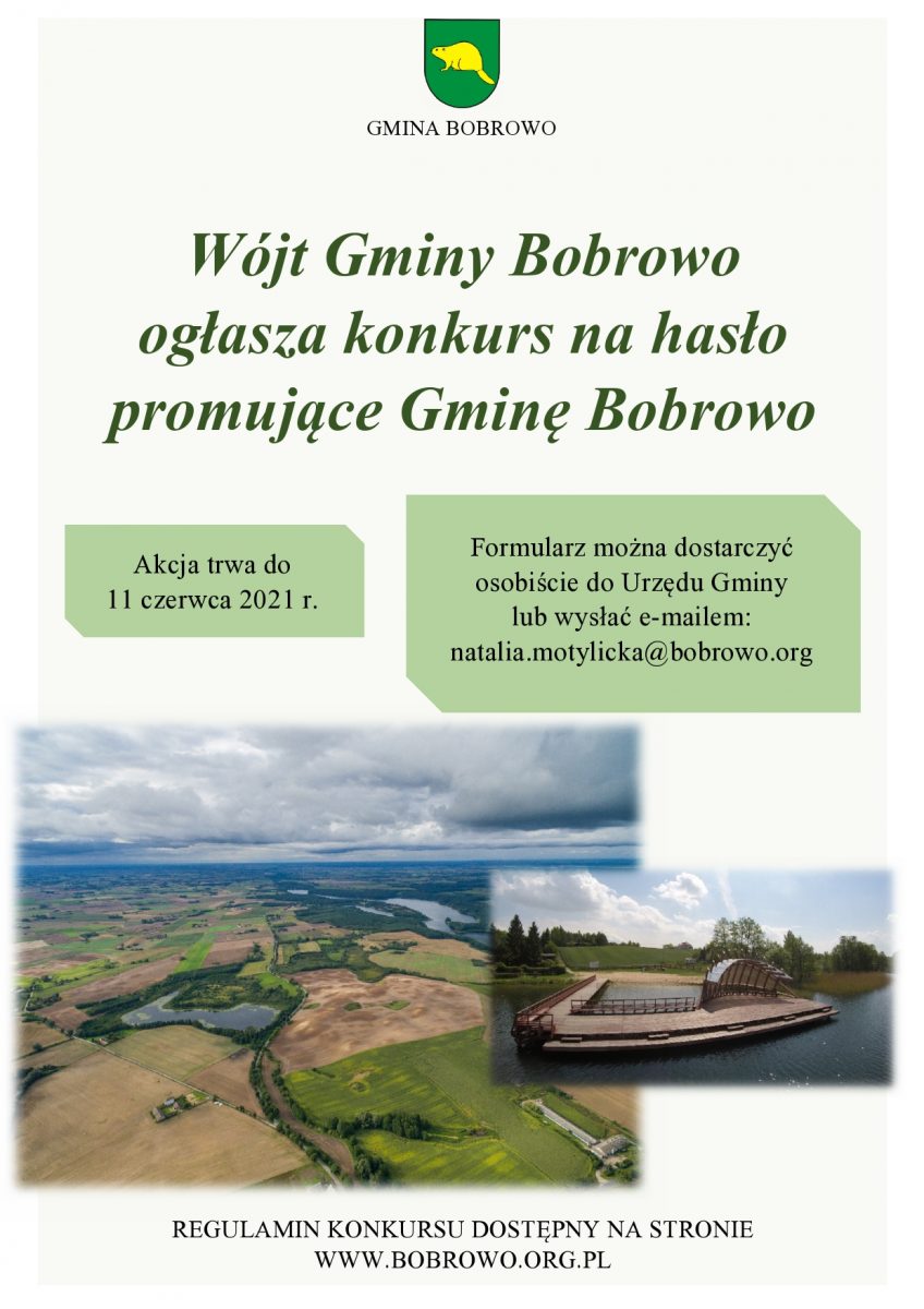 Zapraszamy do konkursu, którego celem jest wyłonienie jednego, najciekawszego hasła, promującego Gminę Bobrowo (hasło powinno być krótkie, zawierać treści promujące gminę, podkreślać jej walory przyrodnicze, dziedzictwo kulturowe, uwarunkowania gospodarcze, itp.), które będzie wykorzystane w materiałach reklamowych i promujących Gminę.