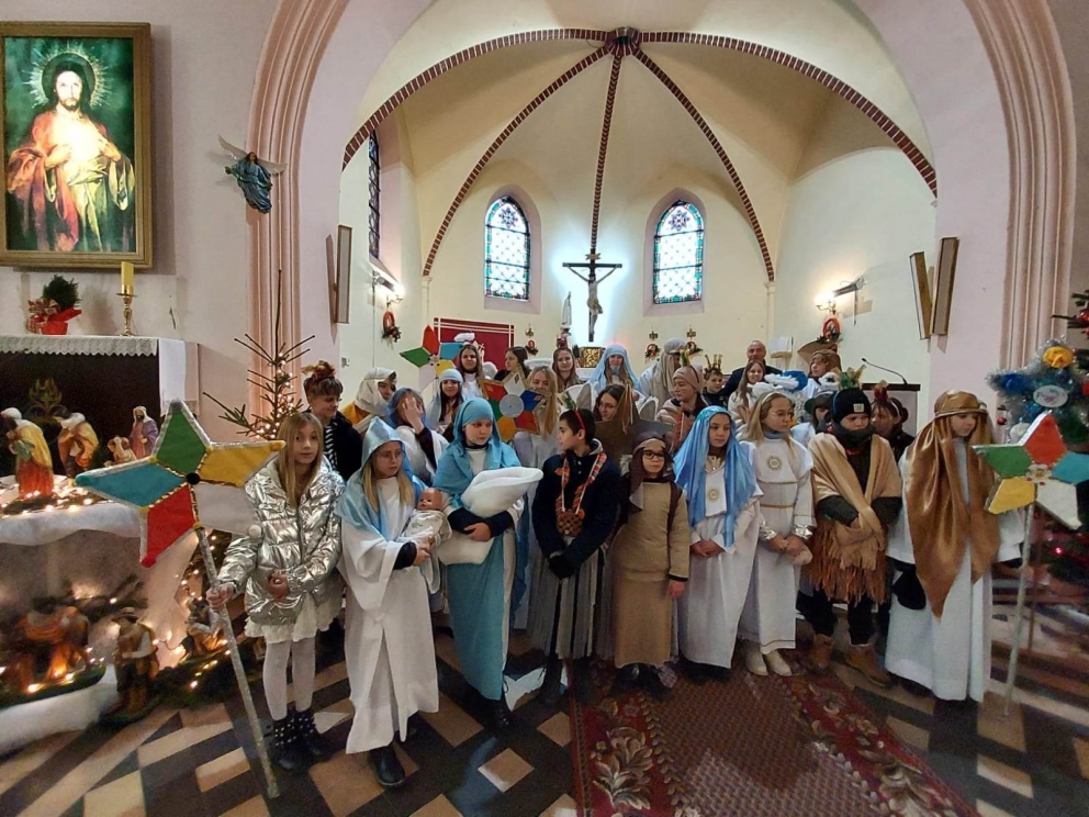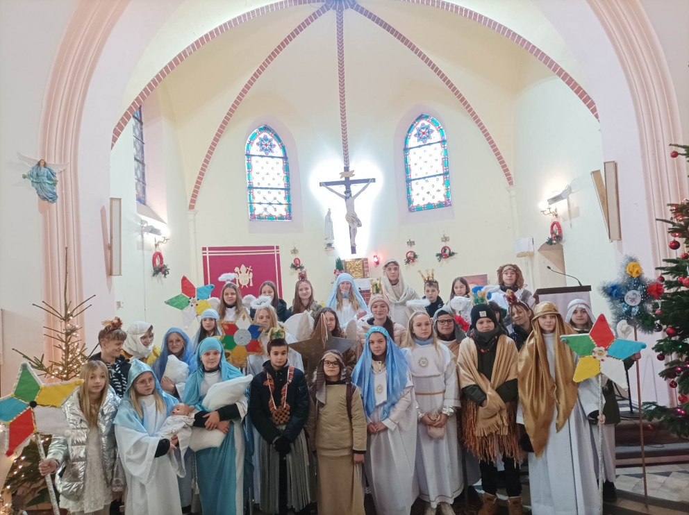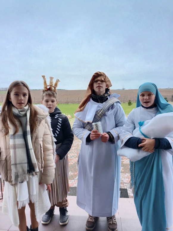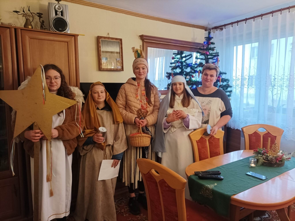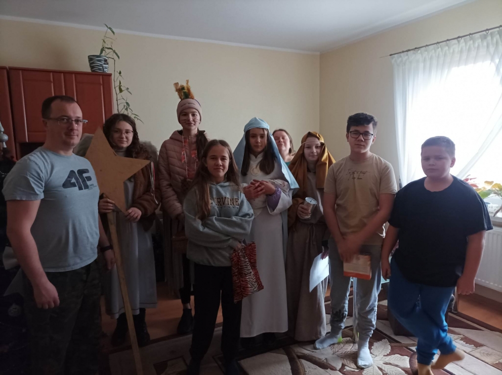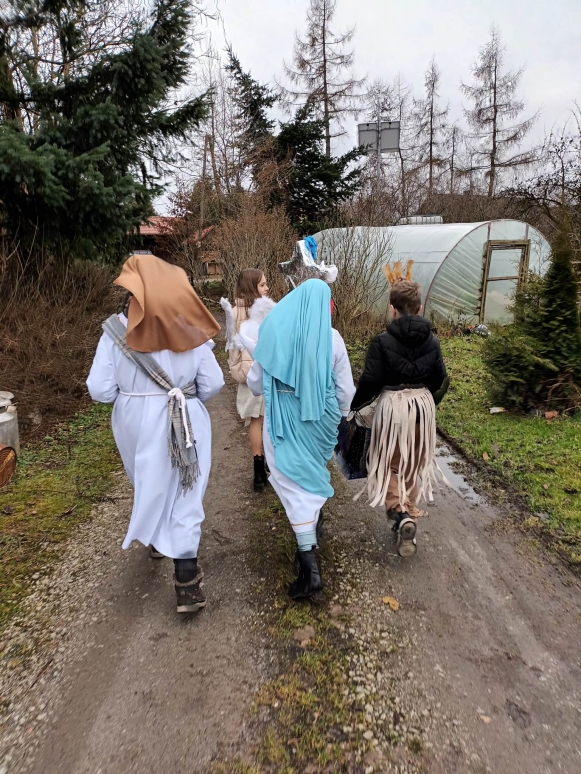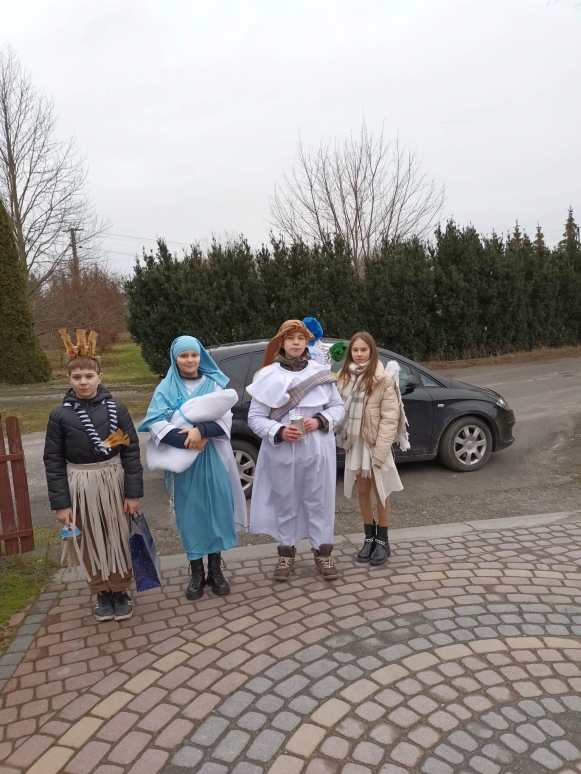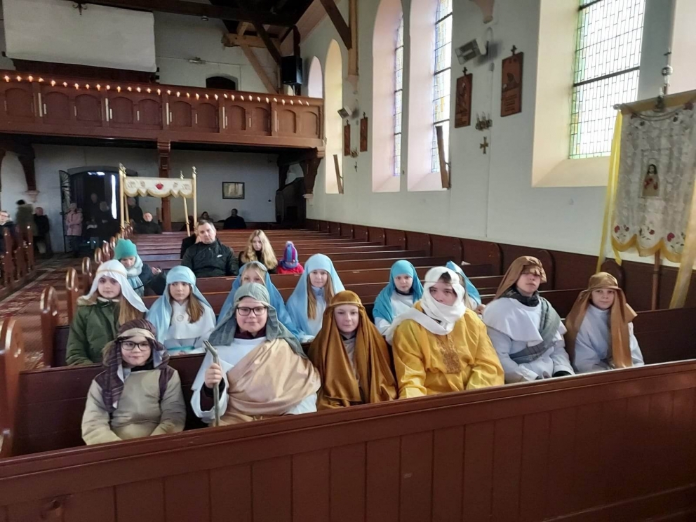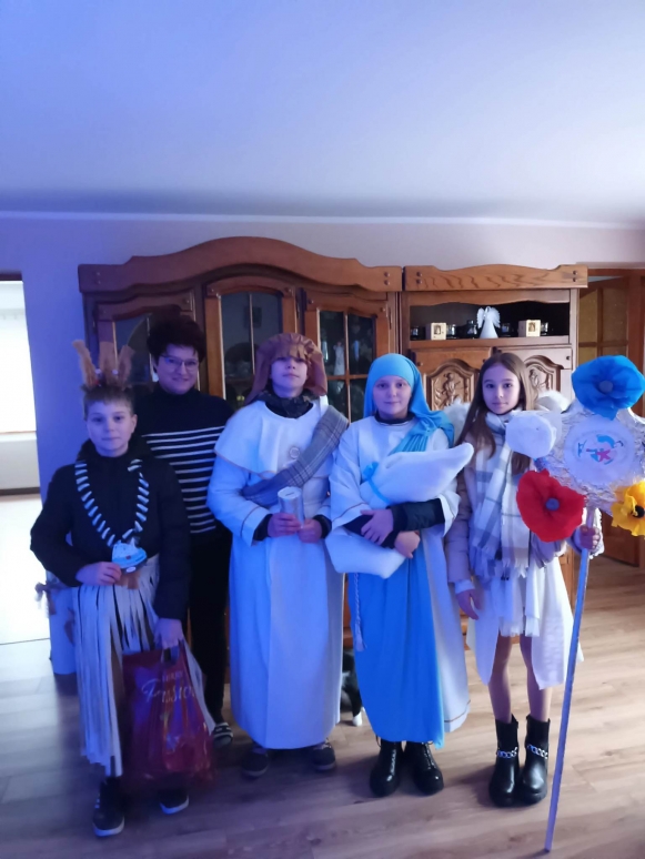 6 stycznia uczniowie naszej szkoły po raz kolejny wzięli udział w kolędowaniu misyjnym, którego celem było rozpalenie wśród wierzących pragnienia niesienia Chrystusa na krańce świata, pokazania dzieciom i młodzieży radości wiary oraz zwrócenie uwagi na potrzeby misji i misjonarzy. Kościół nie kończy się na parafii. Na różnych kontynentach mamy swoich bliźnich w Chrystusie, którzy potrzebują naszej pomocy duchowej i materialnej. Rok rocznie organizatorem akcji jest Papieskie Dzieło Misyjne w Polsce. Początkiem akcji była wspólna Msza Święta w kościele parafialnym, pod przewodnictwem księdza proboszcza. Kolędnicy w barwnych strojach uczestniczyli we wspólnej modlitwie, w czasie, której modliliśmy się za wszystkie dzieci w krajach misyjnych i za dzieło misyjne. Na zakończenie Liturgii ksiądz proboszcz dokonał uroczystego posłania kolędników do niesienia ewangelii po całej naszej parafii.