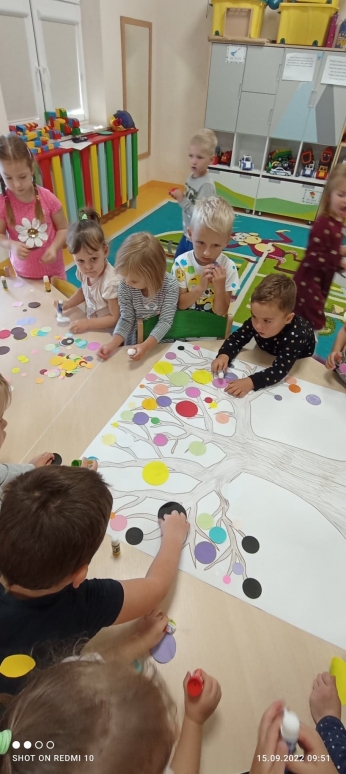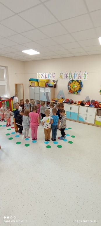 „Międzynarodowy Dzień Kropki” obchodzony jest na całym świecie 15 września. Jest to święto, które ma na celu pobudzanie kreatywności, pomysłowości, talentu i odwagi w pokonywaniu trudności. W tym wyjątkowym dniu zarówno dzieci jak i wychowawczynie przyszli ubrani w grochy, kropki i groszki. Świętowanie rozpoczęli od zapoznania się z Vashti. Dzieci wysłuchały jej historii, a także obejrzały krótki filmik o tytułowej „Kropce”. Kolejnym punktem tego dnia było uczestnictwo w wielu zabawach z kropką oraz wykonanie wspólnej pracy plastycznej.