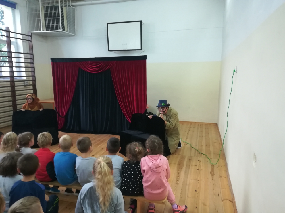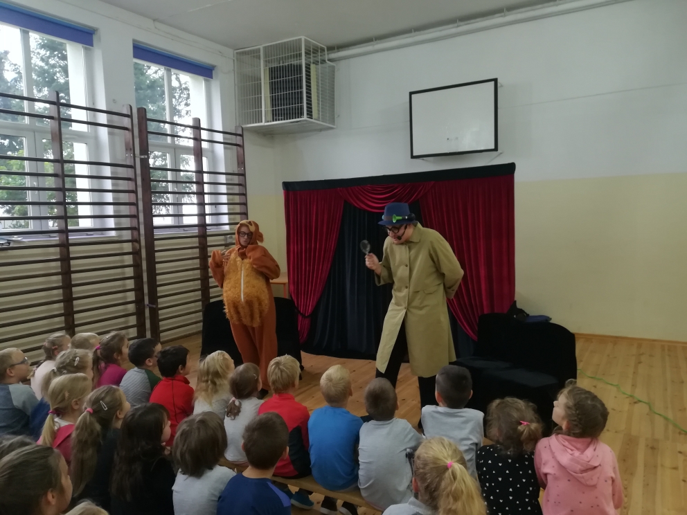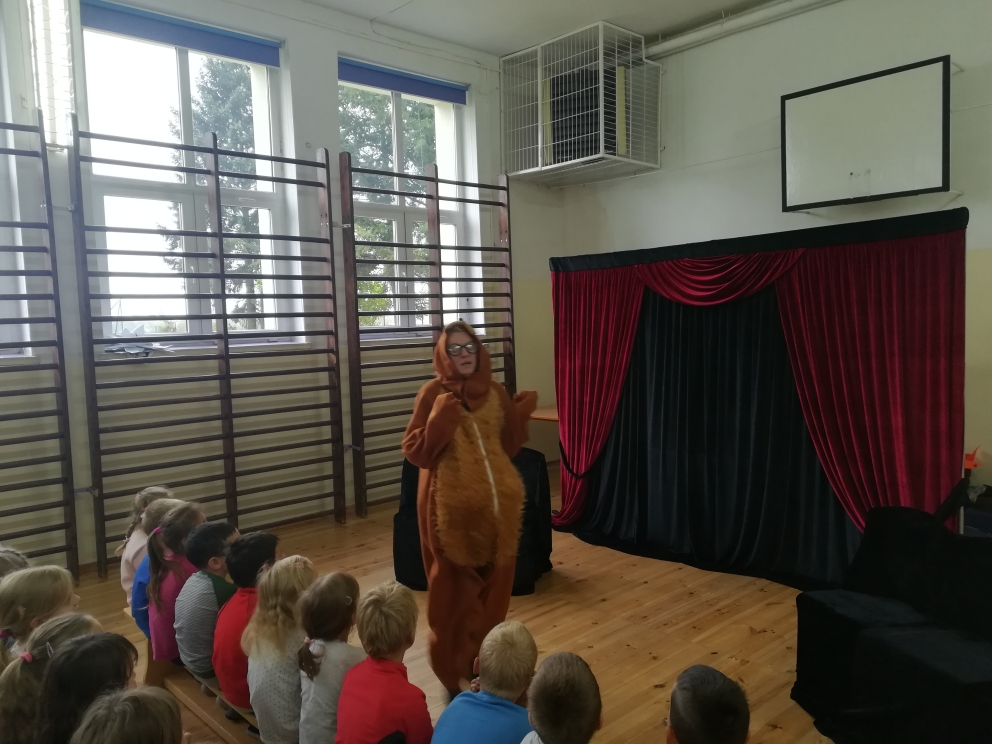 18 września gościliśmy w naszej szkole aktorów Teatru „Kurtyna” z Krakowa. Teatr Kurtyna z siedzibą w Krakowie jest najstarszym Teatrem Profilaktycznym w Polsce i działa nieprzerwanie od momentu powstania, czyli od 2000 roku. Działalność Teatru skupia się przede wszystkim na realizacji przedstawień teatralnych oraz teatralno – profilaktycznych, organizowanych na terenie całej Polski. W naszej szkole artyści zaprezentowali uczniom dostosowane do wieku przedstawienie profilaktyczne pt.: „Miś niegrzeczniś”. Najmłodsi widzowie poznali rozbrykanego misia, który był bardzo niegrzeczny. Uczniowie biorąc udział w tej pouczającej lekcji, śpiewając i odpowiadając na pytania zadawane przez artystów poznali tajniki kulturalnego zachowywania się.