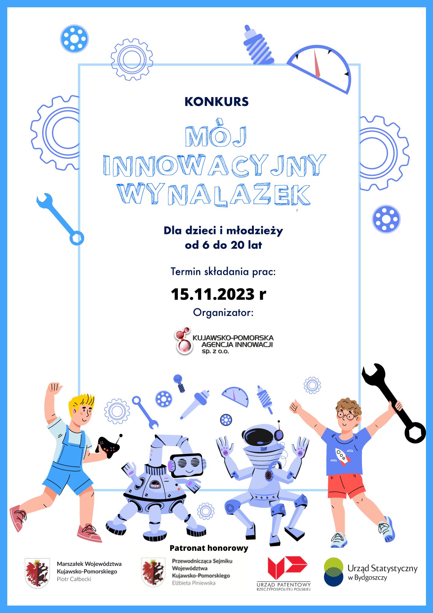 Zapraszamy do udziału w kolejnej edycji konkursu „MÓJ INNOWACYJNY WYNALAZEK”, który został objęty honorowym patronatem Marszałka Województwa Kujawsko-Pomorskiego, Przewodniczącej Sejmiku Województwa Kujawsko-Pomorskiego, Urzędu Patentowego RP oraz Urzędu Statystycznego w Bydgoszczy. Na najciekawsze wynalazki czekają atrakcyjne nagrody.