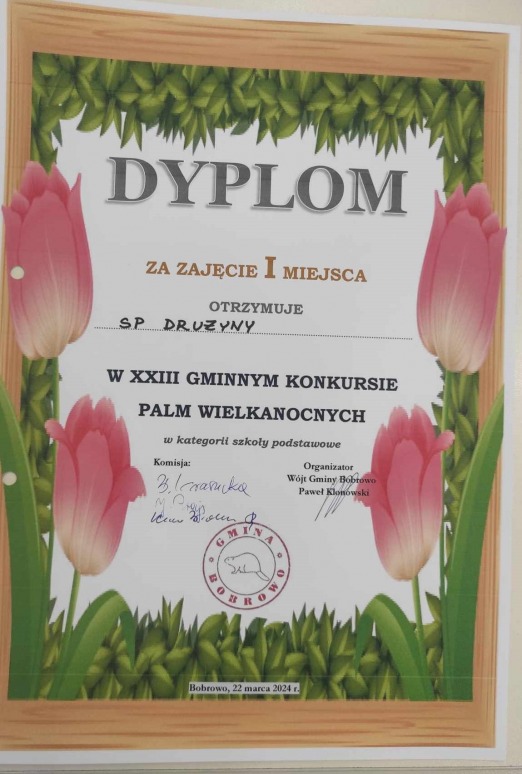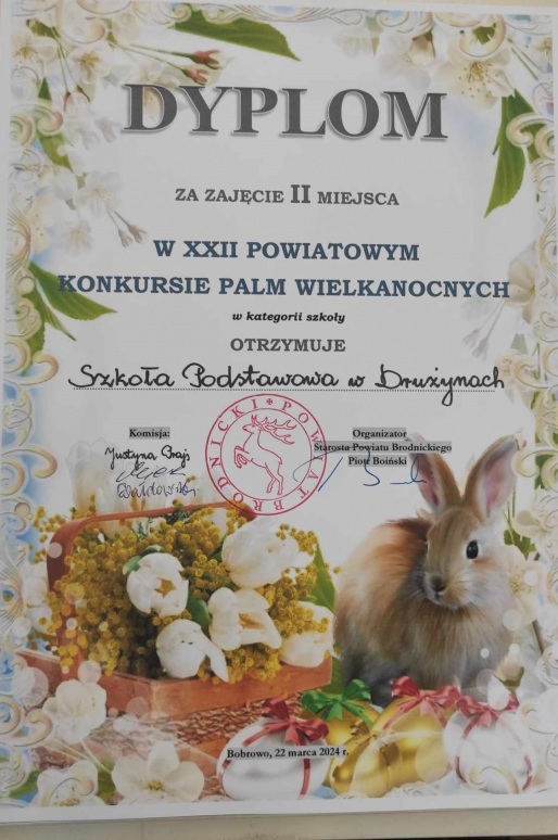 Przez ostatnie dwa tygodnie marca klasy starsze wraz z nauczycielami wykonywali palmę wielkanocną, która została zgłoszona do konkursu gminnego i powiatowego. Rozstrzygnięcie nastąpiło 22 marca w Gminnym Ośrodku Kultury w Bobrowie. Odnieśliśmy wielki sukces!!! Nasze arcydzieło zajęło I miejsce w XXIII Gminnym Konkursie Palm Wielkanocnych oraz II miejsce w XXII Powiatowym Konkursie Palm Wielkanocnych.