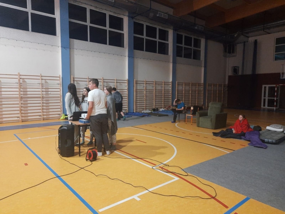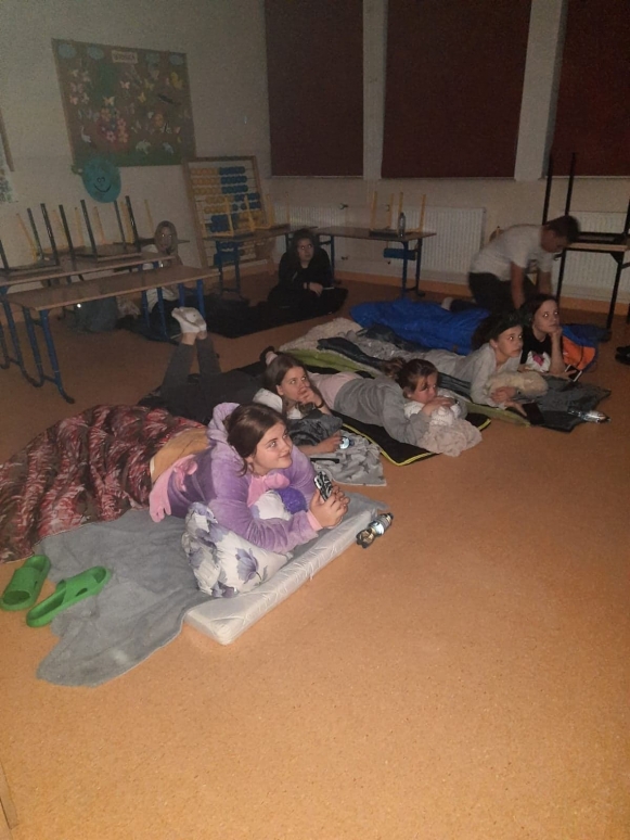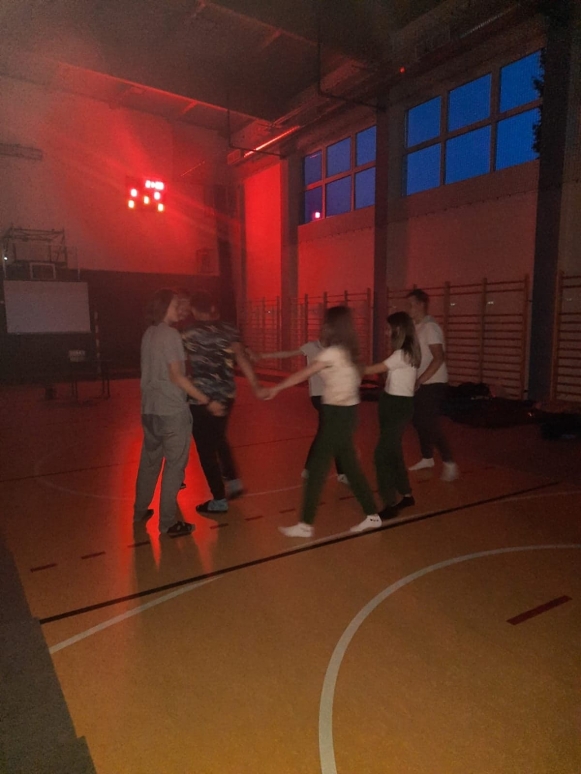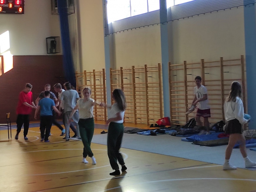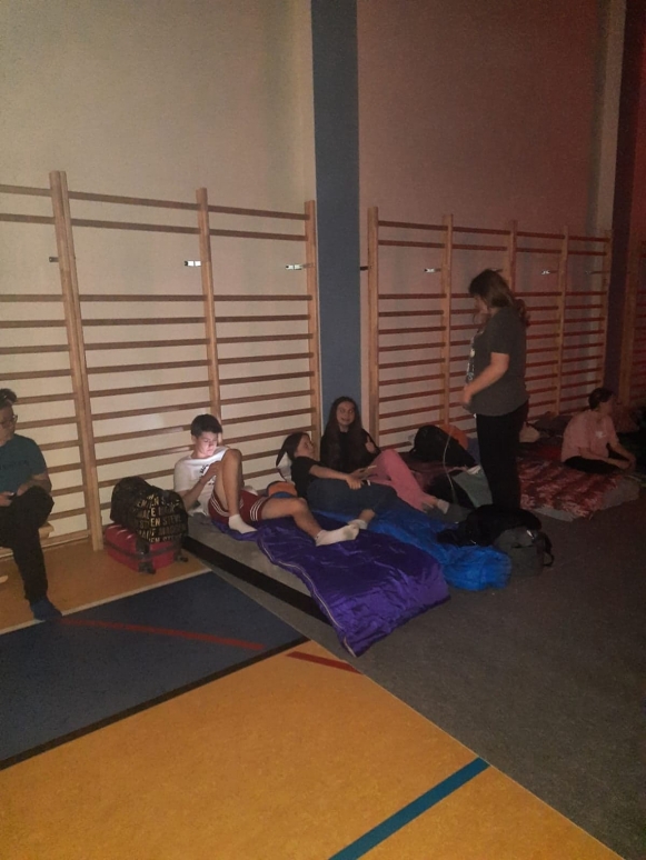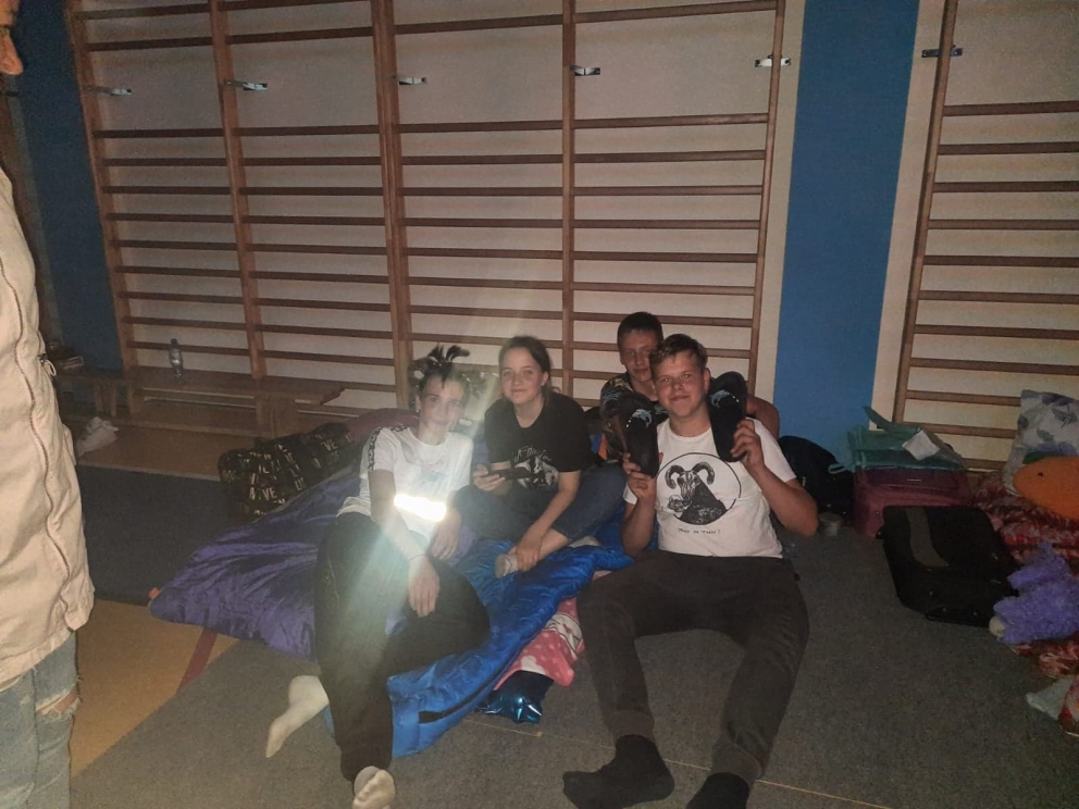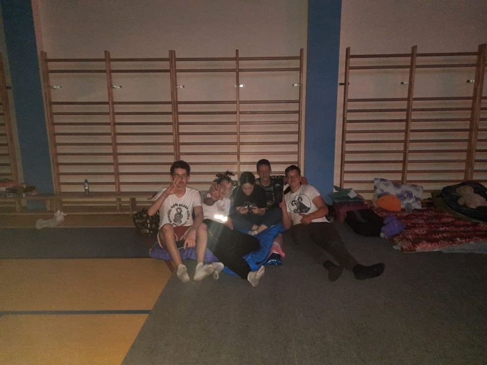 Nocą w szkole straszy? A może korytarzami przechadza się Król? Odpowiedzi na te pytania szukali uczniowie klasy VII i VIII, którzy noc z 27 na 28 maja spędzili w murach szkoły. Wydaje się to nie do pomyślenia? A jednak… To wydarzyło się naprawdę. Impreza rozpoczęła się w piątek 27 maja o godzinie 17.00 i zakończyła w sobotę o 9.00 rano. Powitalne spotkanie odbyło się na sali gimnastycznej. Uczestnicy nocowania złożyli przysięgę, że będą prezentować pogodę ducha, mieć dobry humor i świetnie się bawić. Nie będą marudzili, narzekali, płakali za rodzicami i pokażą wszystkim, jacy są zgrani, kreatywni i wyjątkowi! I tak było!!!. Młodzież tańczyła przy muzyce, grała w gry planszowe, prowadziła rozgrywki sportowe i oglądała filmy. Kiedy lekkie zmęczenie dało się we znaki zjedli smaczną kolację przyrządzoną przez rodziców. Wszyscy bawili się tak długo, aż nogi odmówiły posłuszeństwa. Po wieczornej toalecie nastąpiła cisza nocna, ale uczestnicy nocowania długo jeszcze wymieniali się wrażeniami z tego wyjątkowego wieczoru. Rankiem, po pobudce, zasiedli do wspólnego śniadania, porządkowali sale lekcyjne i czekali na odbiór przez rodziców. Noc spędzona w gmachu szkoły pokazała placówkę zupełnie z innej perspektywy, nie tylko, jako budynku, do którego trzeba przyjść rano z odrobionymi lekcjami, ale także miejsca, gdzie można zorganizować niezwykłe zajęcia, świetnie się bawić i miło spędzić czas przy okazji poznając się nawzajem i integrując z kolegami z innych klas. Czy można polubić szkołę i odnaleźć tu swoje miejsce? Czy szkołę możemy traktować jak drugi dom? Z pewnością tak. Pokazała to atmosfera, jaka panowała podczas tej imprezy, pełna zabawy, akceptacji, życzliwości, a domowy klimat oddawał swobodny strój sportowy, spacery po szkolnych korytarzach w kapciach i piżamach, wspólny posiłek, domowe jedzenie, gry i zabawy w gronie kolegów i koleżanek. Szkoła okazała się nie tylko miejscem nauki, ale także zabawy i rozrywki lepszej od telefonu komórkowego, komputera, czy telewizji. Taka noc w szkole, to doskonała okazja do lepszego poznania się i integracji. I niespodziewanie wybiła godzina 9.00 na zegarach – czas do domu.