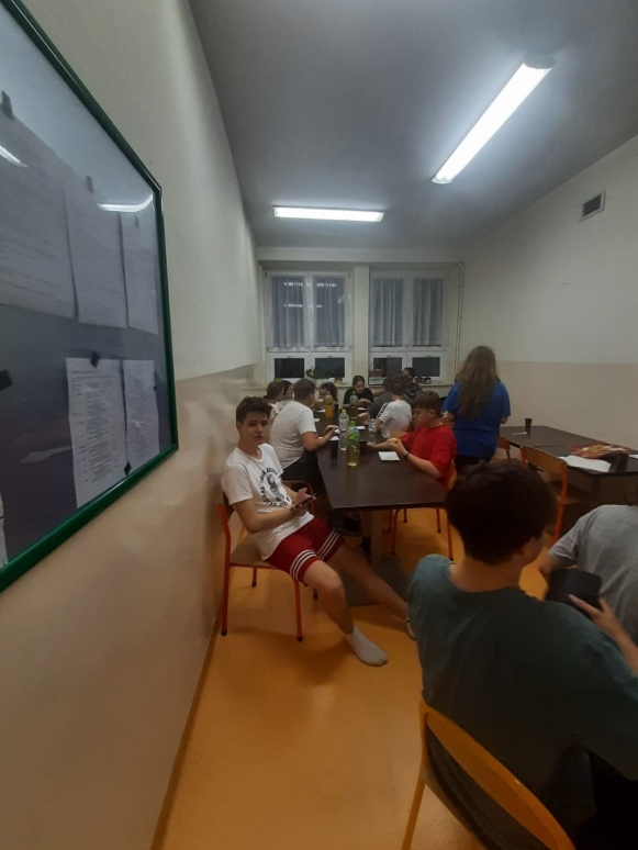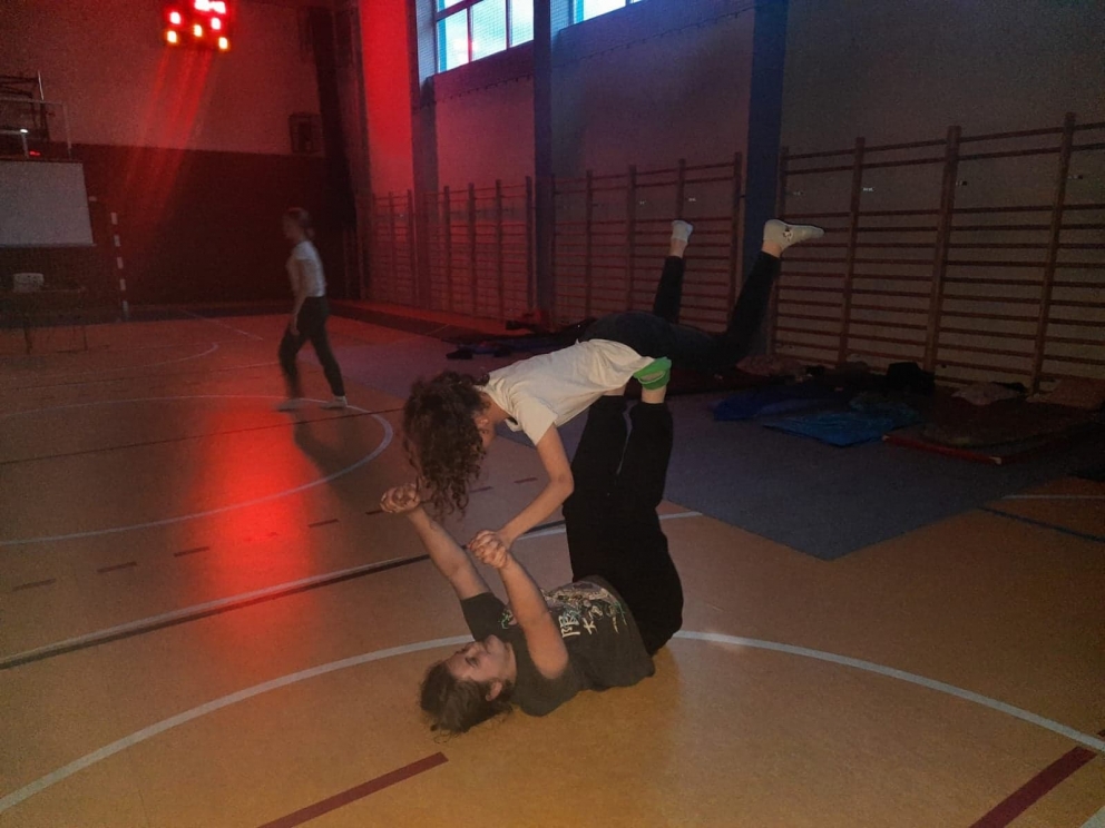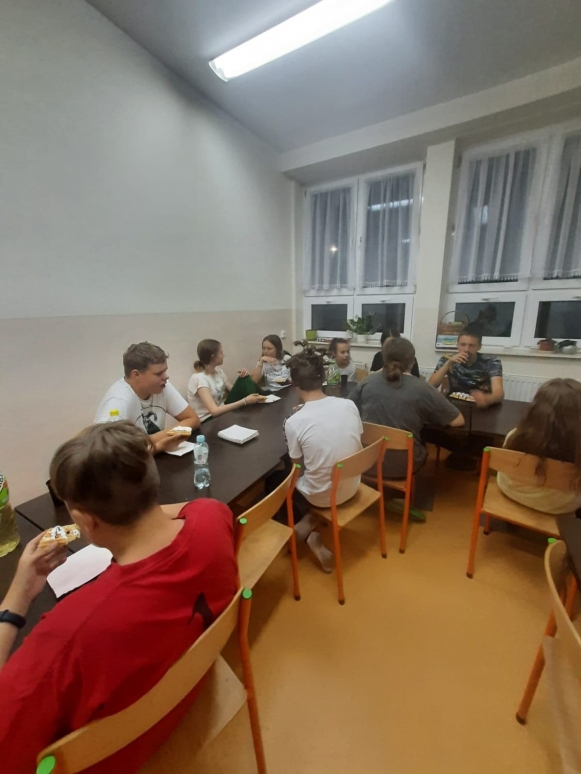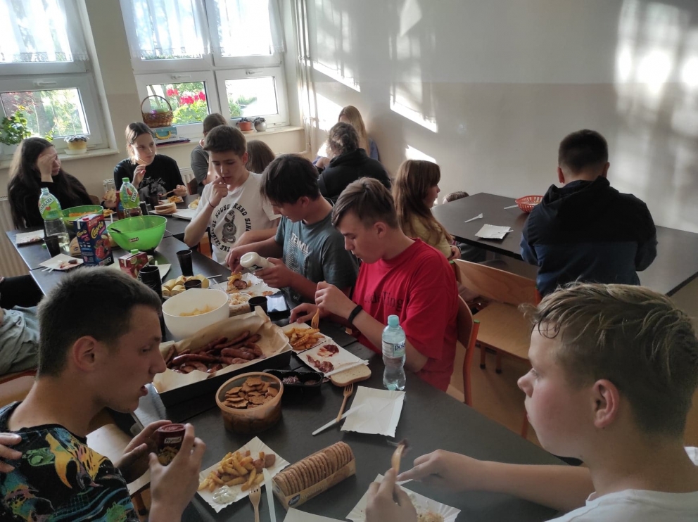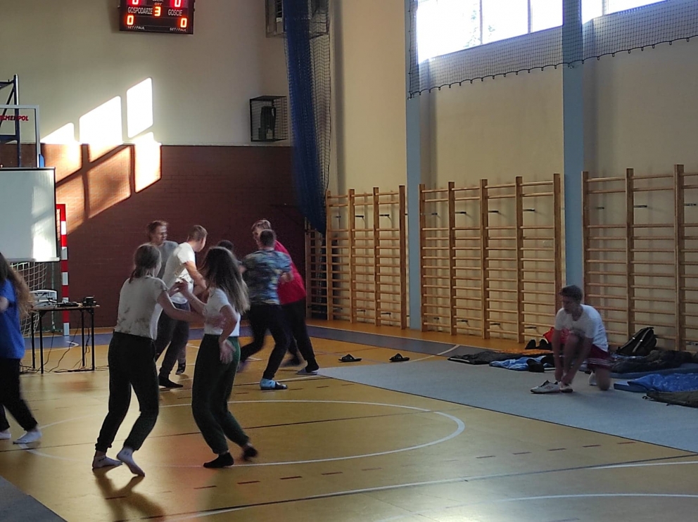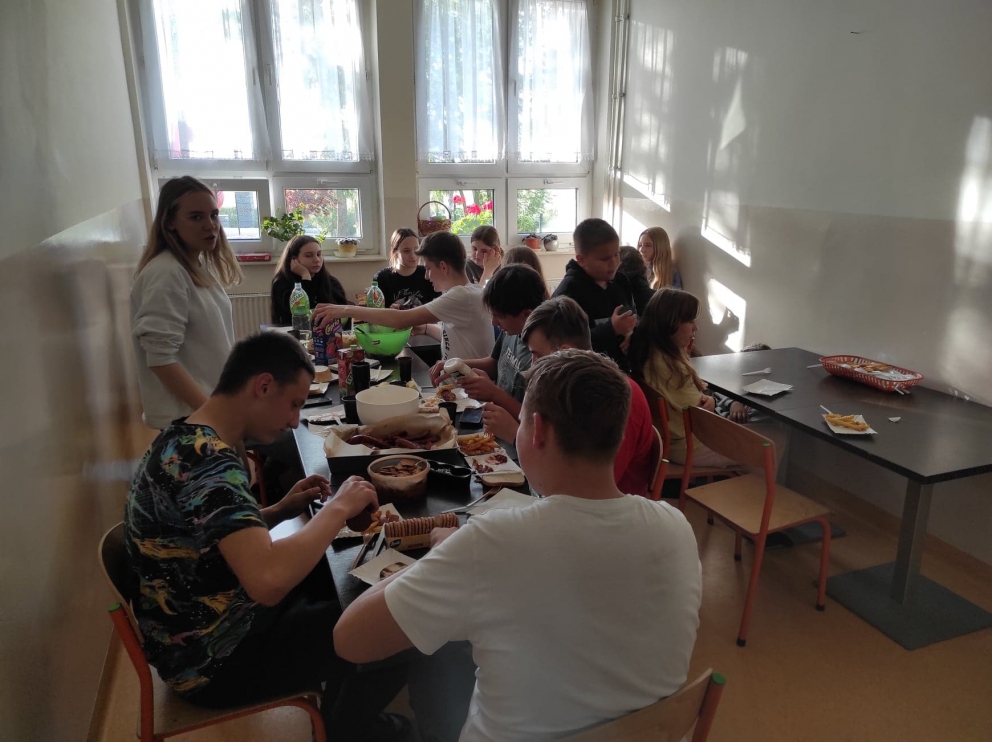 Nocą w szkole straszy? A może korytarzami przechadza się Król? Odpowiedzi na te pytania szukali uczniowie klasy VII i VIII, którzy noc z 27 na 28 maja spędzili w murach szkoły. Wydaje się to nie do pomyślenia? A jednak… To wydarzyło się naprawdę. Impreza rozpoczęła się w piątek 27 maja o godzinie 17.00 i zakończyła w sobotę o 9.00 rano. Powitalne spotkanie odbyło się na sali gimnastycznej. Uczestnicy nocowania złożyli przysięgę, że będą prezentować pogodę ducha, mieć dobry humor i świetnie się bawić. Nie będą marudzili, narzekali, płakali za rodzicami i pokażą wszystkim, jacy są zgrani, kreatywni i wyjątkowi! I tak było!!!. Młodzież tańczyła przy muzyce, grała w gry planszowe, prowadziła rozgrywki sportowe i oglądała filmy. Kiedy lekkie zmęczenie dało się we znaki zjedli smaczną kolację przyrządzoną przez rodziców. Wszyscy bawili się tak długo, aż nogi odmówiły posłuszeństwa. Po wieczornej toalecie nastąpiła cisza nocna, ale uczestnicy nocowania długo jeszcze wymieniali się wrażeniami z tego wyjątkowego wieczoru. Rankiem, po pobudce, zasiedli do wspólnego śniadania, porządkowali sale lekcyjne i czekali na odbiór przez rodziców. Noc spędzona w gmachu szkoły pokazała placówkę zupełnie z innej perspektywy, nie tylko, jako budynku, do którego trzeba przyjść rano z odrobionymi lekcjami, ale także miejsca, gdzie można zorganizować niezwykłe zajęcia, świetnie się bawić i miło spędzić czas przy okazji poznając się nawzajem i integrując z kolegami z innych klas. Czy można polubić szkołę i odnaleźć tu swoje miejsce? Czy szkołę możemy traktować jak drugi dom? Z pewnością tak. Pokazała to atmosfera, jaka panowała podczas tej imprezy, pełna zabawy, akceptacji, życzliwości, a domowy klimat oddawał swobodny strój sportowy, spacery po szkolnych korytarzach w kapciach i piżamach, wspólny posiłek, domowe jedzenie, gry i zabawy w gronie kolegów i koleżanek. Szkoła okazała się nie tylko miejscem nauki, ale także zabawy i rozrywki lepszej od telefonu komórkowego, komputera, czy telewizji. Taka noc w szkole, to doskonała okazja do lepszego poznania się i integracji. I niespodziewanie wybiła godzina 9.00 na zegarach – czas do domu.
