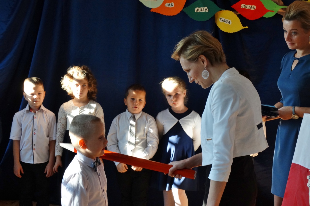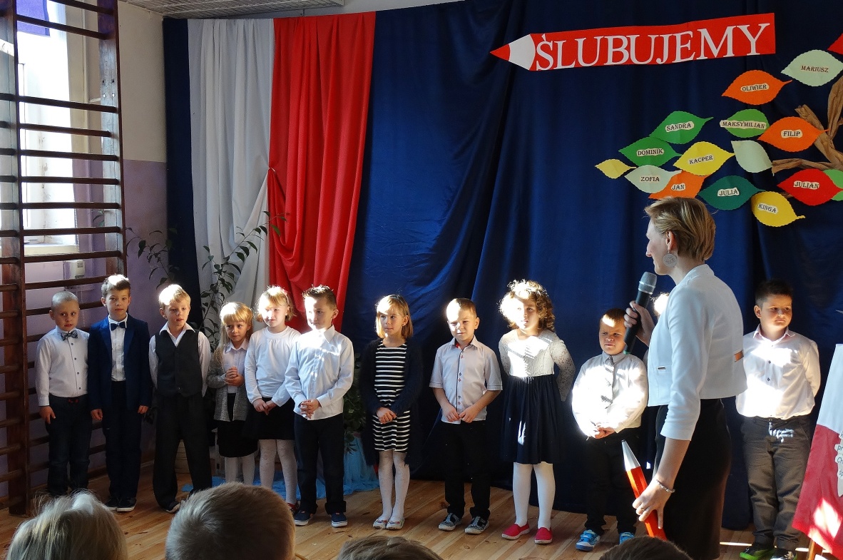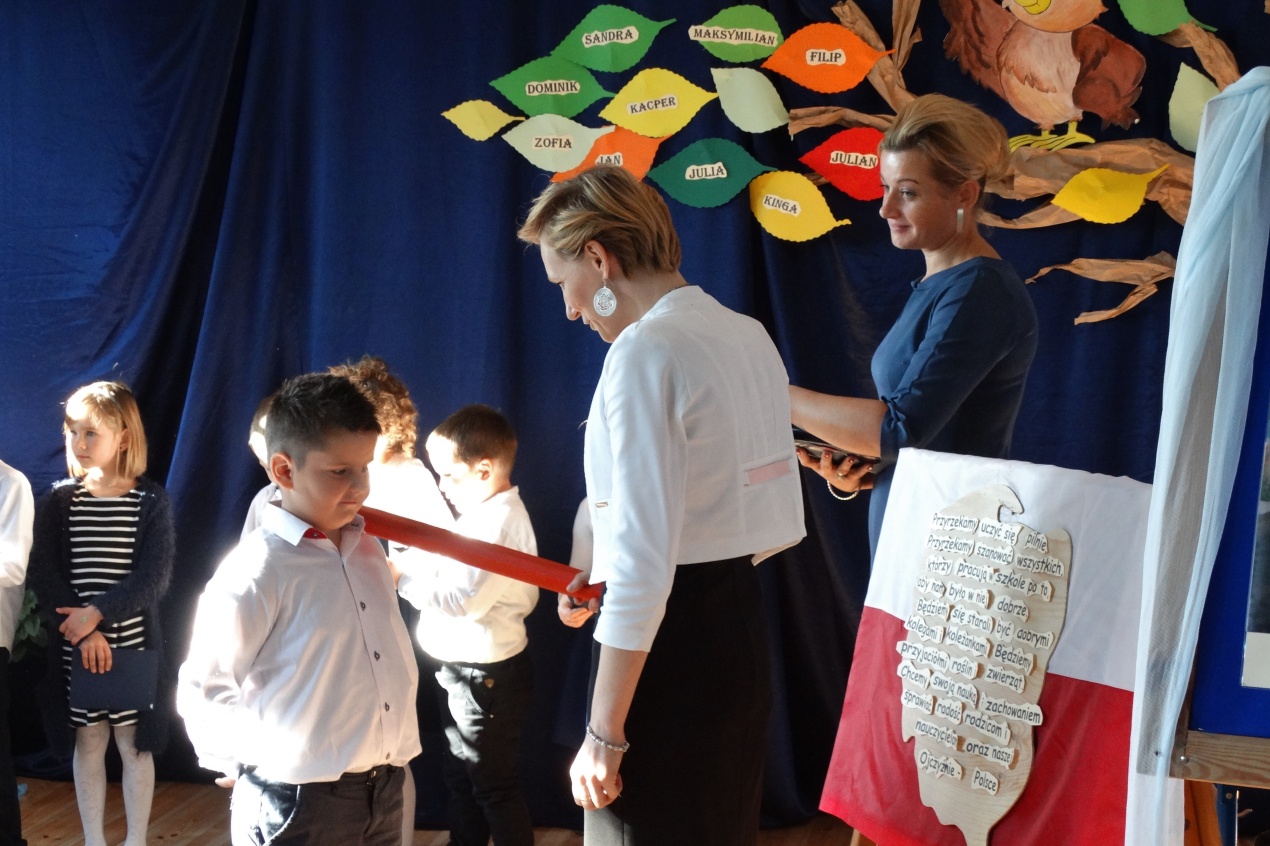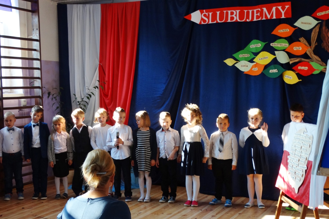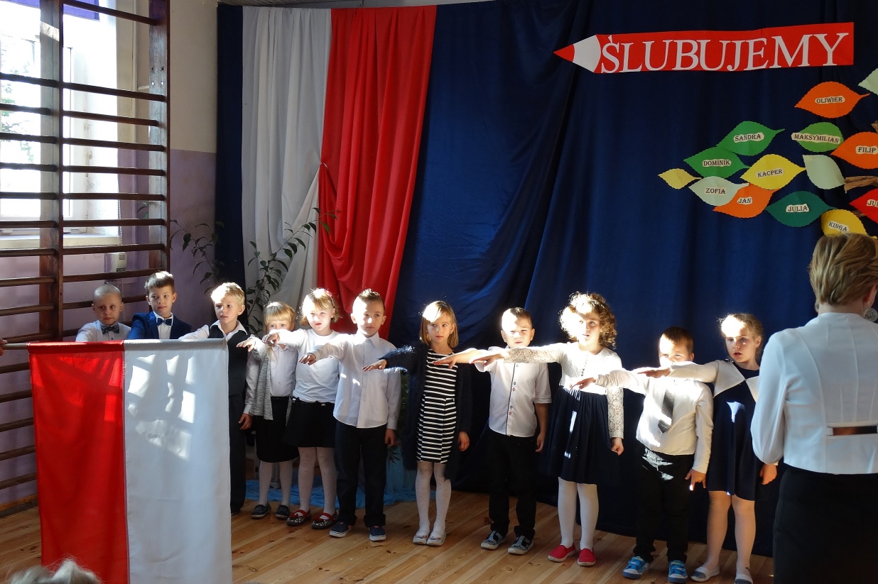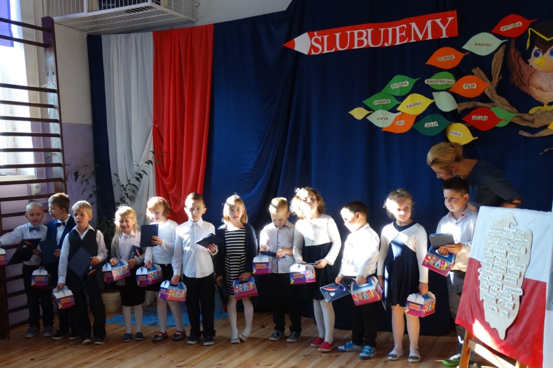 Dzień 02 października był kolejnym wyjątkowym  dniem w naszej szkole, ponieważ odbyło się wtedy Pasowanie na Ucznia. Wszyscy uczniowie klasy pierwszej przybyli do szkoły ze swoimi gośćmi: rodzicami, rodzeństwem, babciami i dziadkami, bo przecież pasowanie  to jedno z najważniejszych wydarzeń w szkolnym życiu pierwszoklasisty. Od tego dnia każde dziecko czuje się już prawdziwym uczniem, czyli pełnoprawnym członkiem naszej szkolnej rodziny. Po programie artystycznym, w którym dzieci zaprezentowały swoje zdolności recytatorskie oraz muzyczne, przystąpiono do ślubowania. W jego trakcie uczniowie z wielką powagą obiecali, że będą przynosić chlubę rodzicom, nauczycielom, szkole i ojczyźnie, że będą dobrymi kolegami i pilnymi uczniami. Wszyscy trzymamy za nich kciuki i służymy pomocą, aby nie mieli trudności w realizacji tych postanowień. Największym przeżyciem dla dzieci był moment pasowania. Pani Dyrektor Kamila Sobiech poprzez dotknięcie ogromnym, zaczarowanym ołówkiem ramienia każdego dziecka  zamieniała go w prawdziwego ucznia. Dzięki hojnej pomocy rodziców po pasowaniu czekał na dzieci w klasie pyszny poczęstunek. Pani dyrektor na pamiątkę tego wydarzenia wręczyła dzieciom dyplomy. Ponadto pierwszoklasiści otrzymali prezenty w postaci kuferków obfitości od swoich kolegów z klasy II.
