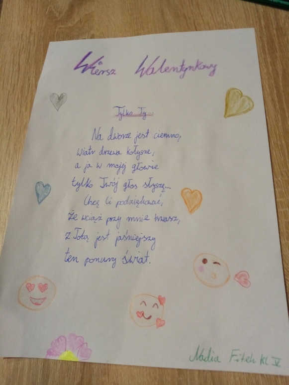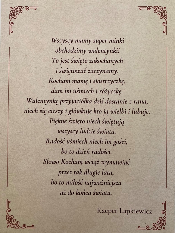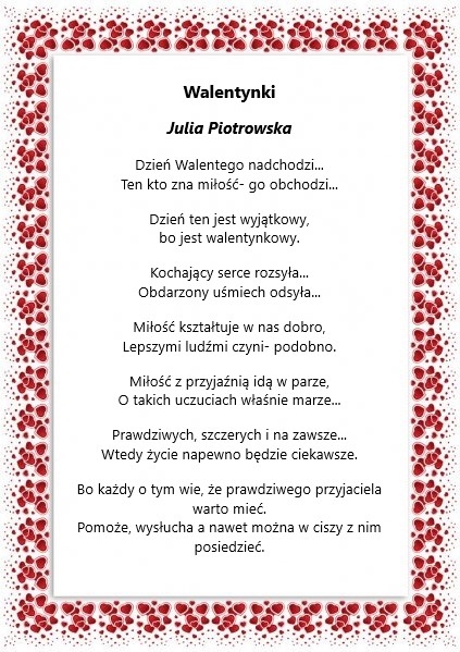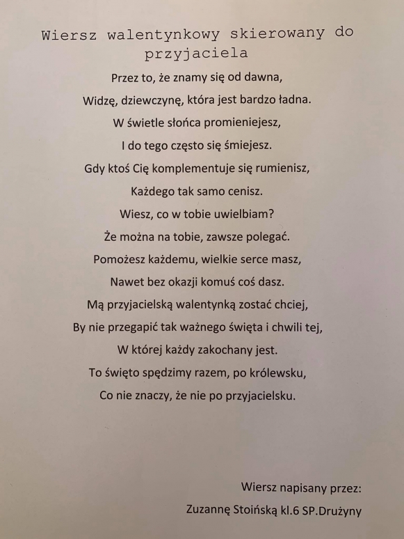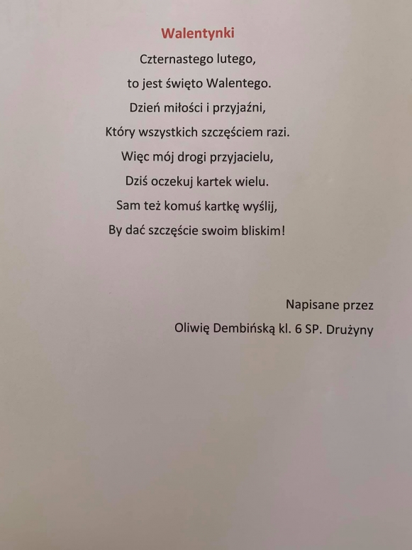 W ramach Dnia Świętego Walentego Samorząd Uczniowski zorganizował konkurs. Regulamin konkursu przewidywał trzy grupy wiekowe, z których każda miała inne zadanie. Najmłodsi uczniowie mieli do wykonania kartkę walentynkową. Reprezentanci klas IV-VI napisanie wiersza. Natomiast najstarsza młodzież, czyli uczniowie z klas VII-VII listu. Konkurs cieszył się dużym zainteresowaniem, a dzieci i młodzież zaprezentowali bardzo interesujące, oryginalne kartki walentynkowe, wiersze i listy.