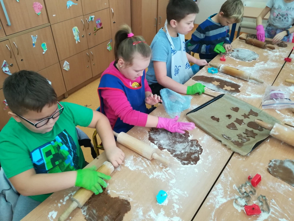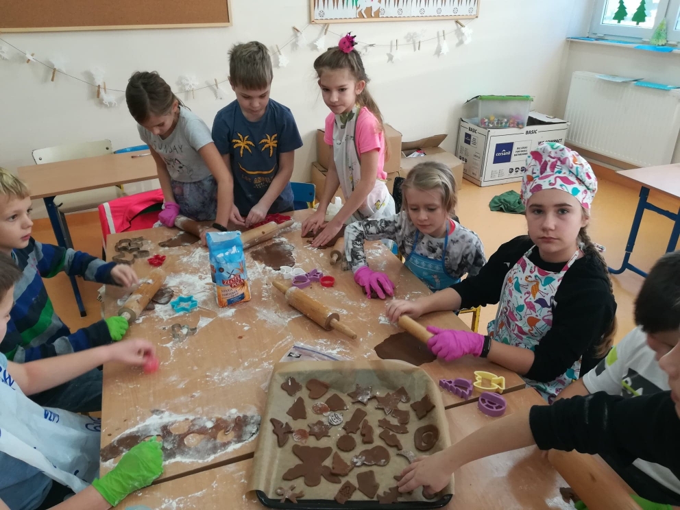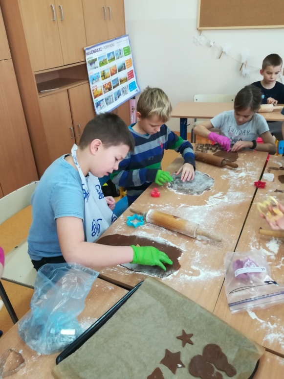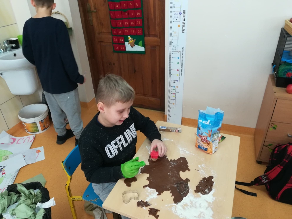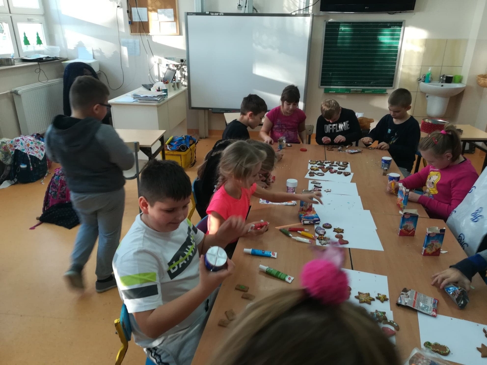 „Przedświąteczna gorączka” sprawiła, że uczniowie klasy III piekli w szkole pierniki. Była to okazja do ukazania piękna Świąt Bożego Narodzenia, poznania tradycji i zwyczajów świątecznych. Dzieci z wielką radością wałkowały ciasto, wycinały foremkami różne kształty związane z motywami bożonarodzeniowymi, z ogromną frajdą uczestniczyły w procesie pieczenia ciastek. Upieczone już pierniczki dekorowały jadalnymi ozdobami i kolorowym lukrem. Oczywiście skosztowanie własnoręcznie wykonanych, pachnących pierniczków było największą przyjemnością.