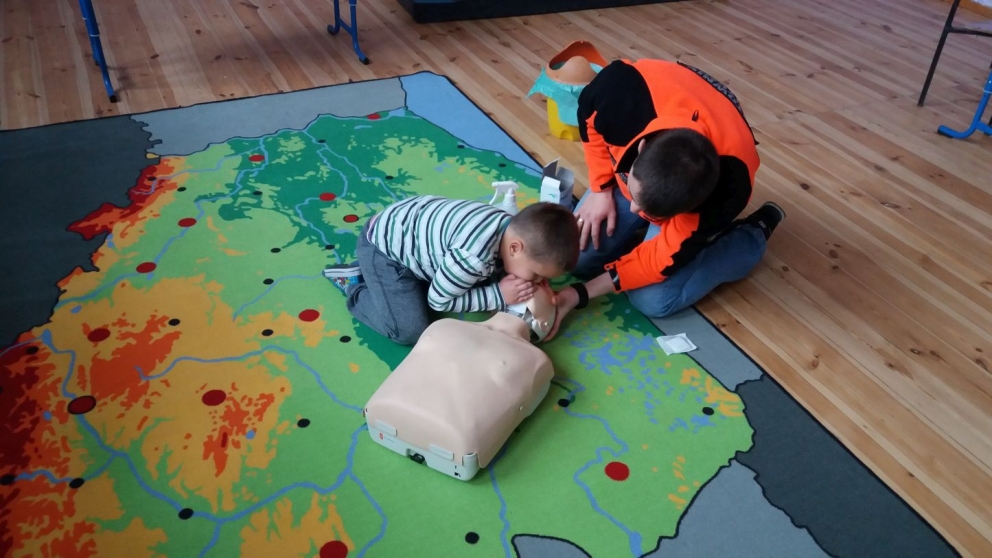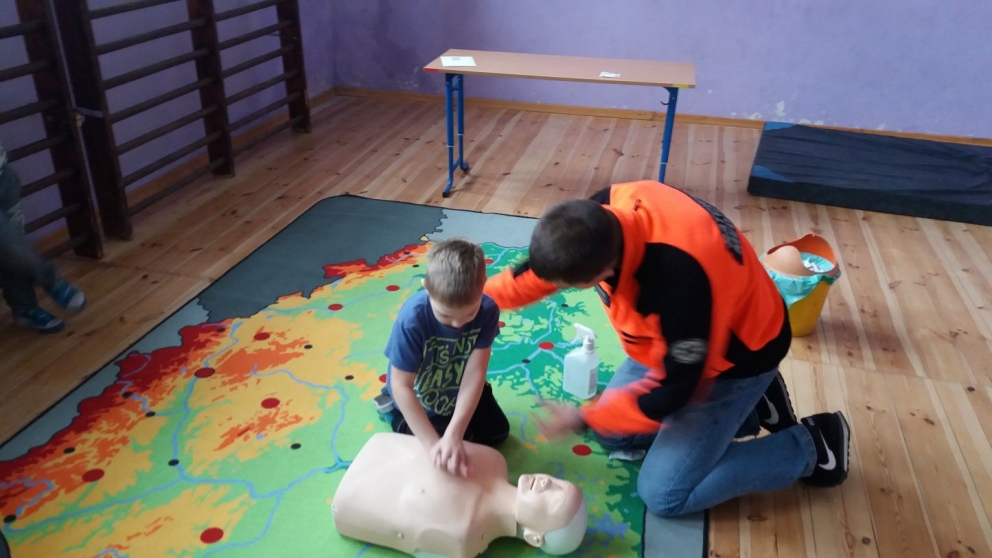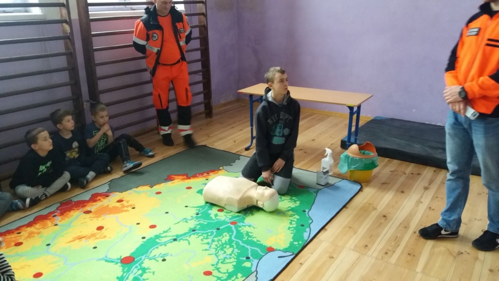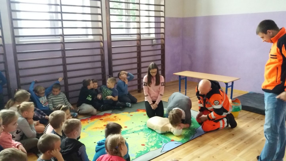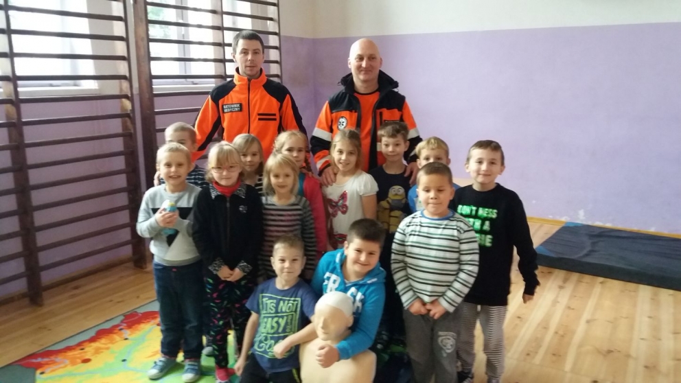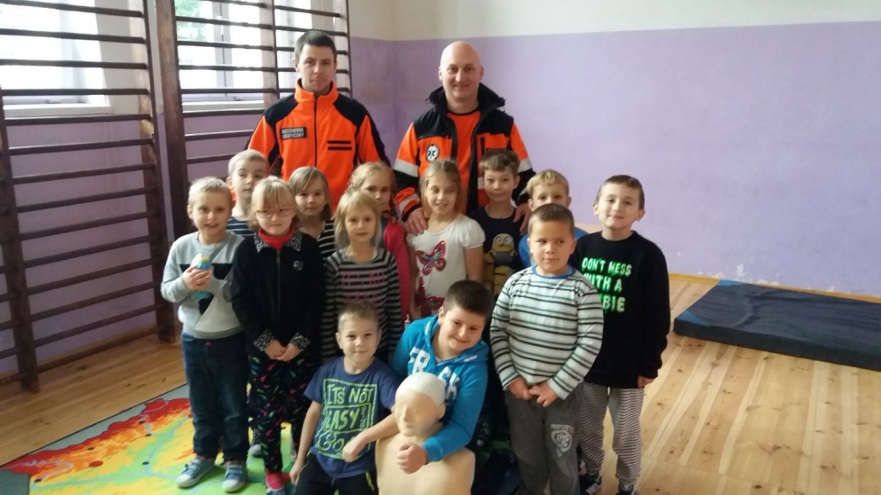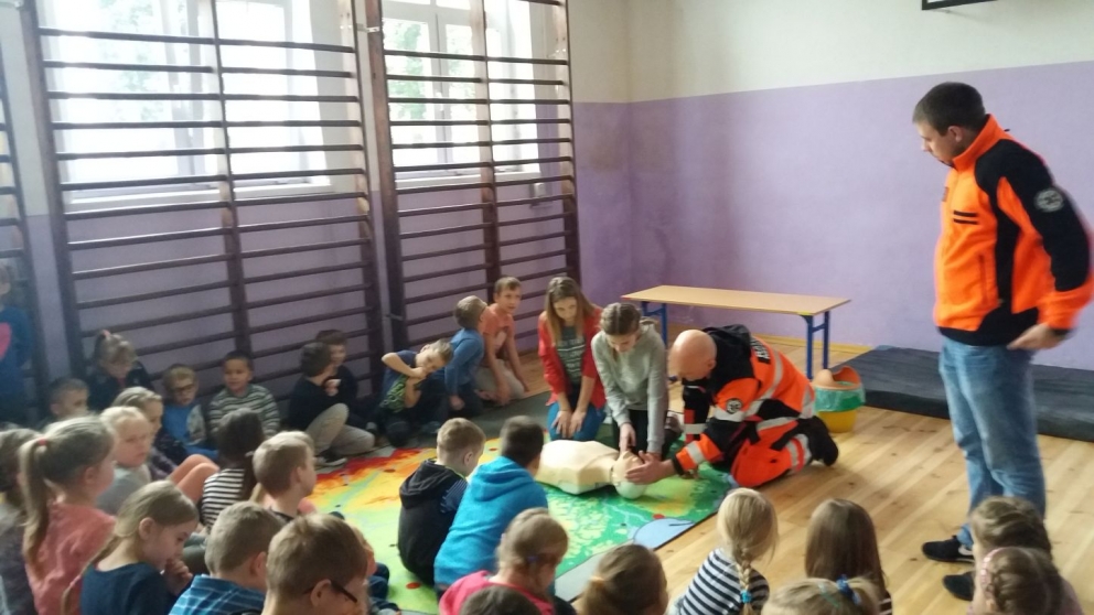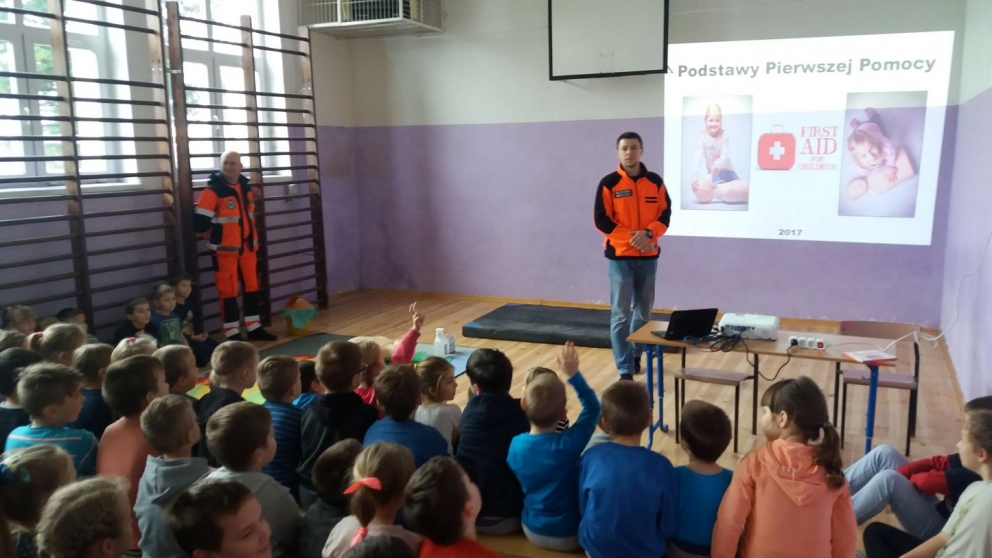 Dnia 27.11.2017 w naszej szkole odbyło się spotkanie z ratownikami medycznymi. Celem zajęć przeprowadzonych przez wykwalifikowanych specjalistów medycznych było przygotowanie uczniów do wykonywania prostych czynności udzielania pierwszej pomocy oraz prawidłowego zachowania się w czasie wypadku, w sytuacjach zagrożenia życia lub zdrowia. Na samym początku pan ratownik wyjaśnił, na czym polega jego praca oraz czym zajmują się poszczególne służby ratunkowe. Następnie dzieci miały okazję wysłuchać informacji na temat udzielania pierwszej pomocy w przypadku oparzeń, skaleczeń, zasłabnięć i złamań. Dzieci uczyły się jak należy sprawdzać przytomność osoby poszkodowanej i w jaki sposób można komuś pomóc zanim przyjedzie pogotowie ratunkowe. Poza tym utrwaliły sobie numery alarmowe służb ratowniczych oraz zasady bezpiecznej zabawy.  Zdobyta wiedza i ćwiczenia praktyczne sprawiły, że dzieci poczuły się „małymi ratownikami”.