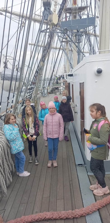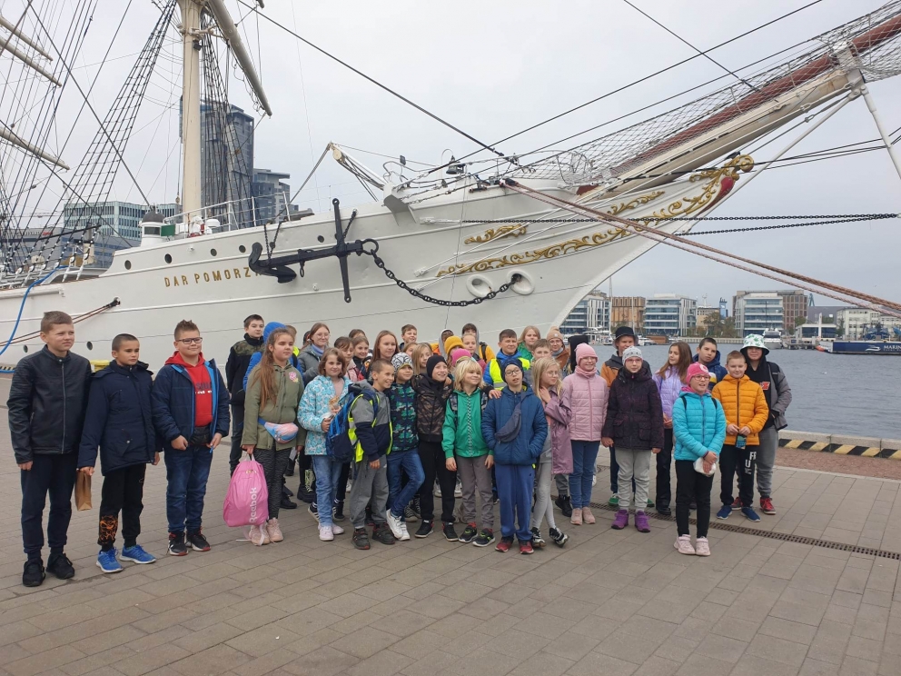 W ramach programu „Poznaj Polskę” uczniowie klasy IV, V, VII uczestniczyli w wycieczce do Gdyni. W programie wycieczki było zwiedzanie „Daru Pomorza” – statku-muzeum, który cumuje przy gdyńskim Nabrzeżu Pomorskim, jest jednym z najważniejszych zabytków polskiego dziedzictwa morskiego ubiegłego wieku. Imponująca sylwetka żaglowca stanowi element na stałe wpisany w miejski krajobraz Gdyni, zaś wejście na główny pokład i do wnętrz statku pozwala poznać z bliska warunki życia i pracy polskich marynarzy i kadry oficerskiej. W zabytkowych przestrzeniach, takich jak salon komendanta, mesa, szpital, stanowiska sterowe czy maszynownia, zachowane zostały artefakty dokumentujące historię żaglowca i jego załóg, a miejscem szczególnym jest zaaranżowana kabina słynnego pisarza, kpt. ż. w. Karola Olgierda Borchardta. Kolejnym punktem programy był spacer wzdłuż plaży i wspólny obiad. Na zakończenie uczniowie zwiedzali interaktywne wystawy w Centrum Nauki Experyment. To miejsce zaprasza każdego i zachęca do odkrywania i poznawania świata.