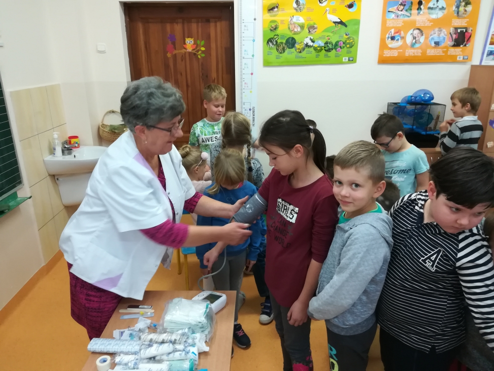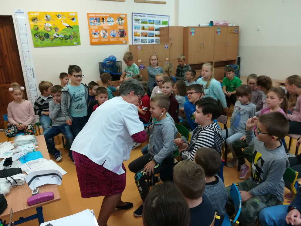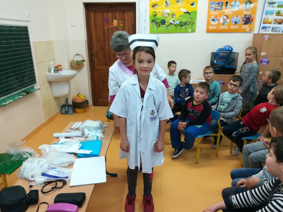 Zapewne każdy z nas, np. podczas wizyty u lekarza, spotkał pielęgniarkę. Wiemy, że ubiera się ona w biały fartuch, robi zastrzyki, pomaga chorym dzieciom i dorosłym. 26 października najmłodsi uczniowie naszej szkoły mieli okazję lepiej poznać ten zawód podczas spotkania z panią, która, na co dzień pracuje, jako pielęgniarka. Naszym gościem była babcia uczennicy klasy II Wiktorii Badaczewskiej pani Wiesława Badaczewska. Nasz gość w bardzo ciekawy sposób opowiedział, na czym polega ta praca, jak jest trudna a jednocześnie przynosząca dużo radości. Dzieci mogły dokładnie obejrzeć przyrząd do mierzenia ciśnienia, cukru, temperatury oraz zobaczyć, jak prawidłowo powinien być wykonany zastrzyk. Mieli okazję posłuchać bicia własnego serduszka przy użyciu stetoskopu. Nie zabrakło bandażowania, robienia opatrunków i mierzenia poziomu cukru. Na zakończenie spotkania pani pielęgniarka podarowała każdemu ze słuchaczy upominek w postaci czekoladek oraz długopisu-strzykawki. Ponadto podarowała naszej szkole uzupełnienie apteczki w postaci bandaży, plastrów, kompresów itp. Składamy serdeczne podziękowania pani Wiesi Badaczewskiej, która już drugi rok z rzędu odwiedziła naszą szkołę. Podzieliła się z dziećmi swoją wiedzą, poświęciła im swój czas