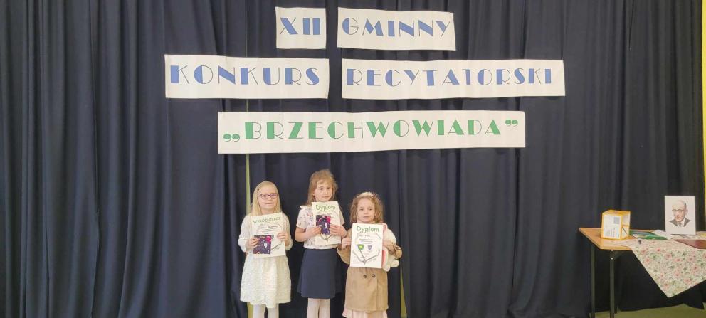 10 kwietnia uczniowie naszej szkoły pojechali na rozstrzygnięcie Gminnego Konkursu Recytatorskiego „Brzechwowiada”, które odbyło się w Szkole Podstawowej Dywizjonu 303 w Małkach. Reprezentowały nas: Kępska Laura, Markowska Natalia, Zofia Pilawa, Wanda Okrasa oraz Zofia Krzepicka. Wszystkie dziewczynki otrzymały dyplomy, bony upominkowe oraz słodycze.