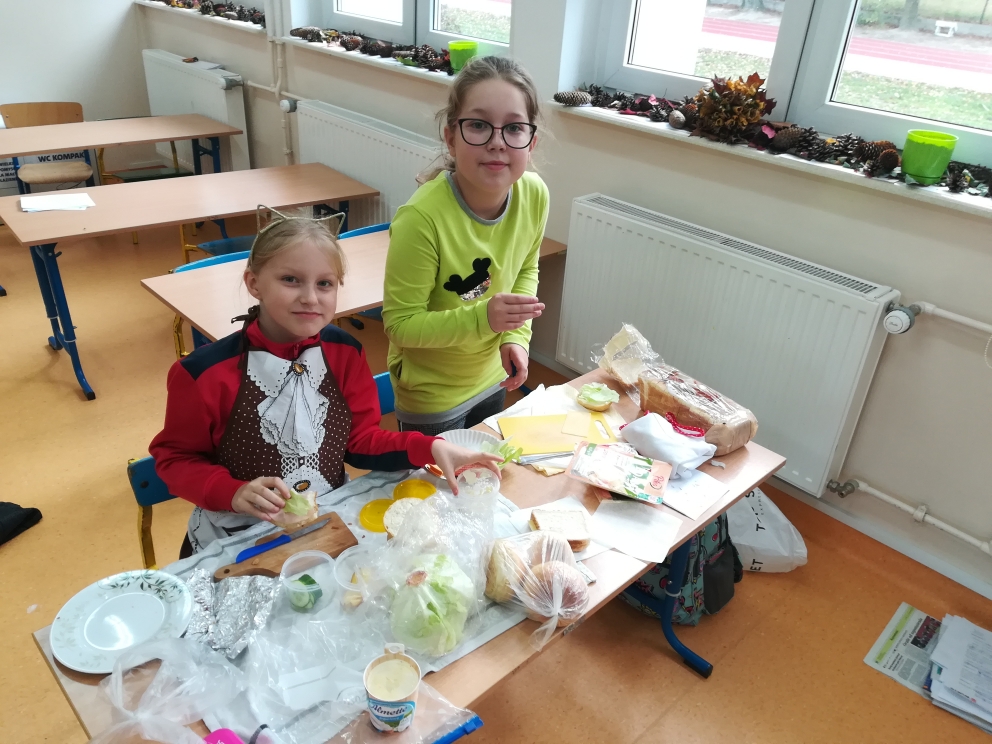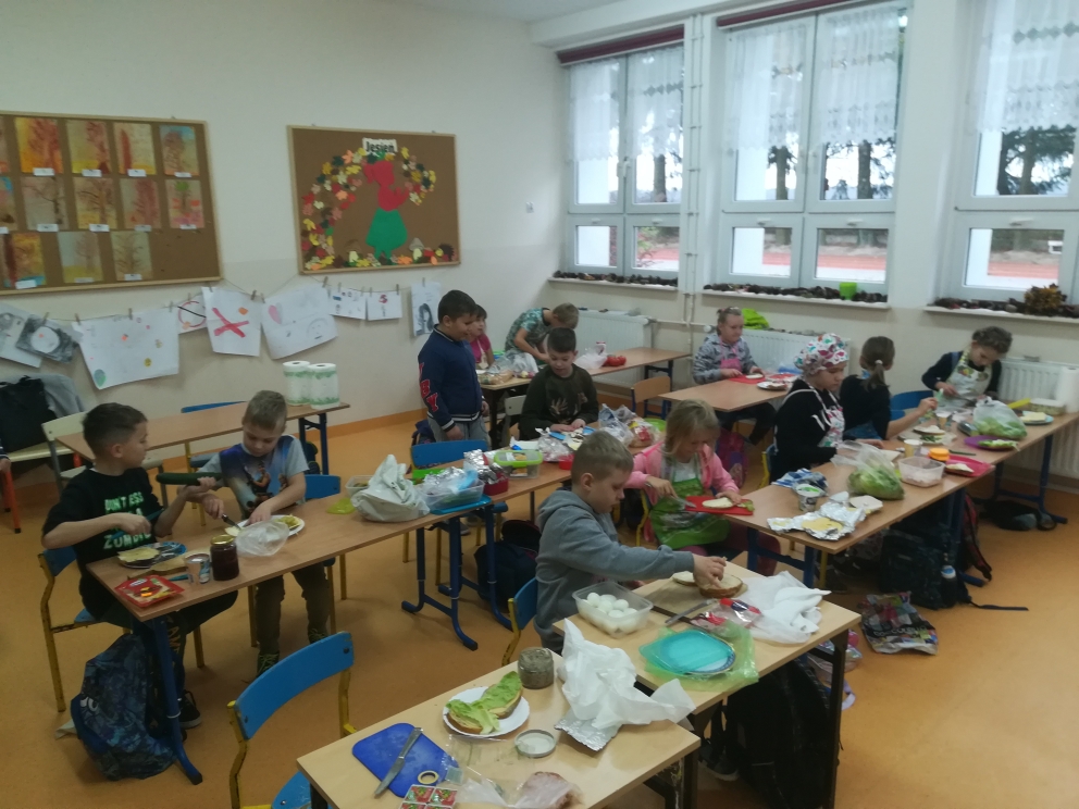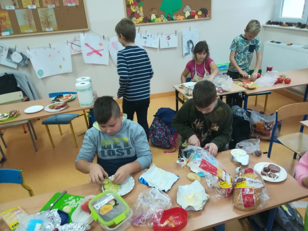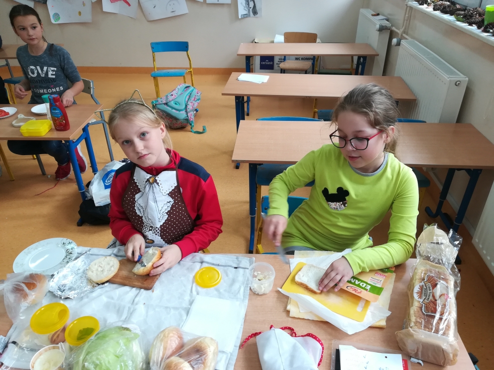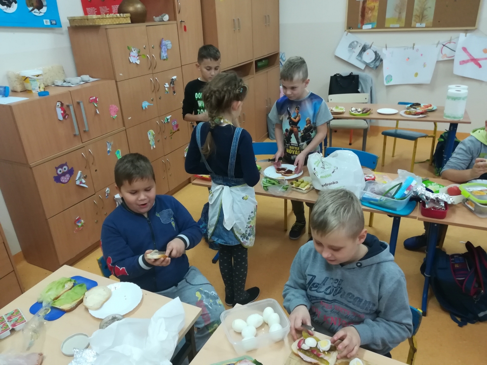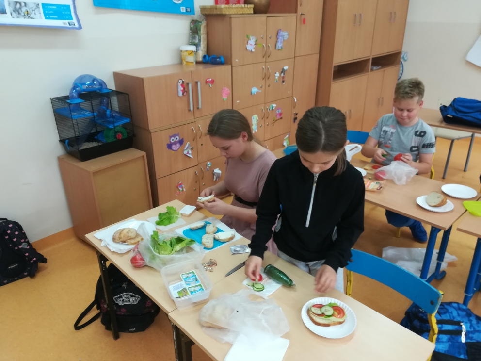 Kształtowanie dobrych nawyków żywieniowych od najmłodszych lat to bardzo ważna sprawa. Uczniowie z klasy III i IV na zajęciach lekcyjnych sami robili kanapki. Wcześniej rozmawiali o zasadach zdrowego odżywiania, m.in. o tym jak komponować posiłki, jak łączyć smaki, jakie produkty należy jeść, żeby być zdrowym, dlaczego należy się zdrowo odżywiać i jeść śniadanie? Dzieci przyniosły do szkoły potrzebne produkty. Można śmiało powiedzieć, że zadanie wykonały doskonale. Kanapki nie tylko były smaczne i zdrowe, ale także pięknie ozdobione i pełne witamin. Pamiętać należy, że najlepiej smakują kanapki wykonane własnoręcznie. I ta maksyma sprawdziła się tu doskonale, gdyż największe niejadki zjadały swoją porcję z apetytem.