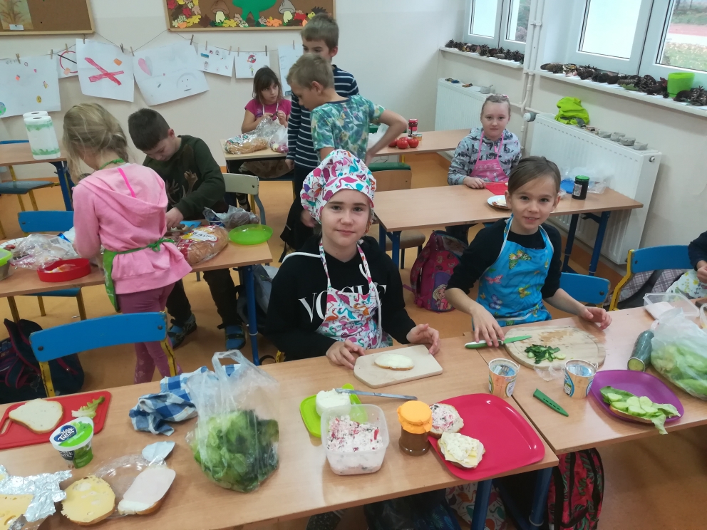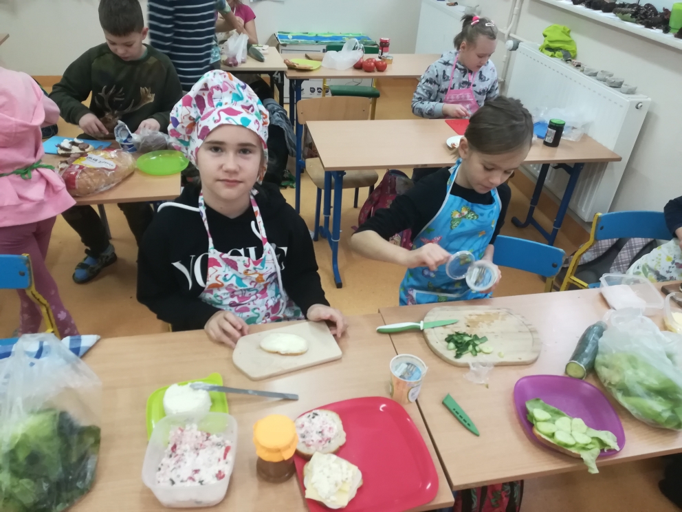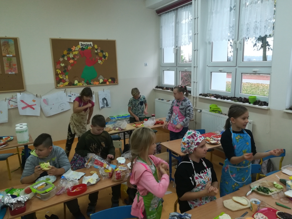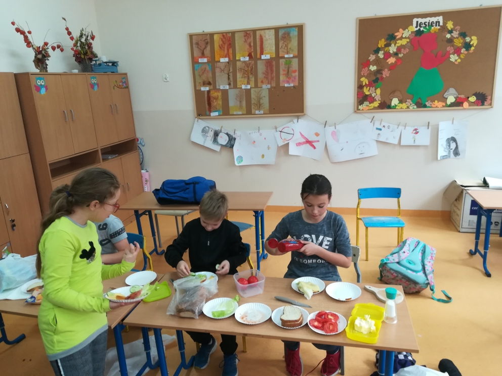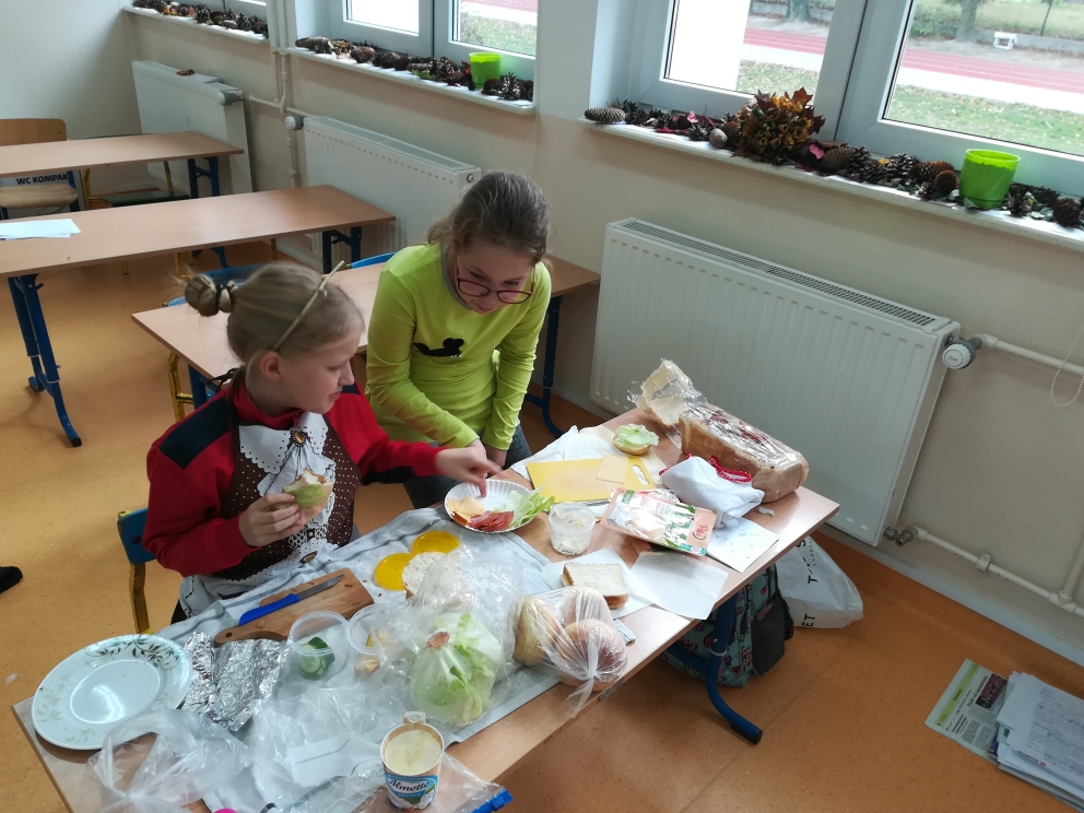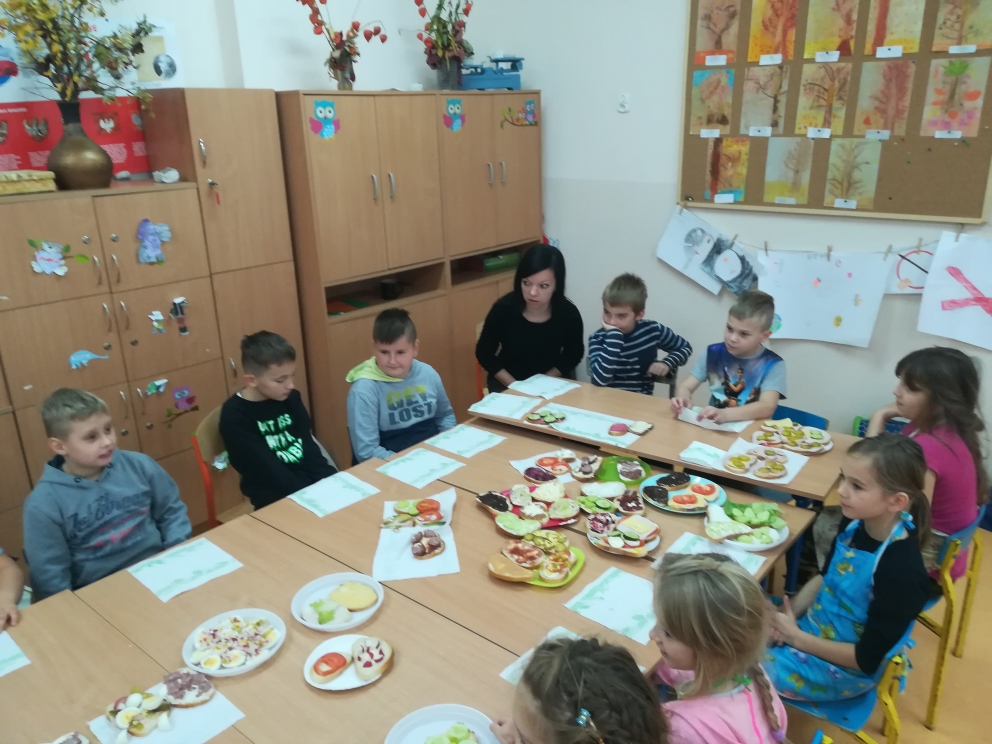 Kształtowanie dobrych nawyków żywieniowych od najmłodszych lat to bardzo ważna sprawa. Uczniowie z klasy III i IV na zajęciach lekcyjnych sami robili kanapki. Wcześniej rozmawiali o zasadach zdrowego odżywiania, m.in. o tym jak komponować posiłki, jak łączyć smaki, jakie produkty należy jeść, żeby być zdrowym, dlaczego należy się zdrowo odżywiać i jeść śniadanie? Dzieci przyniosły do szkoły potrzebne produkty. Można śmiało powiedzieć, że zadanie wykonały doskonale. Kanapki nie tylko były smaczne i zdrowe, ale także pięknie ozdobione i pełne witamin. Pamiętać należy, że najlepiej smakują kanapki wykonane własnoręcznie. I ta maksyma sprawdziła się tu doskonale, gdyż największe niejadki zjadały swoją porcję z apetytem.