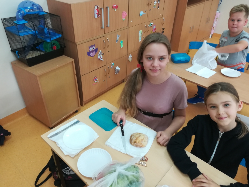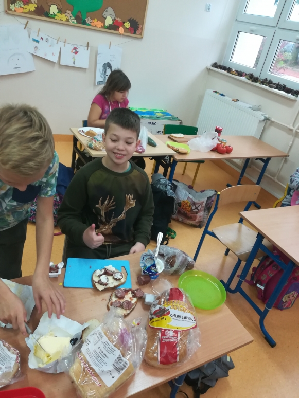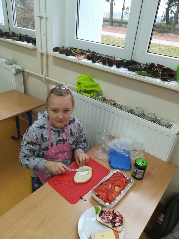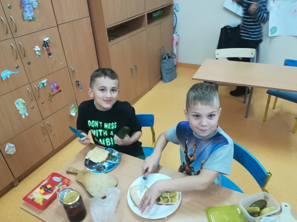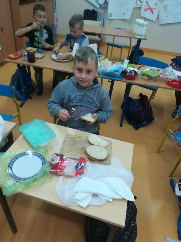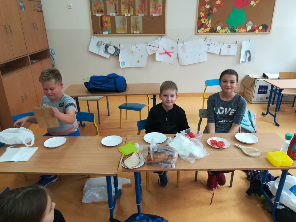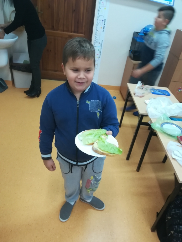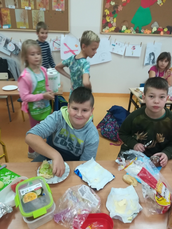 Kształtowanie dobrych nawyków żywieniowych od najmłodszych lat to bardzo ważna sprawa. Uczniowie z klasy III i IV na zajęciach lekcyjnych sami robili kanapki. Wcześniej rozmawiali o zasadach zdrowego odżywiania, m.in. o tym jak komponować posiłki, jak łączyć smaki, jakie produkty należy jeść, żeby być zdrowym, dlaczego należy się zdrowo odżywiać i jeść śniadanie? Dzieci przyniosły do szkoły potrzebne produkty. Można śmiało powiedzieć, że zadanie wykonały doskonale. Kanapki nie tylko były smaczne i zdrowe, ale także pięknie ozdobione i pełne witamin. Pamiętać należy, że najlepiej smakują kanapki wykonane własnoręcznie. I ta maksyma sprawdziła się tu doskonale, gdyż największe niejadki zjadały swoją porcję z apetytem.