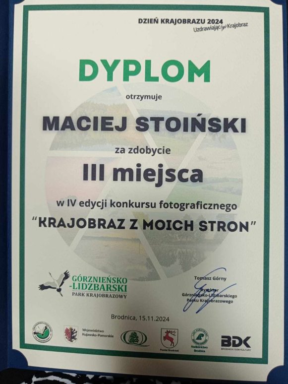 15 listopada w Brodnickim Domu Kultury odbyło się uroczyste wręczenie nagród laureatom konkursu fotograficznego „Krajobraz z moich stron”. Konkurs zorganizowany był przez Górznieńsko-Lidzbarski Park Krajobrazowy we współpracy z Powiatem Brodnickim z okazji przypadającego 20 października „Międzynarodowego Dnia Krajobrazu”. Wśród zwycięzców znalazł się uczeń naszej szkoły Maciek Stoiński, którego praca znalazła się na III miejscu.
