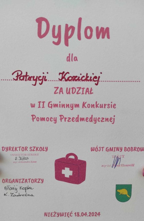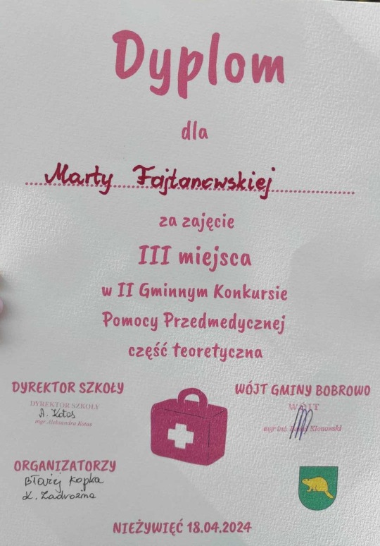 18 kwietnia troje ósmoklasistów z naszej szkoły udało się do Szkoły Podstawowej w Nieżywięciu, gdzie obył się II Gminny Konkurs Pomocy Przedmedycznej. Nasza reprezentacja w składzie: Marta Fajtanowska, Michał Misiak oraz Patrycja Kozicka wywalczyła grupowo II miejsce. Ponadto Marta Fajtanowska indywidualnie zajęła miejsce III. Wszyscy uczniowie otrzymali dyplomy i upominki. Gratulujemy!!!