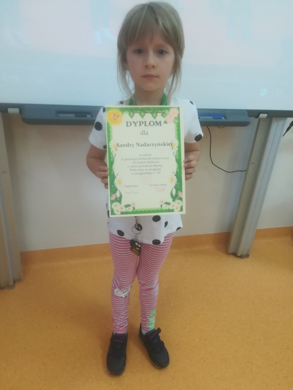 Uczniowie naszej szkoły brali udział w Gminnym Konkursie „Stop smogowi”, którego organizatorem była Szkoła Podstawowa w Kruszynach. Uczeń klasy I Karol Szulc zajął I miejsce. Natomiast Uczennica klasy II Sandra Nadarzyńska otrzymała wyróżnienie. Uczniowie otrzymali dyplomy i nagrody.