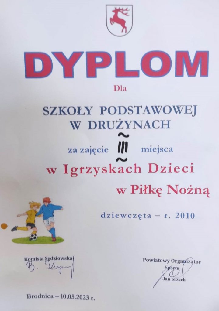10 maja dziewczęta z naszej szkoły wzięły udział w zawodach sportowych w piłkę nożną. Rozgrywki sportowe odbyły się w Brodnicy. Dziewczęta wywalczyły III miejsce.