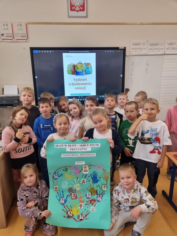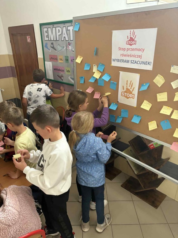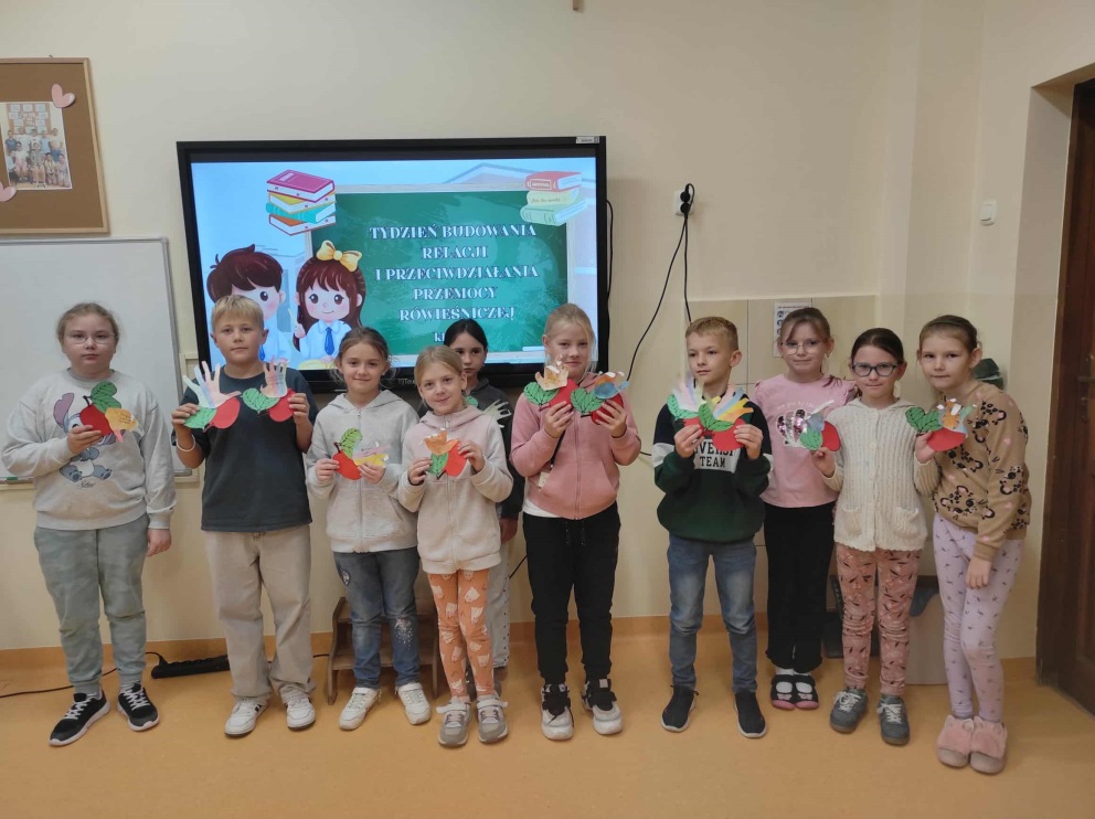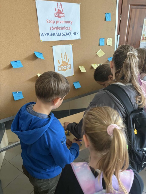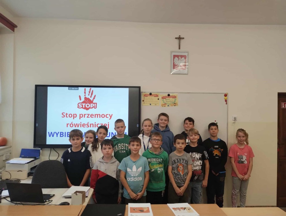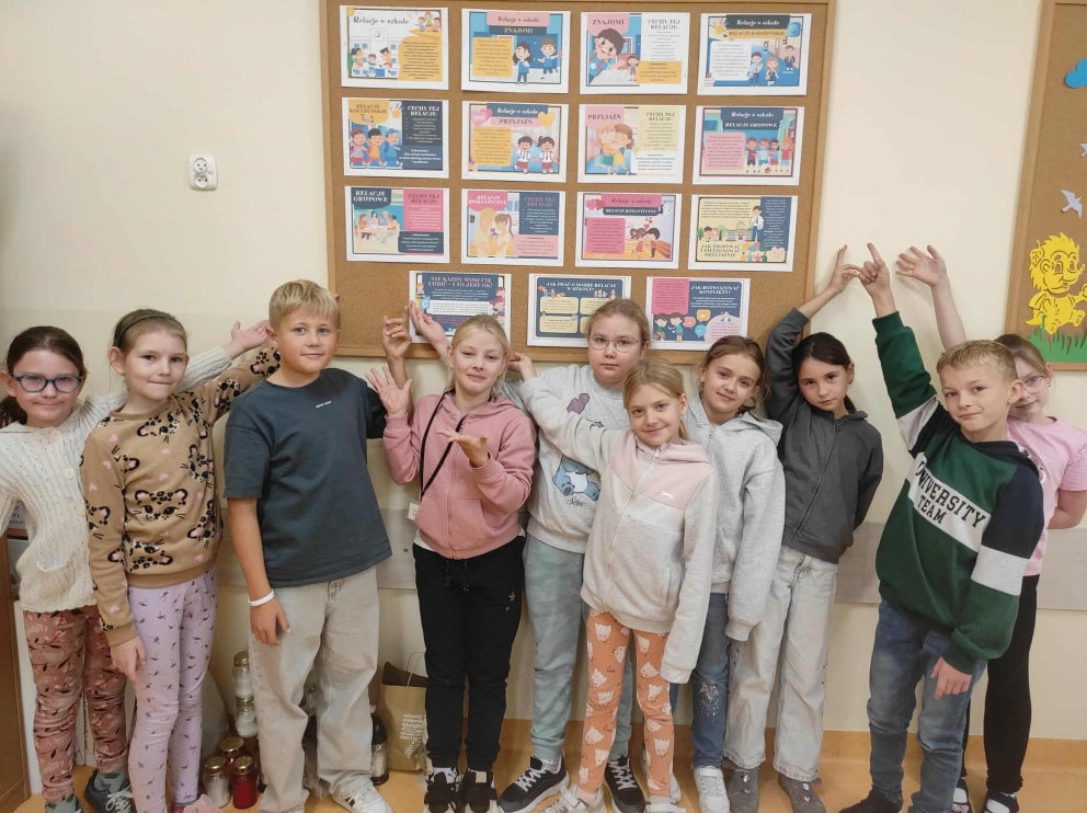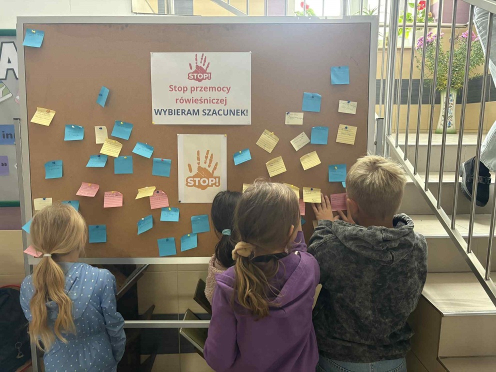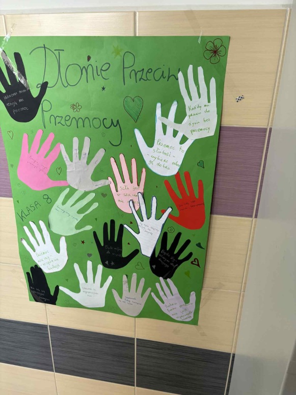 W dniach 29 września – 3 października 2025 roku w naszej szkole odbył się Tydzień Przeciwdziałania Przemocy Rówieśniczej, podczas którego każdego dnia uczniowie podejmowali działania promujące empatię, wzajemny szacunek i wsparcie. W poniedziałek powstała Ściana dobrych uczynków — uczniowie przyczepiali karteczki z przykładami pozytywnych działań, które sami wykonali lub za które byli świadkami. We wtorek klasy ustawiły się, tworząc żywy napis „STOP PRZEMOCY”, w geście wspólnego sprzeciwu wobec agresji. Środa była dniem „Ręce przeciw przemocy” — uczniowie odrysowywali swoje dłonie i wpisywali w nie wartości, które chcą pielęgnować w relacjach z innymi. W czwartek zadanie „Znajdź kogoś…” zachęcało do odnalezienia kolegi lub koleżanki o podobnych zainteresowaniach albo osoby, która dziś komuś pomogła, co sprzyjało rozmowom i budowaniu więzi. Piątek przyniósł podsumowanie — oprócz quizu, odbył się uroczysty apel z okazji Dnia Patrona, który stał się symbolicznym ukoronowaniem całego tygodnia działań. Ten apel miał szczególny wymiar: przypomniał nam, że to, jak odnajdujemy się każdego dnia wobec siebie nawzajem — z życzliwością, zrozumieniem i odpowiedzialnością — jest tak samo ważne jak wielkie osiągnięcia. Przemówienia na apelu zachęcały, by inspirować się postawą naszej Patronki, być przykładem dla innych, dbać o siebie nawzajem i wspólnie tworzyć atmosferę zaufania, wsparcia i wzajemnej pomocy w całej społeczności szkolnej. Równolegle przez cały tydzień prowadzone były zajęcia przez pedagoga specjalnego i psychologa szkolnego. Uczniowie poznawali, czym jest przemoc — zarówno fizyczna, psychiczna, słowna, jak i cyberprzemoc — jakie są jej przyczyny oraz skutki, a także w jaki sposób można jej zapobiegać i jak reagować — zarówno jako osoba doświadczająca przemocy, jak i świadek. Dodatkowo uczniowie zdobywali umiejętności z zakresu asertywności, komunikacji bez przemocy, radzenia sobie z konfliktami i emocjami. Ten tydzień działań znacząco wpłynął na wzrost świadomości w naszej społeczności szkolnej. Mamy nadzieję, że to, co udało się zainspirować w tych dniach, zaowocuje trwałymi zmianami — by nasza szkoła zawsze była miejscem bezpiecznym, wspierającym i pełnym wzajemnej życzliwości.