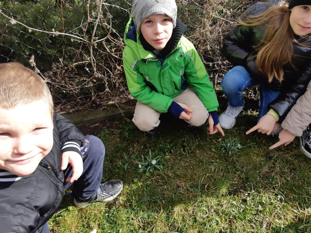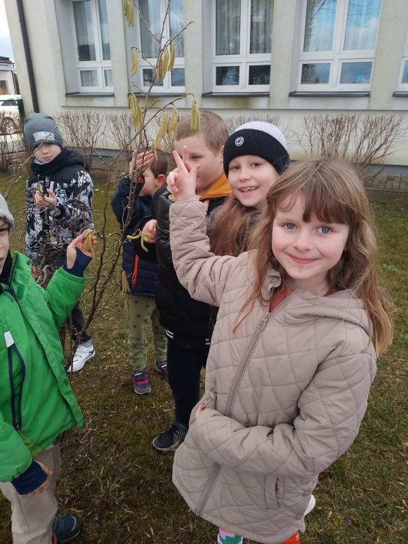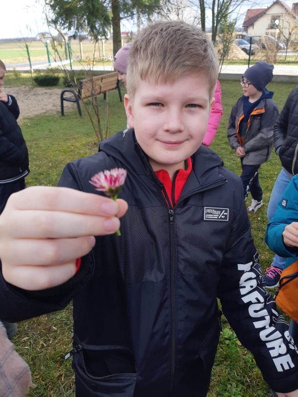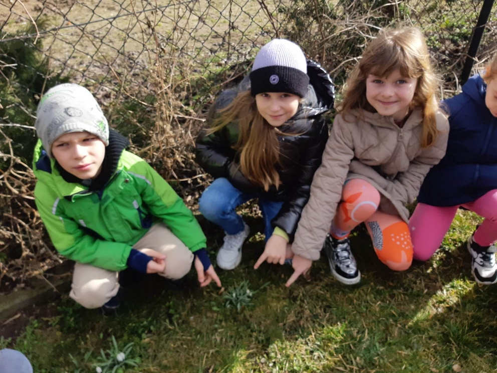 W dniu dzisiejszym uczniowie naszej szkoły udali się na spacer po najbliżej okolicy w celu poszukiwania oznak wiosny. Spacerowicze znaleźli przebiśniegi i stokrotki. Zauważyli, że niektóre krzewy mają już pąki. Po powrocie do szkoły rozwiązywali krzyżówki i łamigłówki o tematyce wiosennej. Kolorowali obrazki. Z okazji pierwszego dnia wiosny cała społeczność szkolna otrzymała z rąk przedstawicieli Samorządu Uczniowskiego słodkie, „co nieco”