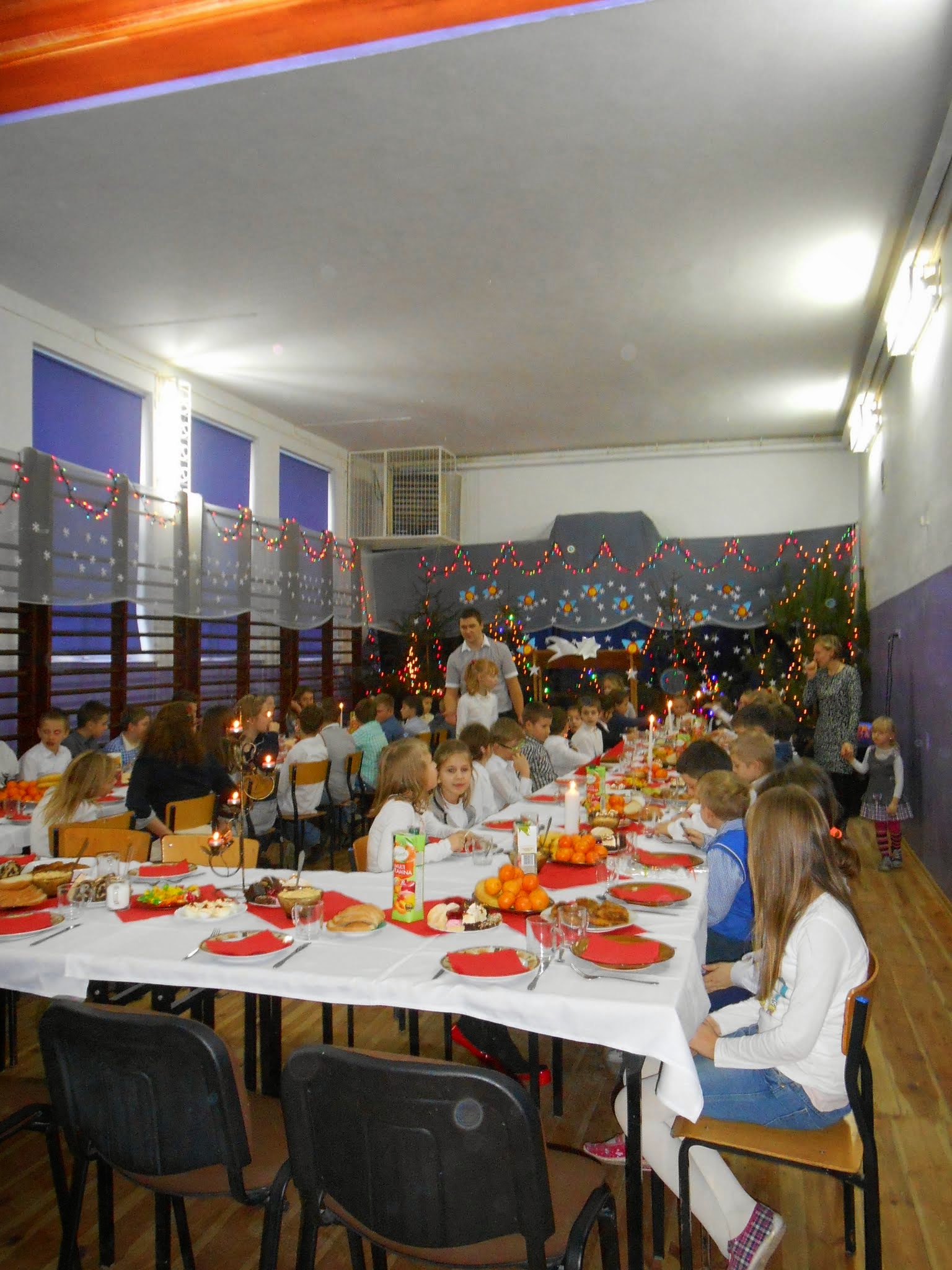 W naszej szkole odbyły się dwa spotkania opłatkowe. Pierwsze odbyło się w czwartek 18 grudnia. Było to spotkanie dzieci uczestniczących w zajęciach świetlicy środowiskowej. Przy wspaniałej dekoracji , pysznym jedzeniu przygotowanym  przez mamy naszych uczniów- p. Dorotę Kotuła i Teresę Surma i wspólnym śpiewie kolęd dzieci dzieliły się opłatkiem składając sobie życzenia.