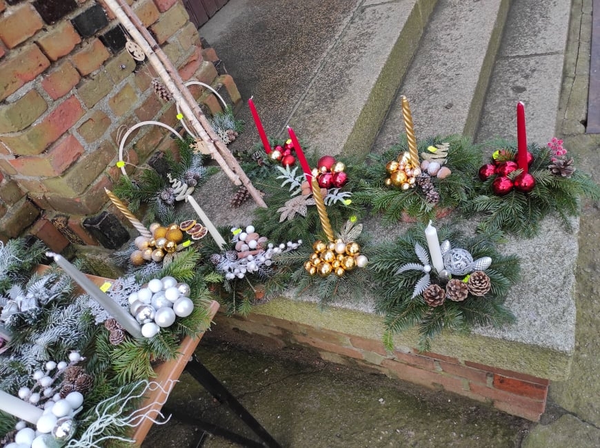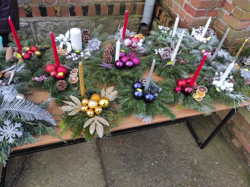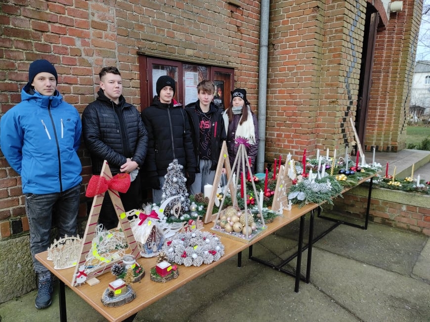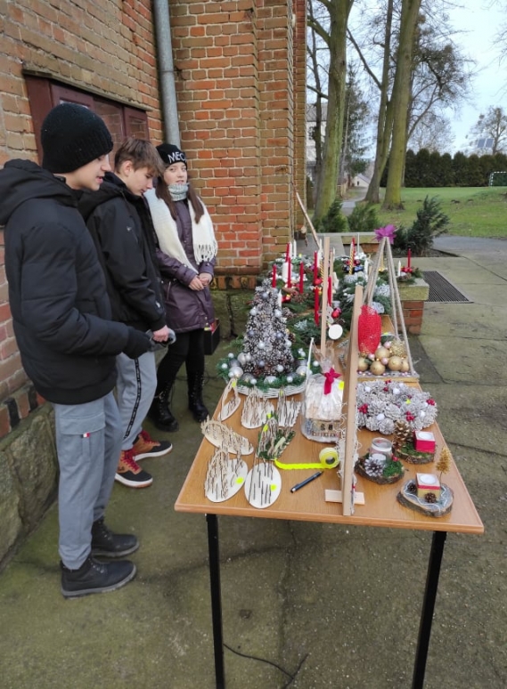 Wolontariusze przeprowadzili kiermasz ozdób bożonarodzeniowych, które zostały wykonane przez społeczność Szkoły Podstawowej im. Małgorzaty Sulek w Drużynach, Radę Rodziców oraz panie z Koła Gospodyń Wiejskich w Grzybnie.