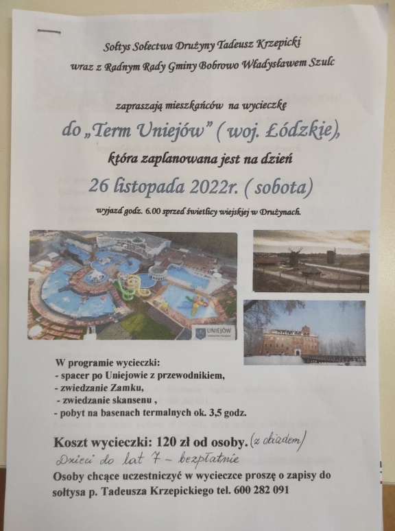 W imieniu sołtysa wsi Drużyny pana Tadeusza Krzepickiego oraz radnego pana Władysława Szulc zapraszamy na wycieczkę do Uniejowa.