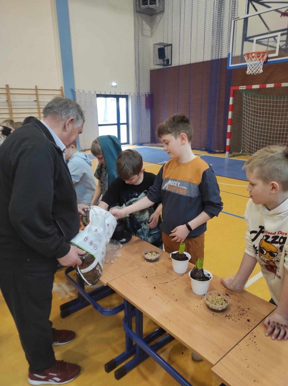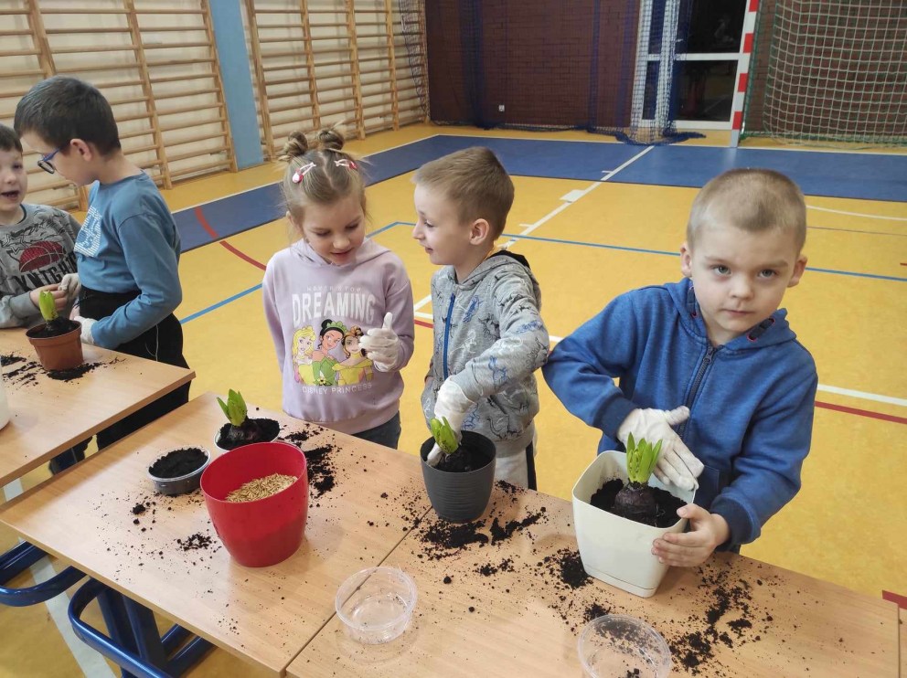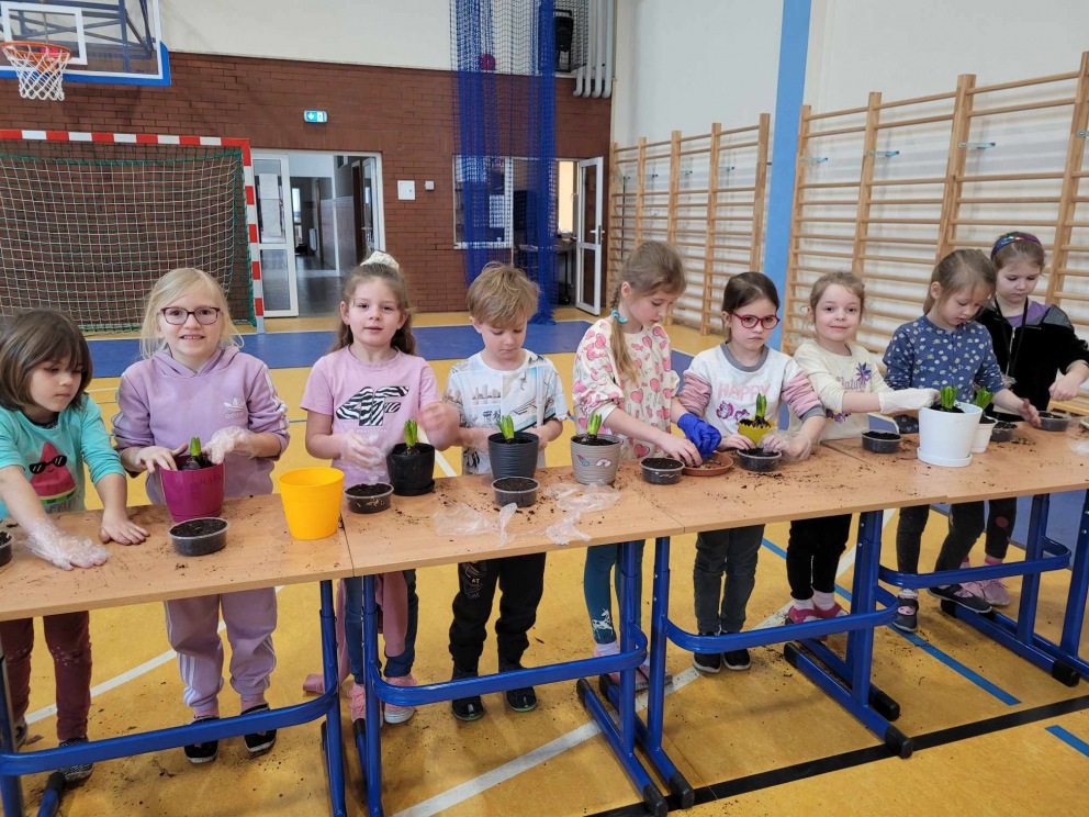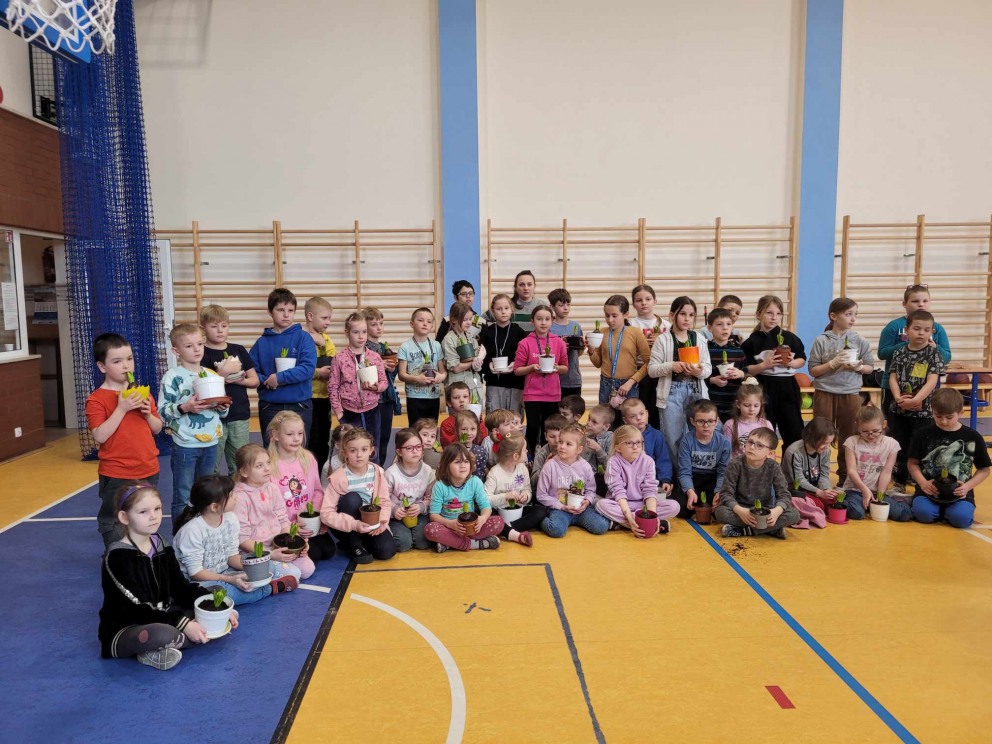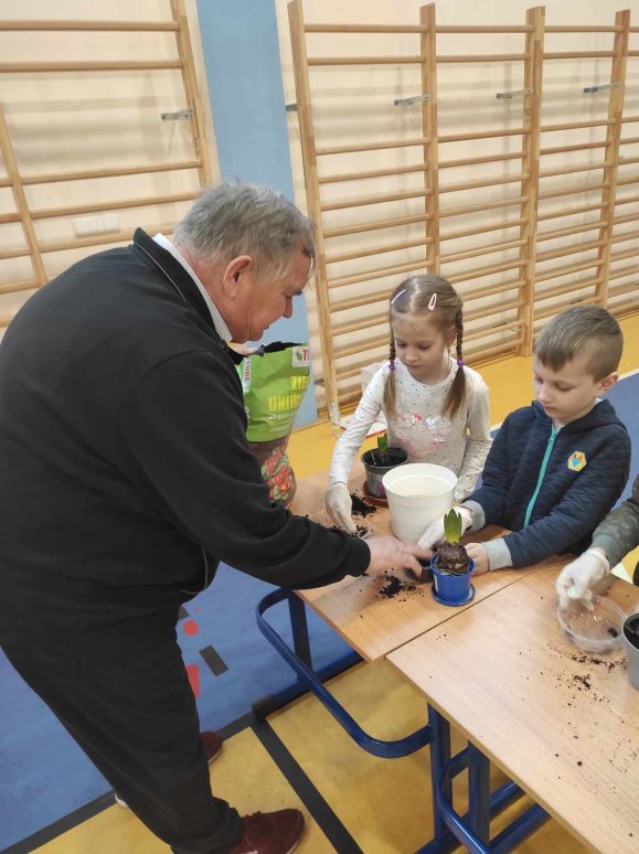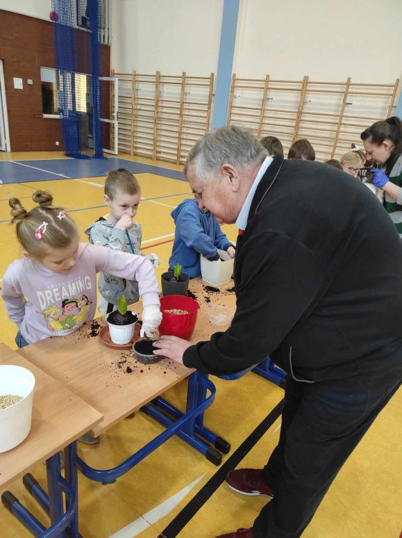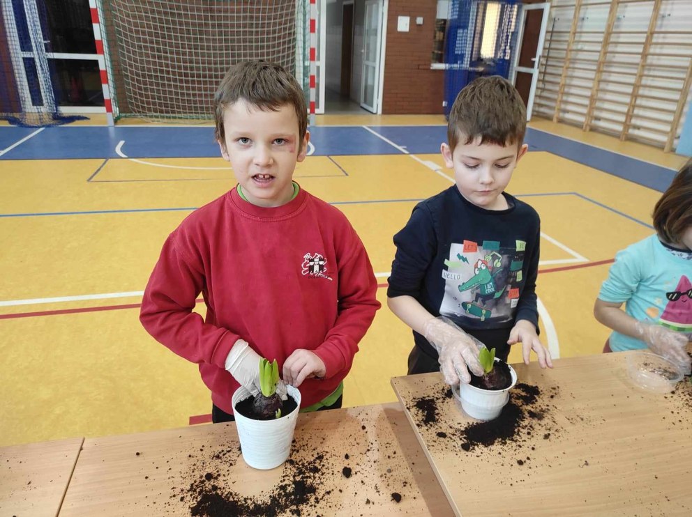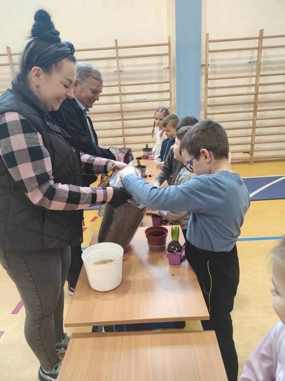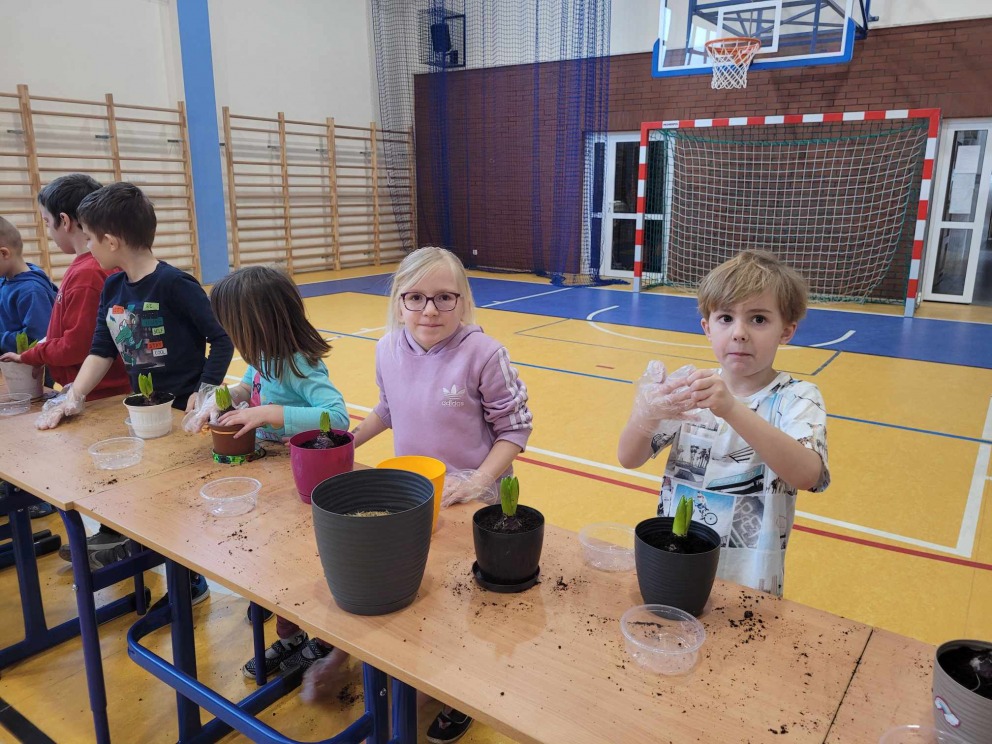 20 marca odbyły się w naszej szkole warsztaty ogrodniczo-florystyczne dla uczniów klas 0-III. Celem spotkania było zapoznanie z zawodem ogrodnika oraz poznanie technik układania kompozycji z różnorodnych materiałów. Zajęcia przeprowadził ogrodnik pan Władysław Szulc wraz z florystką panią Agnieszką Konczalską. Warsztaty rozpoczęły się częścią teoretyczną, w której pan Władysław opowiedział zgromadzonym jak uprawiać zdrowe rośliny, jak je chronić, jak o nie dbać. Wyjaśnił, dlaczego należy obcinać pędy. Uświadomił, że naturalne nawozy i opryski są niezbędne do prawidłowej uprawy roślin. Wymienił nazwy najpopularniejszych szkodników, które atakują rośliny. Następnie głos zabrała pani Agnieszka, która przedstawiła charakter swojej pracy, który polega na tym, że trzeba wykazać się znajomością różnych rodzajów kwiatów ciętych i doniczkowych. Wymieniła dodatki, które można wykorzystać przy tworzeniu bukietów. Opowiedziała, w jaki sposób dbać o kwiaty. Jak często należy je odżywiać. Uświadomiła, że rośliny należy nie tylko podlewać, ale również chronić przed trudnymi warunkami atmosferycznymi. Po części teoretycznej wszyscy zgromadzeni przystąpili do części praktycznej, która rozpoczęła się sadzeniem cebulek hiacyntów do doniczek. Następnie dzieci siały owies, który będzie piękną ozdobą wielkanocnego stołu. Po wykonanej pracy oglądały kwiaty doniczkowe i cięte. Porównywały ich wygląd, zapach, określały nazwę. Pani Agnieszka pokazała najpiękniejsze kwiaty wiosenne. Dzięki tym warsztatom dzieci miały kontakt z żywymi kwiatami, materiałami florystycznymi jak również możliwość rozwoju kreatywności, umiejętności manualnych, które są również ważne dla późniejszego rozwoju osobowości dziecka. Na zakończenie uczniowie wspólnie z florystką wykonały piękny bukiet, który został złożony na ręce pani dyrektor Bożeny Greli przez pana Władysława Szulca. Składamy serdeczne podziękowania za przeprowadzone warsztaty. Za doniczki, sadzonki, ziemię i inne materiały, które zostały podarowane przez Sklep Ogrodniczy Jakub. Dziękujemy za poświęcony nam czas oraz fachowe porady.