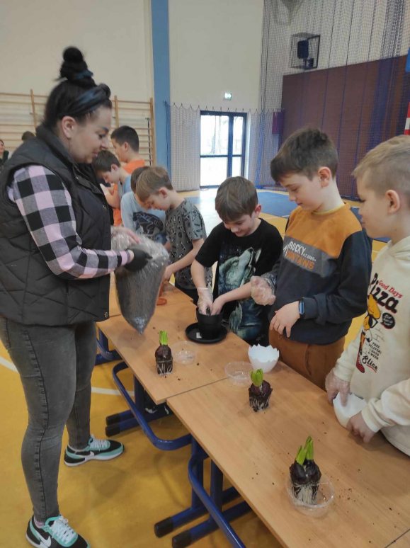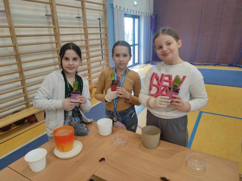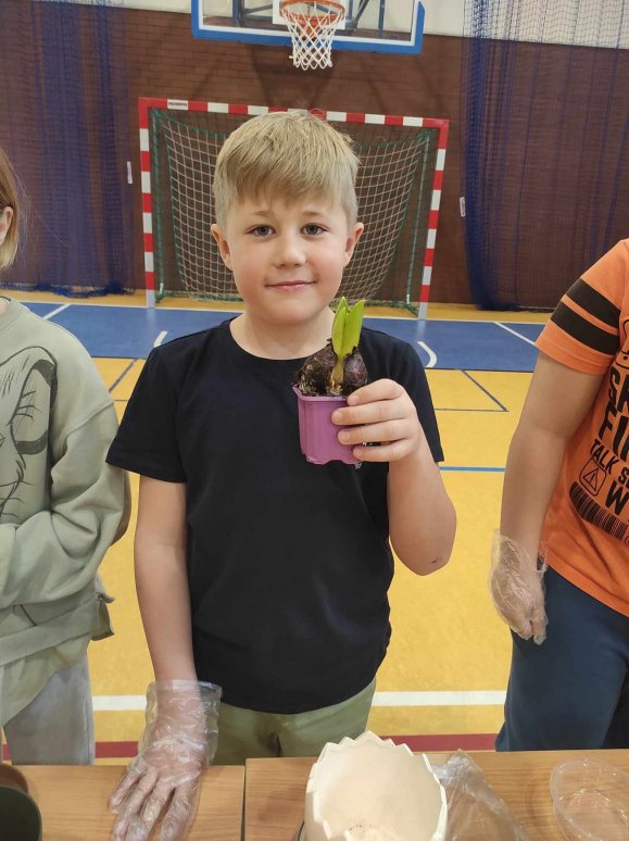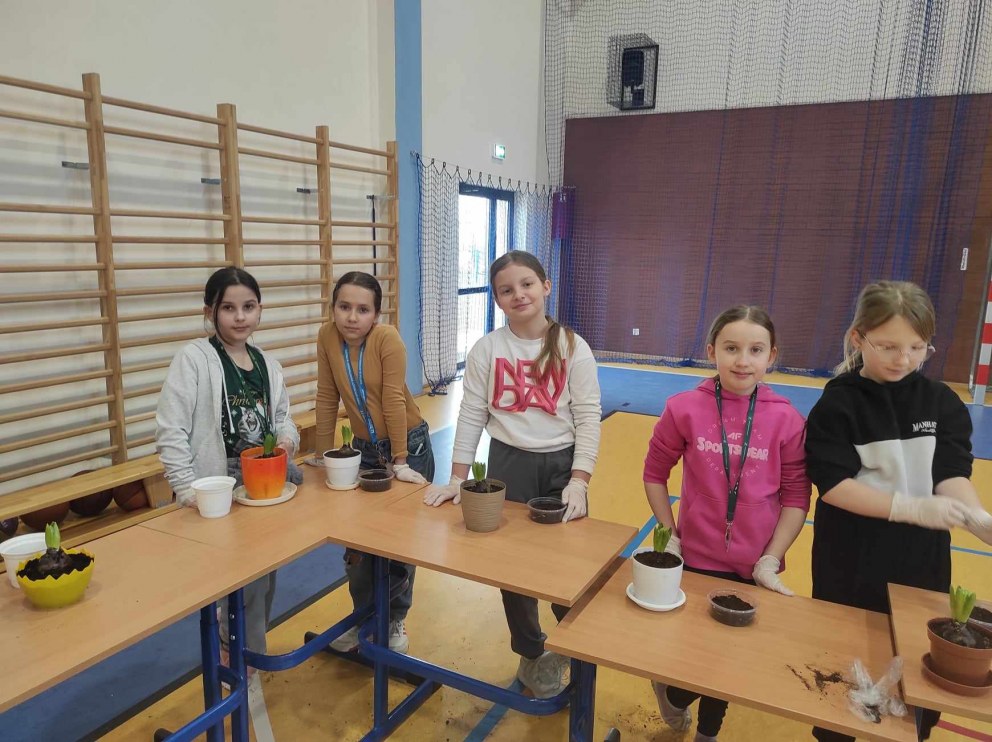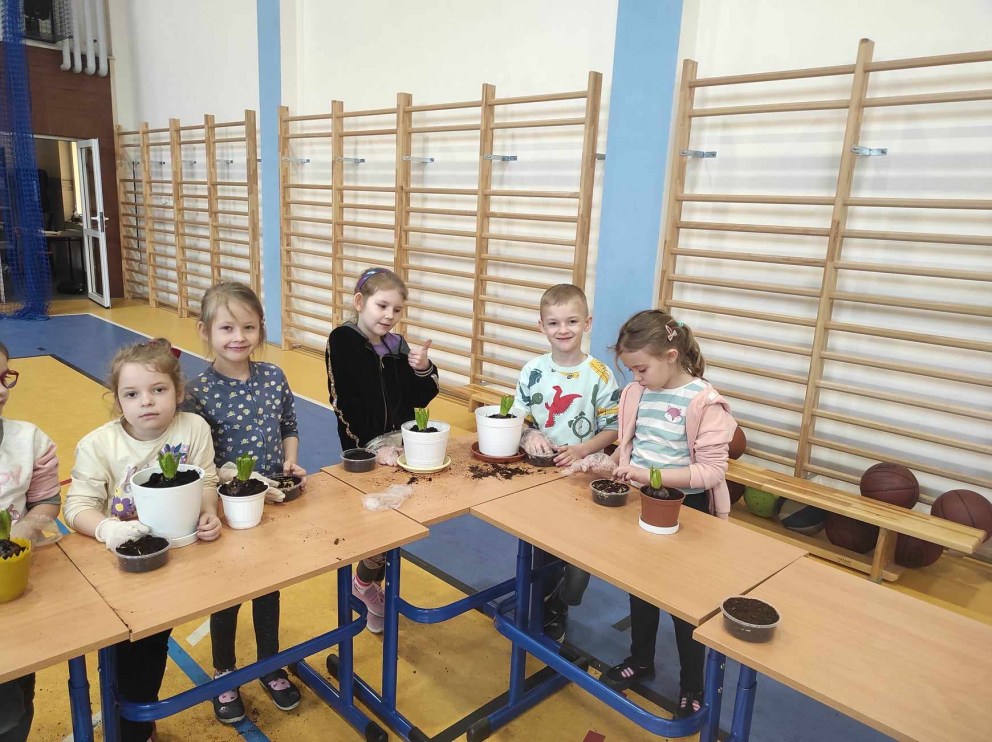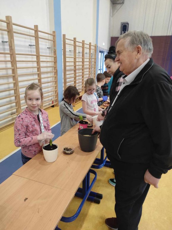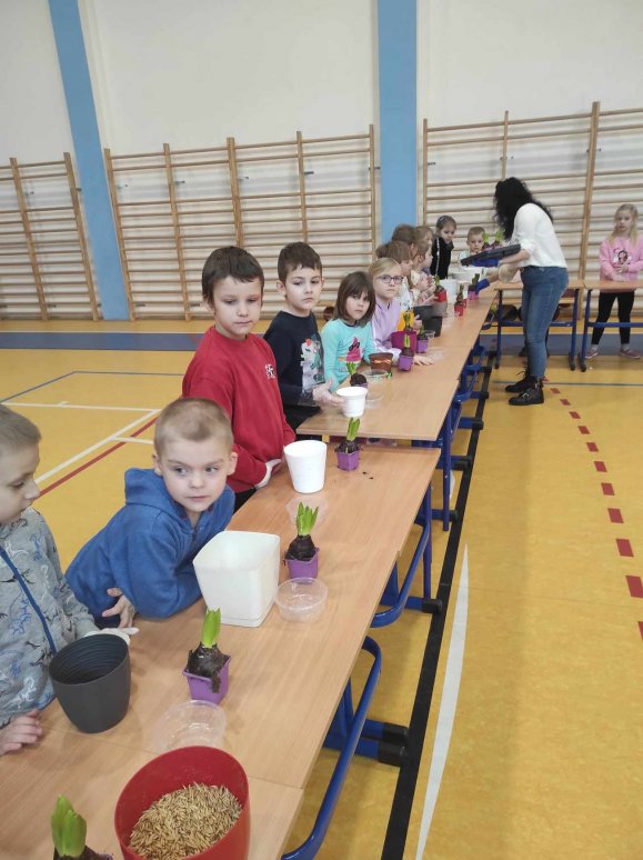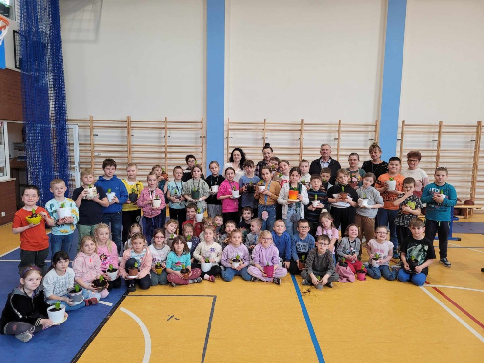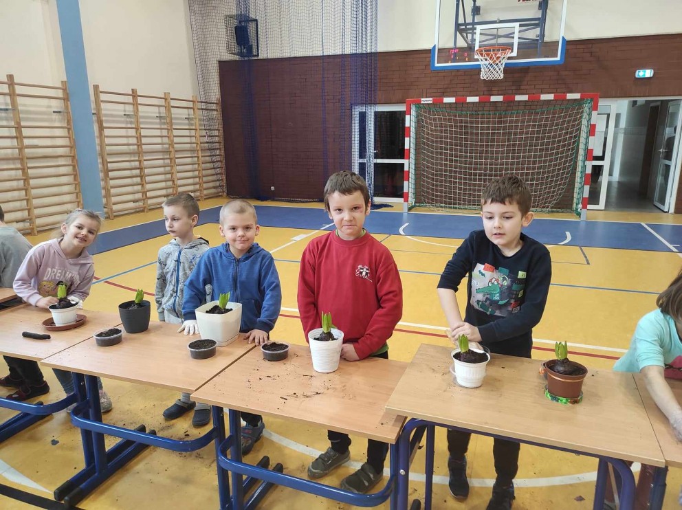 20 marca odbyły się w naszej szkole warsztaty ogrodniczo-florystyczne dla uczniów klas 0-III. Celem spotkania było zapoznanie z zawodem ogrodnika oraz poznanie technik układania kompozycji z różnorodnych materiałów. Zajęcia przeprowadził ogrodnik pan Władysław Szulc wraz z florystką panią Agnieszką Konczalską. Warsztaty rozpoczęły się częścią teoretyczną, w której pan Władysław opowiedział zgromadzonym jak uprawiać zdrowe rośliny, jak je chronić, jak o nie dbać. Wyjaśnił, dlaczego należy obcinać pędy. Uświadomił, że naturalne nawozy i opryski są niezbędne do prawidłowej uprawy roślin. Wymienił nazwy najpopularniejszych szkodników, które atakują rośliny. Następnie głos zabrała pani Agnieszka, która przedstawiła charakter swojej pracy, który polega na tym, że trzeba wykazać się znajomością różnych rodzajów kwiatów ciętych i doniczkowych. Wymieniła dodatki, które można wykorzystać przy tworzeniu bukietów. Opowiedziała, w jaki sposób dbać o kwiaty. Jak często należy je odżywiać. Uświadomiła, że rośliny należy nie tylko podlewać, ale również chronić przed trudnymi warunkami atmosferycznymi. Po części teoretycznej wszyscy zgromadzeni przystąpili do części praktycznej, która rozpoczęła się sadzeniem cebulek hiacyntów do doniczek. Następnie dzieci siały owies, który będzie piękną ozdobą wielkanocnego stołu. Po wykonanej pracy oglądały kwiaty doniczkowe i cięte. Porównywały ich wygląd, zapach, określały nazwę. Pani Agnieszka pokazała najpiękniejsze kwiaty wiosenne. Dzięki tym warsztatom dzieci miały kontakt z żywymi kwiatami, materiałami florystycznymi jak również możliwość rozwoju kreatywności, umiejętności manualnych, które są również ważne dla późniejszego rozwoju osobowości dziecka. Na zakończenie uczniowie wspólnie z florystką wykonały piękny bukiet, który został złożony na ręce pani dyrektor Bożeny Greli przez pana Władysława Szulca. Składamy serdeczne podziękowania za przeprowadzone warsztaty. Za doniczki, sadzonki, ziemię i inne materiały, które zostały podarowane przez Sklep Ogrodniczy Jakub. Dziękujemy za poświęcony nam czas oraz fachowe porady.