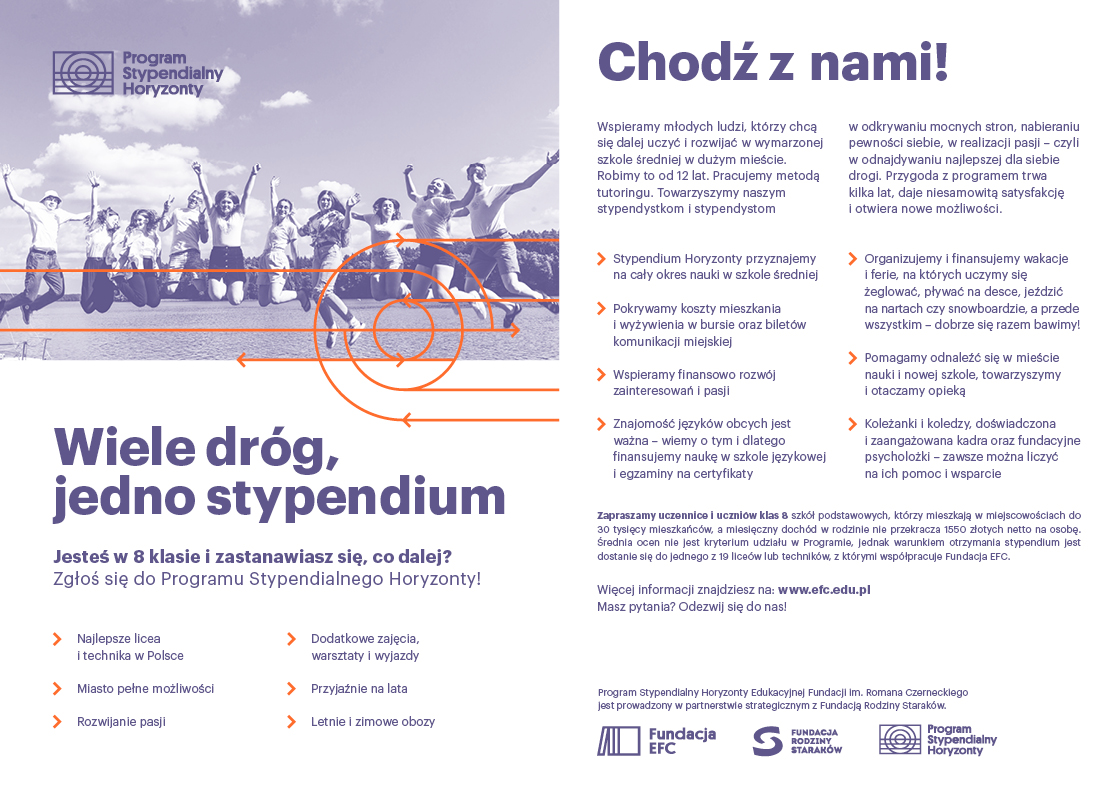 Jeżeli osiągasz dobre wyniki w nauce, chcesz się dalej rozwijać i poznać przyjaciół na całe życie – zgłoś się do Programu Stypendialnego Horyzonty! To szansa na naukę w najciekawszych liceach i technikach w Polsce. Stypendium przyznawane jest na cały okres nauki w szkole średniej. Zapraszamy uczniów klas 8 szkół podstawowych, którzy mieszkają w miejscowościach do 30 tysięcy mieszkańców, a miesięczny dochód w rodzinie nie przekracza 1700 złotych netto na osobę. Średnia ocen nie jest kryterium udziału w Programie, jednak wyniki w nauce powinny wskazywać na możliwość dostania się do jednej ze szkół partnerskich Fundacji EFC. Rekrutacja startuje 15 lutego i trwa do 31 marca! Więcej informacji znajduje się na stronie internetowej Fundacji EFC: https://efc.edu.pl/programy/horyzonty, na Instagramie i TikToku: @stypendium_horyzonty.W razie pytań zachęcamy do kontaktu z Elżbietą Brodą, ebroda@efc.edu.pl, tel.: 696 647 505 która pozostaje do Państwa dyspozycji w razie dodatkowych pytań. Fundacja EFC od 13 lat wspiera dzieci, młodzież i nauczycieli w równym dostępie do rzetelnej i jakościowej edukacji. Wzmacnia szkoły w tworzeniu przyjaznego środowiska do wszechstronnego rozwoju. Promuje postawy zaangażowania społecznego i filantropii. To jedna z największych fundacji rodzinnych w Polsce. Utworzona przez polskiego biznesmena i filantropa – Andrzeja Czerneckiego, obecnie zarządzana jest przez jego synów – Igora i Andrzeja Czerneckich. Do tej pory Program Stypendialny Horyzonty wsparł edukację blisko tysiąca uczniów i uczennic. Obecnie ponad 200 stypendystów i stypendystek uczy się w 18 szkołach średnich w całej Polsce. Program prowadzony jest w partnerstwie z Fundacją Rodziny Staraków.