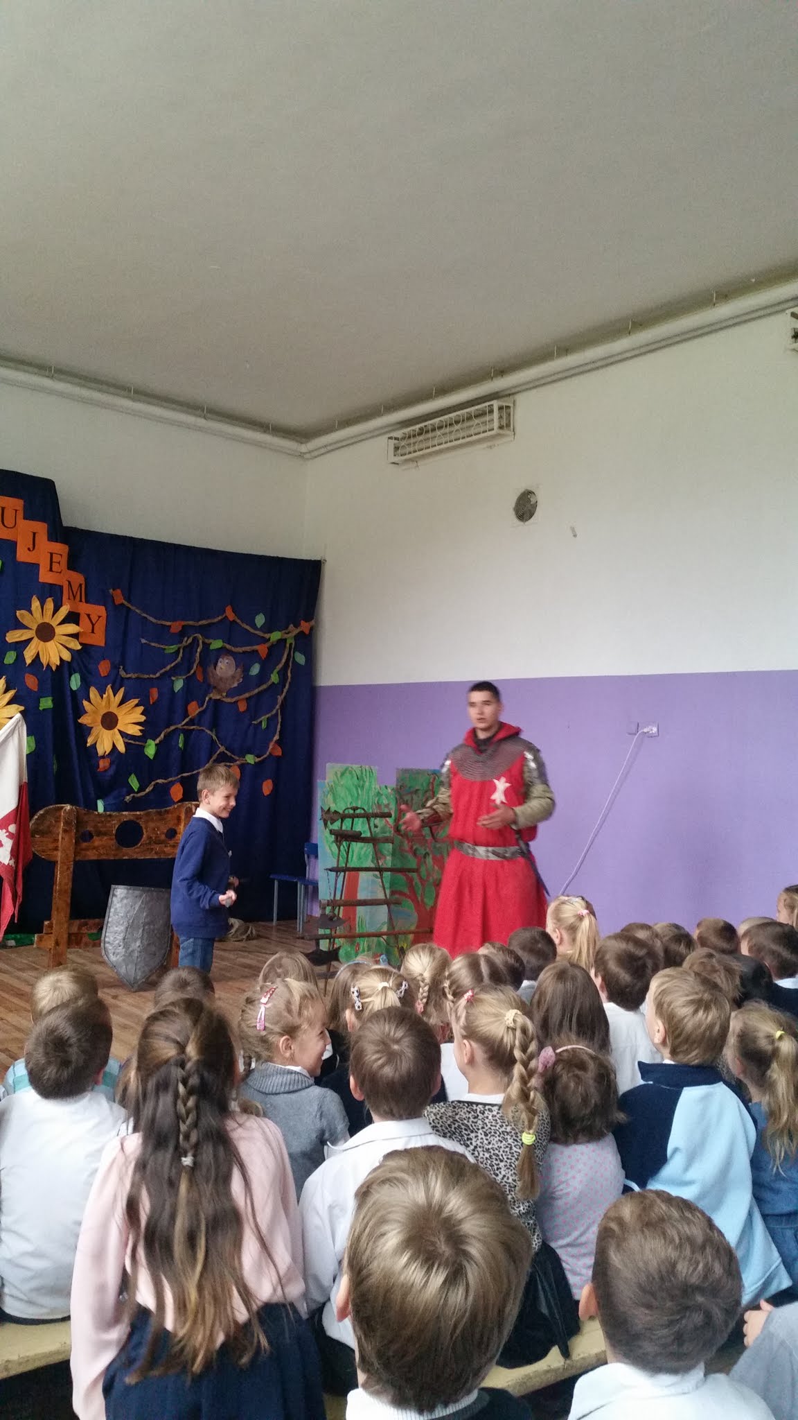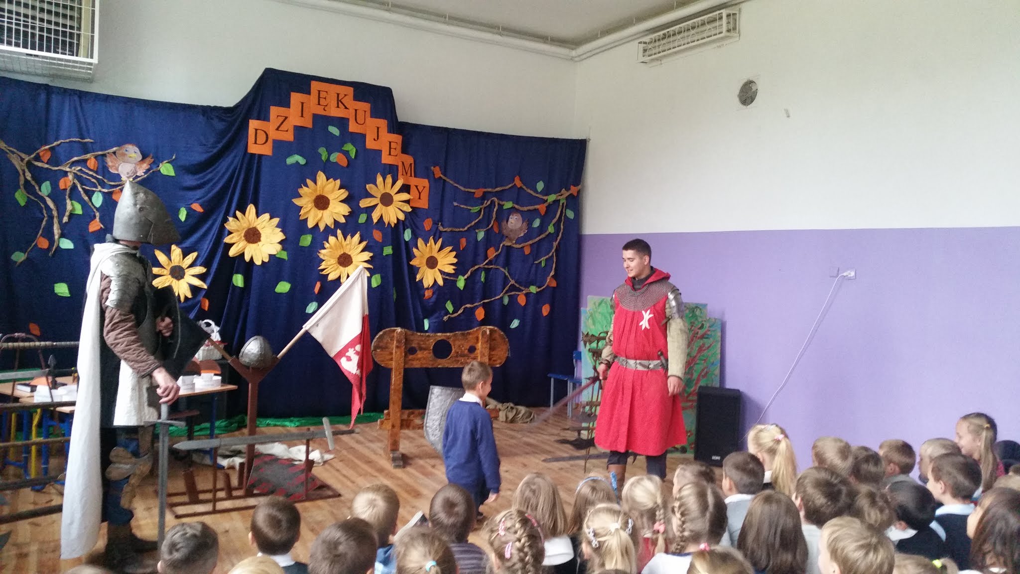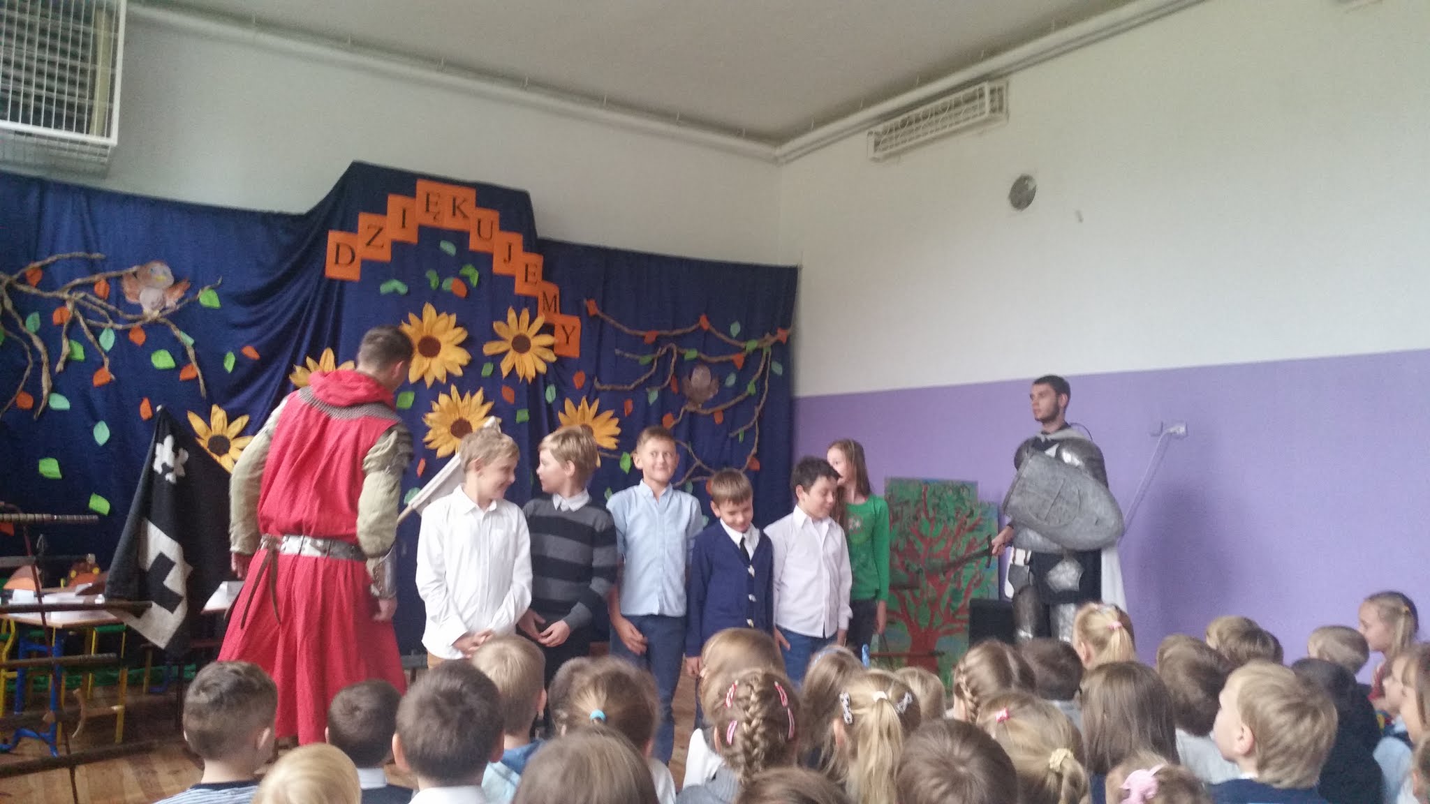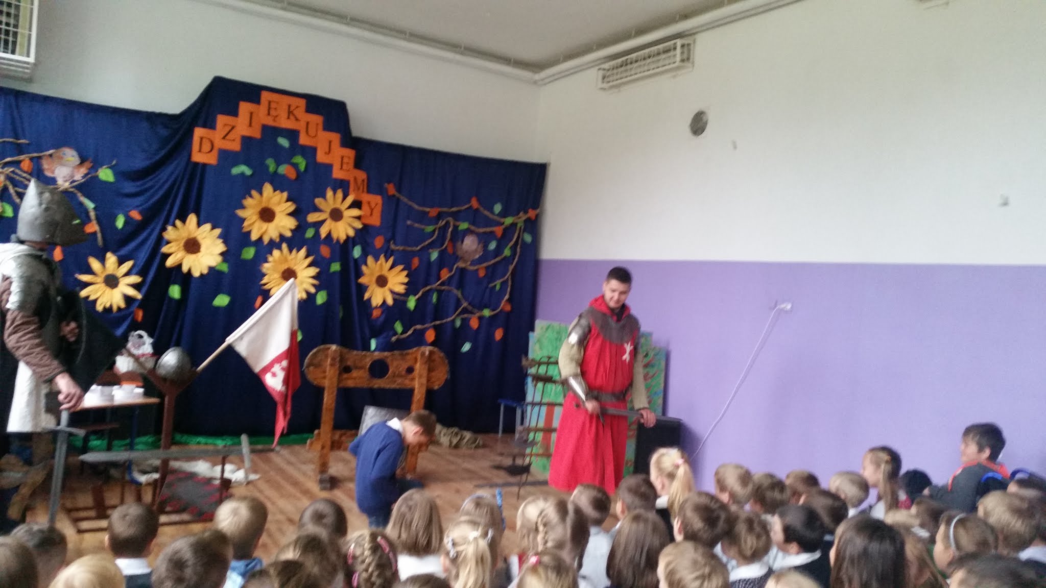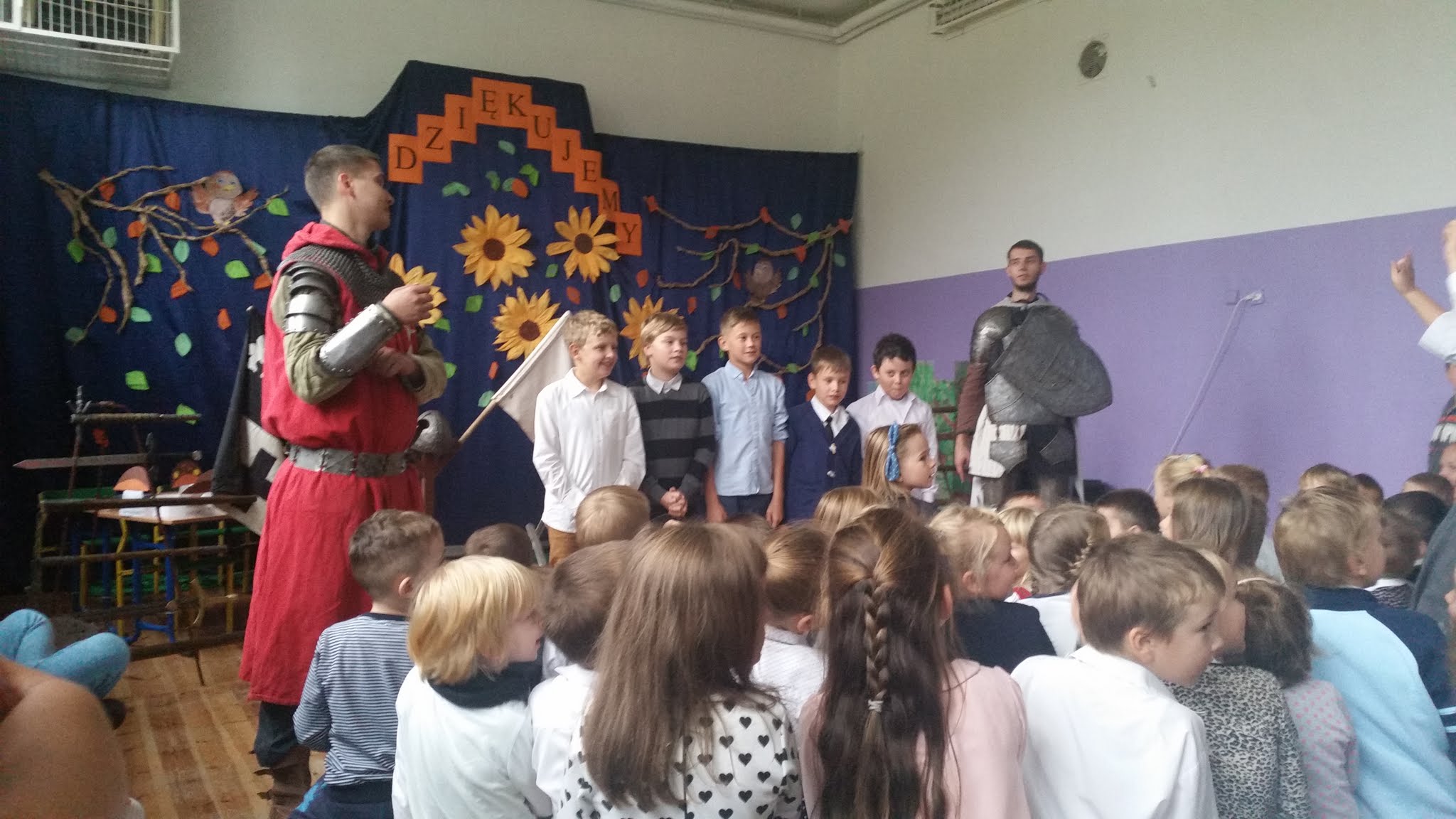 Naszą szkołę odwiedziła grupa artystyczna Rekonstrukto. Celem wizyty było przedstawienie życia rycerzy w czasach średniowiecza. Uczniowie mieli okazję na własne oczy zobaczyć prawdziwą zbroję, broń rycerską, a także narzędzia tortur takie jak dyby. Każdy uczeń mógł dotknąć i wypróbować wszystkich eksponatów. Ponadto uczniowie dowiedzieli się jakie prawa i obowiązki miał każdy rycerz. Na zakończenie odbyła się walka ucznia kl. V z rycerzem, którą wygrał oczywiście nasz uczeń. Dziękujemy za wizytę.