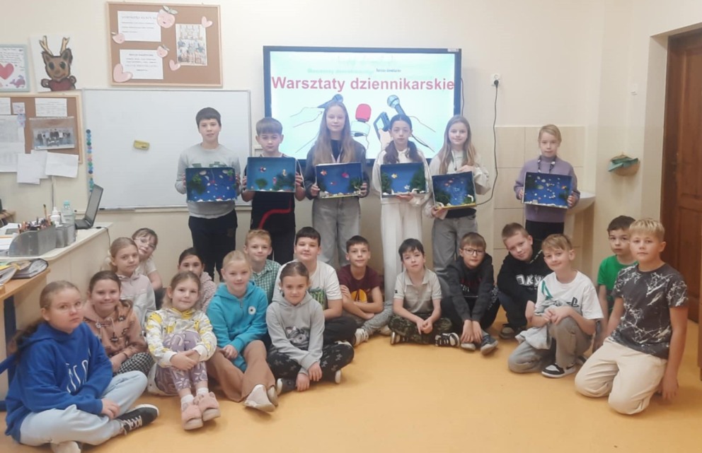 31 października odbyła się lekcja koleżeńska, którą przeprowadzili uczniowie klasy IV, którzy uczęszczają na warsztaty dziennikarskie. Czwartoklasiści w składzie: Magdalena Hinz, Oliwia Bydłos, Cezary Cieczko, Zofia Krzepicka, Wojciech Kamiński oraz Anna Rutkowska wykonali z surowców wtórnych akwaria, w których znalazły się: muszelki, kamyki, perełki i przeróżne roślinki. Nie zabrakło też ryb, krabów, ośmiornic i innych zwierzątek. Każdy uczeń zaprezentował swoją pracę i opowiedział jej historię. Były wzmianki o rycerzach zamienionych w kraby, złej czarownicy, która mieszka na dnie akwarium, czarodziejskich muszelkach. Pojawiła się nawet Lampa Alladyna i potężny Dżin. Trzecioklasiści z wielkim zainteresowaniem słuchali akwariowych opowieści. Każda z nich została nagrodzona gromkimi brawami.