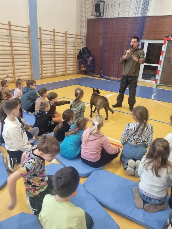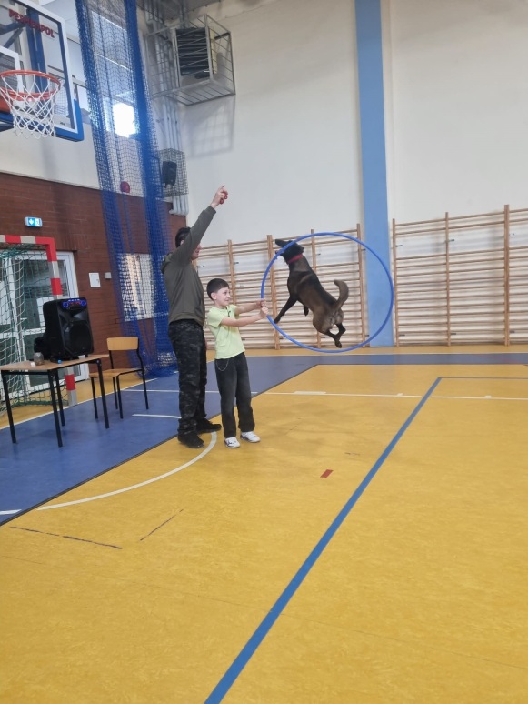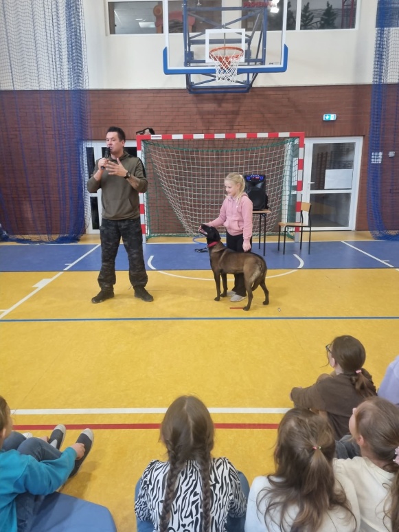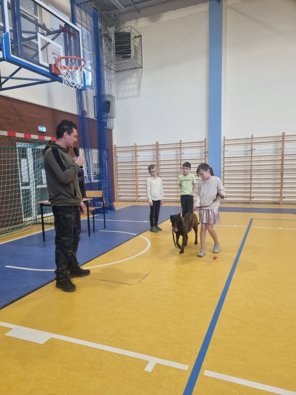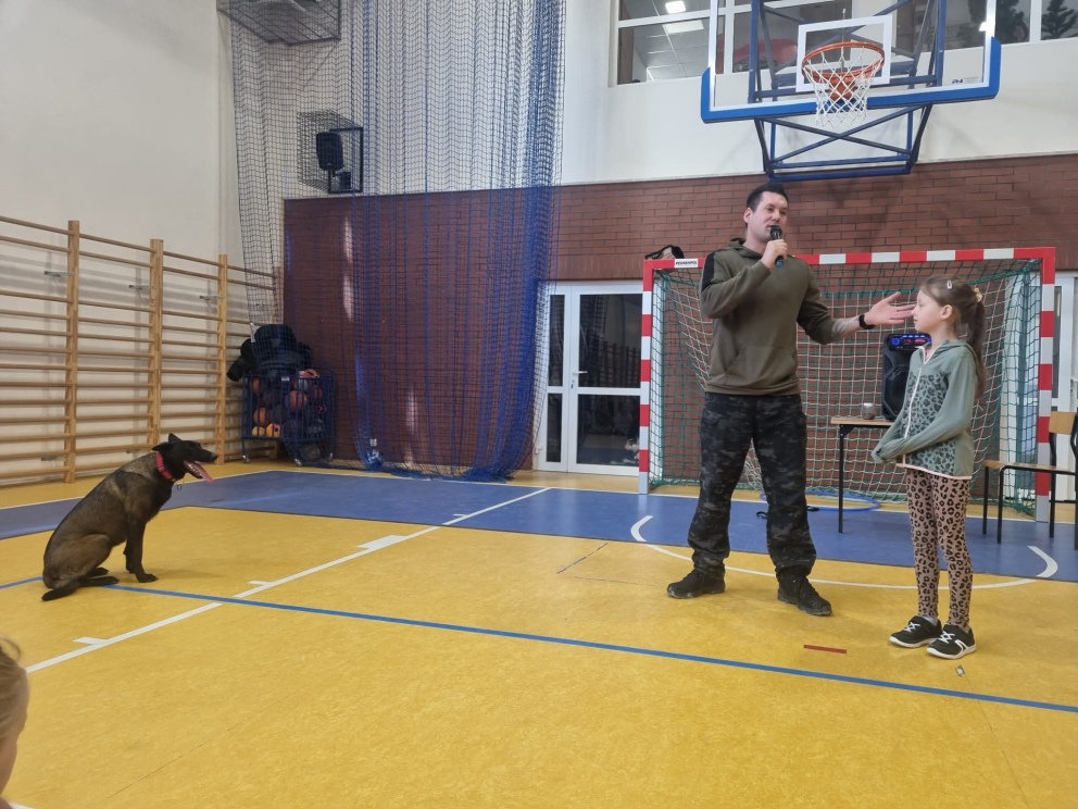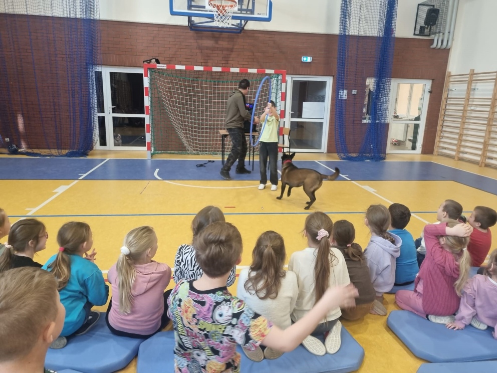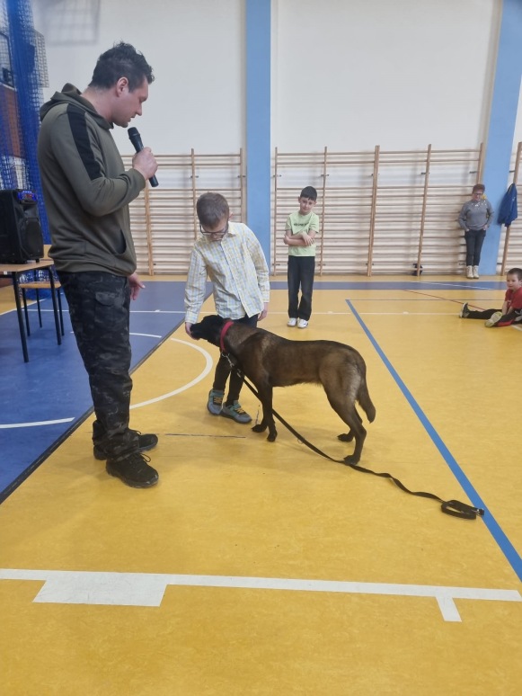 2 marca odbyły się w naszej szkole warsztaty edukacyjno-szkoleniowe pod tytułem „Poznaj swojego psa”. Miały one na celu przybliżenie wiedzy na temat prawidłowej opieki nad psem, zrozumienia jego potrzeb oraz budowania bezpiecznej i odpowiedzialnej relacji człowiek–zwierzę. Zajęcia łączyły część teoretyczną z praktycznymi pokazami, co pozwoliło uczestnikom w przystępny sposób poszerzyć swoje kompetencje i świadomość dotyczącą zachowań psów. Podczas warsztatów omówiono podstawowe potrzeby psa, takie jak potrzeba ruchu, odpoczynku, bezpieczeństwa oraz odpowiedniej diety. Zwrócono uwagę, że niezaspokojone potrzeby mogą prowadzić do frustracji, problemów behawioralnych oraz trudności w relacji z opiekunem. Uczestnicy dowiedzieli się, jak dostosować codzienną opiekę do wieku, rasy i temperamentu psa. Istotnym elementem zajęć była nauka rozpoznawania sygnałów wysyłanych przez psy. Omówiono mowę ciała, mimikę, postawę ogona i uszu oraz znaczenie dźwięków wydawanych przez psa. Podkreślono, że umiejętność prawidłowego odczytywania sygnałów ostrzegawczych pozwala zapobiegać niebezpiecznym sytuacjom i konfliktom. W części poświęconej behawioryzmowi wyjaśniono, czym jest zachowanie psa i jakie czynniki wpływają na jego kształtowanie. Przedstawiono znaczenie konsekwencji, wzmocnień pozytywnych oraz budowania relacji opartej na zaufaniu. Uczestnicy poznali przykłady najczęstszych problemów behawioralnych oraz sposoby ich ograniczania. Dużym zainteresowaniem cieszył się blok tematyczny dotyczący psów pracujących w służbach. Uczestnicy mieli okazję poznać rolę psów policyjnych, ratowniczych oraz terapeutycznych. Omówiono ich zadania, proces szkolenia oraz znaczenie tych zwierząt w działaniach na rzecz bezpieczeństwa i pomocy ludziom. Integralną częścią warsztatów był pokaz umiejętności psów, podczas którego zaprezentowano wykonywanie komend, elementy posłuszeństwa oraz współpracę psa z przewodnikiem. Pokaz ten unaocznił, jak ważna jest systematyczna praca, cierpliwość i pozytywna motywacja w procesie szkolenia. Uczestnicy poznali podstawowe zasady szkolenia psów, takie jak regularność ćwiczeń, stopniowanie trudności oraz nagradzanie pożądanych zachowań. Podkreślono, że szkolenie powinno być dostosowane do możliwości psa i prowadzone w atmosferze spokoju i bezpieczeństwa. Ważnym elementem warsztatów była część poświęcona bezpieczeństwu. Omówiono zasady postępowania w sytuacji zagrożenia atakiem psa. Zwrócono uwagę, aby: